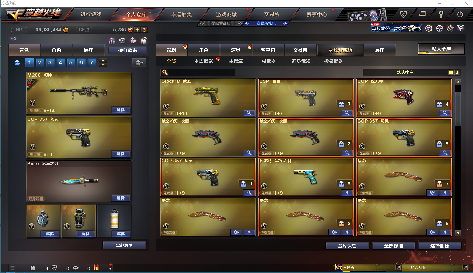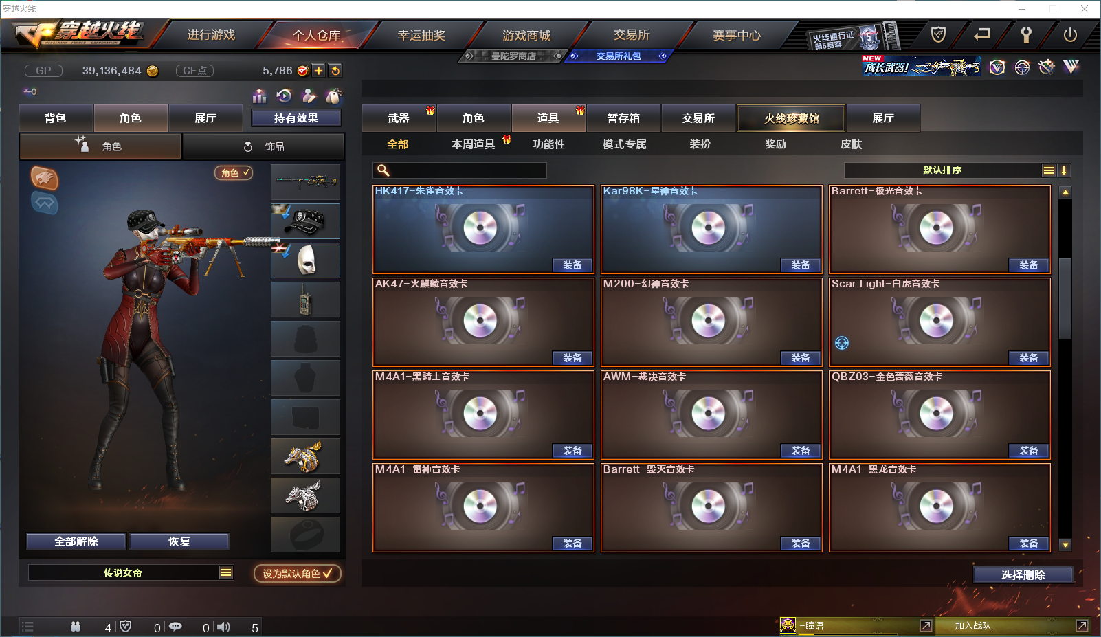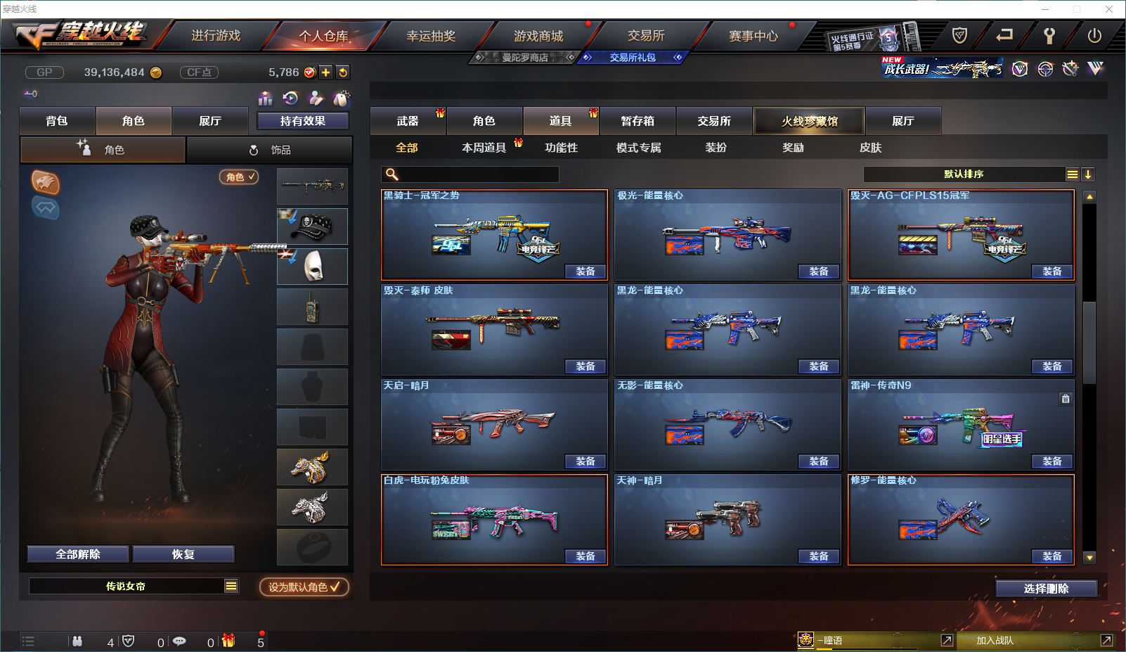 161v-传说女帝-幻神-幻神宠儿-幻神n9-幻神周瑜-幻神巅峰荣耀-幻神黄忠-幻神音效卡-星神-星神破竹-星神音效卡-传说辉光-冠军之特-冠军之刃 【步枪】 朱雀-白虎-雷暴-堕天神-夜魔-幻灵-玄武-qbz金色蔷薇-白虎电玩蓝兔 【狙】 天龙-毁灭-极光-裁决-幻神-星神 【手枪】 修罗-天神-usp雷暴-cop堕天神-cop幻灵-冠军之特 【刀】 屠龙-龙啸-擎天-斩神刀雷暴-麒麟刺堕天神-龙啸堕天神-王者之击-王者之刺 【角色】 传说女帝-迷迭香-王者春-王者瞳闭月羞花-鹰-影豹- 【音效卡】 朱雀音效卡-星神音效卡-极光音效卡-火麒麟音效卡-幻神音效卡-白虎音效卡-黑骑士音效卡-裁决音效卡-qbz音效卡-雷神音效卡-毁灭音效卡-黑龙音效卡 【皮肤】 荣耀之魄臻藏-冠军之薇-地狱火-冠军之势-毁灭AG-雷神n9-白虎粉兔-战神赵云-雷神宠儿-毁灭绿豆-荣耀之魄-荣耀之锋-黑龙墨子;USP-雷暴,柯尔特-冠军之特,Knife-冠军之刃,传说女帝,QBZ03-金色蔷薇,M200-幻神,Scar Light-白虎,