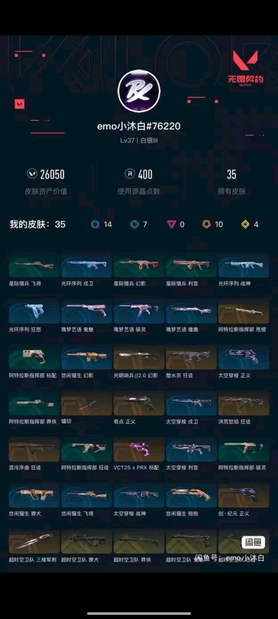 郑重声明: 本账号经过江苏省南京市公安局六合分局网络财产备案,一经发现直接报警处理立案追责,根据账号价值全额赔偿。【苏ICP备082******-2】 该帐号已备案义父请不要挂机超时了请打完再下线也不要骂人开挂不然我会拉黑的,如发现游戏禁言被封等问题,足以构成犯罪并追究其法律责任!平台方会配合警方协助调查向平台索要下单ip、充值记录、支付充值记录、手机号找到本人起诉到法院追回账号损失,根据《**XXXXX刑法》第二百七十五条故意毁坏财产物罪:故意毁坏公私财物,数额较大或有其他严重情节,处罚三年以下有期徒刑,拘留或者罚金。 1.登陆界面稍等2分钟会上去(自动登录)老板不要着急,一次不行多来几次wegame界面要耐心等2分钟 2.密令会自动输入如果一次不成功多来几次 3..进入wegame后到弹短信验证处,关闭掉,重新下载无畏契约这个游戏即可成功上号,记住。这个方法百分百上号成功!就是进入wegame重新下载无畏契约游戏 !!!百分百成功!! 4.到时请及时续租不要挂机,导致禁赛的一律拉黑 5.祝老板玩的愉快,喜欢可以收藏关注;镭切,洪荒怒焰 狂徒,混沌序曲 狂徒,塑水宗 狂徒,奇点 正义,