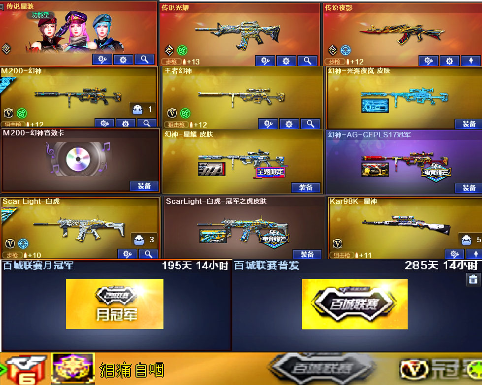 【限量888光海夜岚幻神皮肤+绝版5幻兽套+传说星骇+神秘礼盒+百城月冠名片238天+裁决4皮带卡+冠军之虎+宙斯权杖+跳跳鲨】其他不过多介绍 自己看图;USP-雷暴,柯尔特-荣耀世冠白鲨2023,传说星骇,RPK-盘龙,QBZ03-金色蔷薇,M200-幻神,Scar Light-白虎,