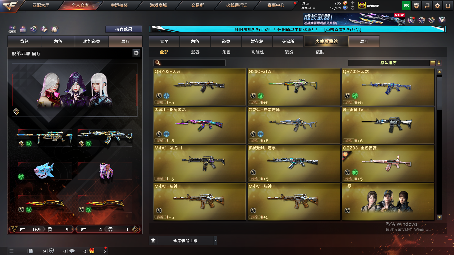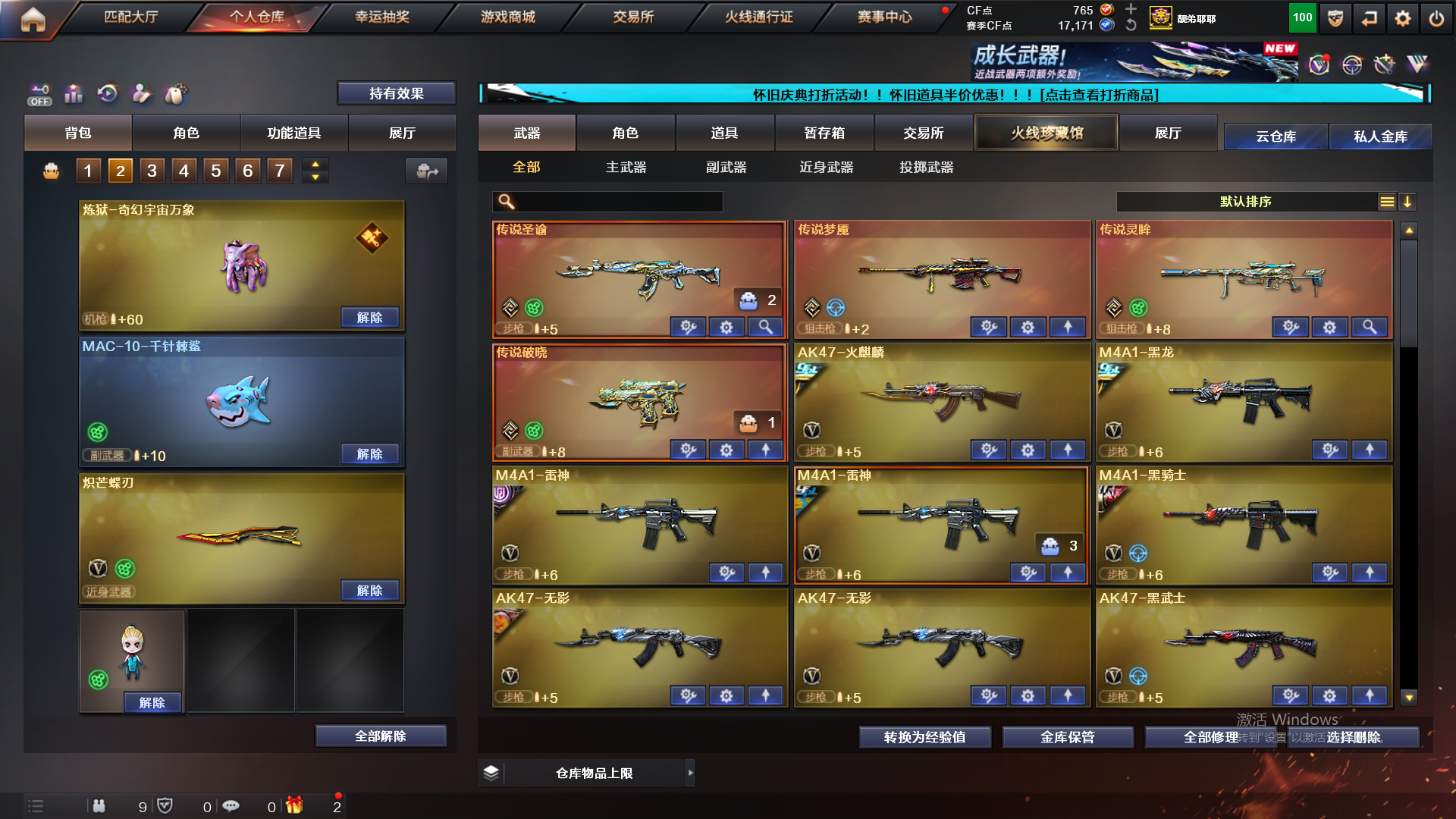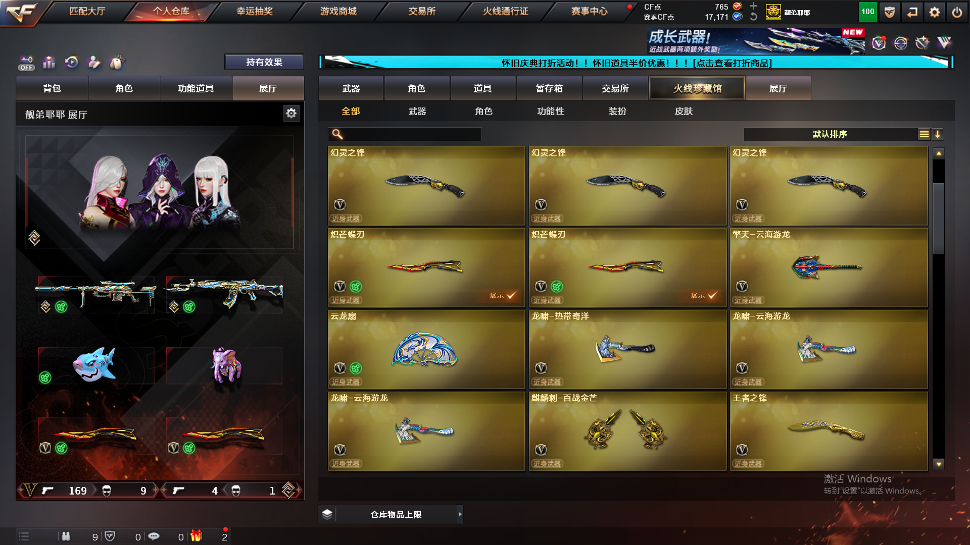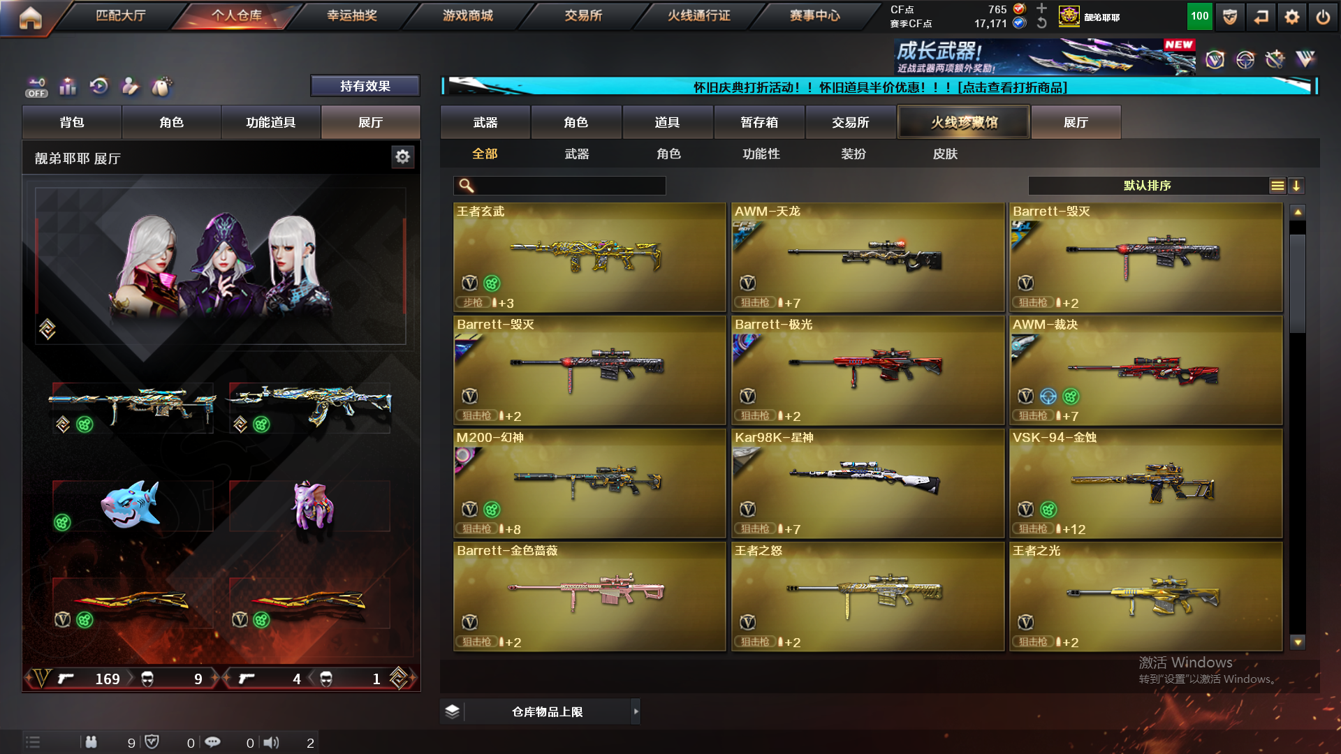 -生化爆破极品 传说影煞 传说圣谕 传说破晓 奇幻泡泡象 mac鲨鱼 双炽芒蝶刃 双玄武 满配副武器 音效卡;USP-雷暴,柯尔特-无冕之王,柯尔特-冠军之特,炽芒蝶刃,Knife-冠军之刃,传说影煞,隼,