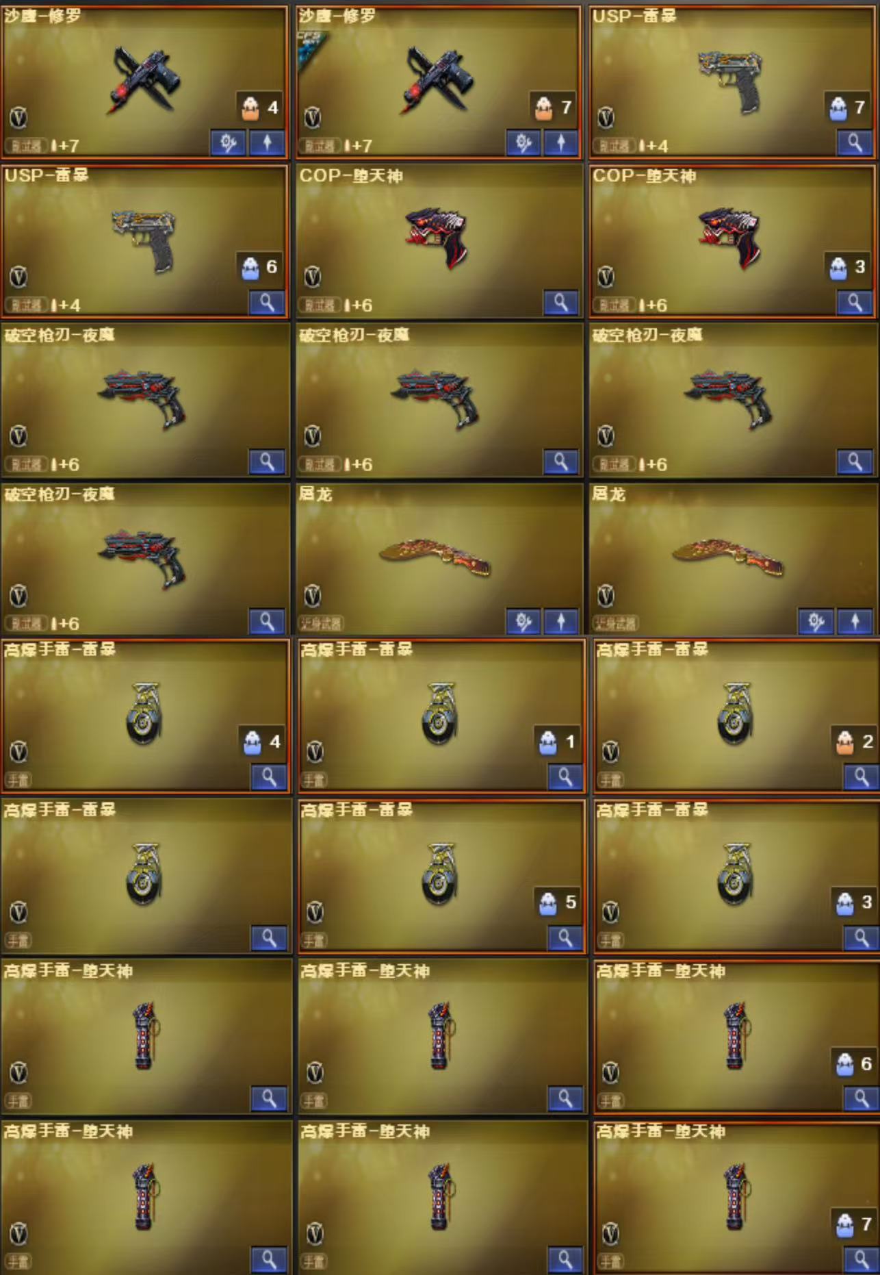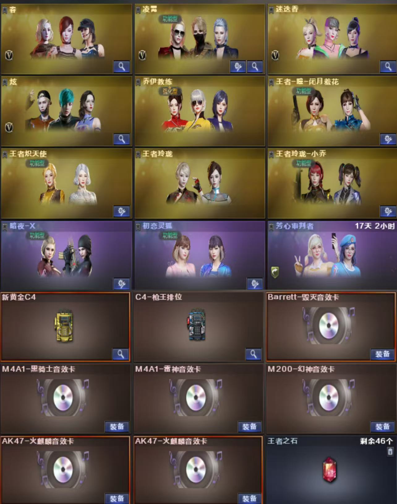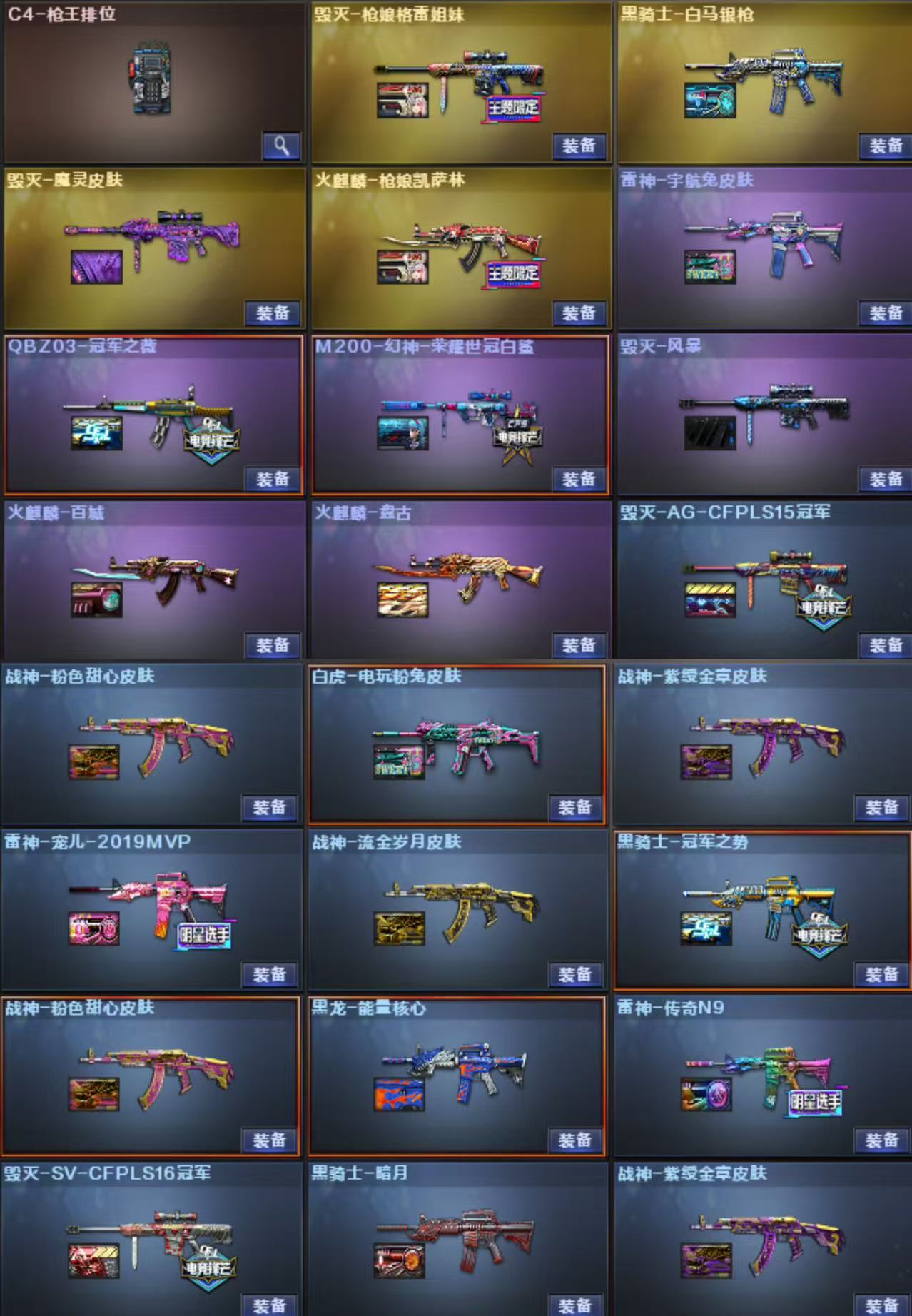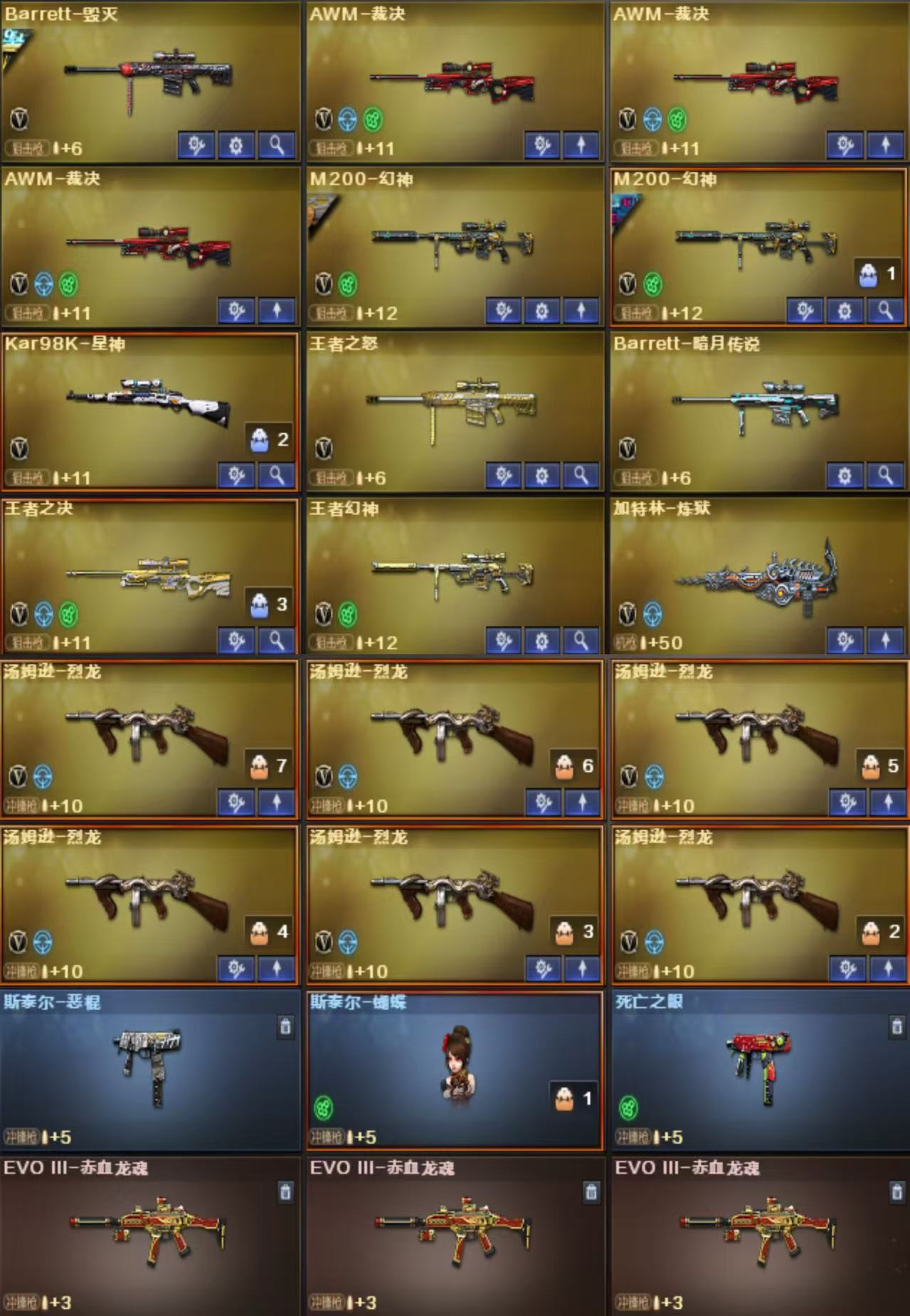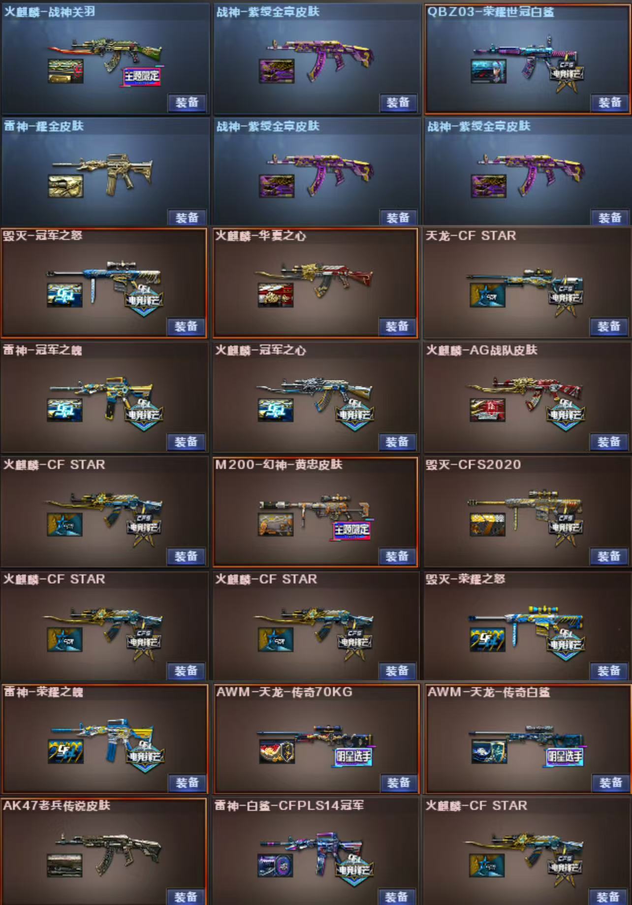M200-幻神X2 王者幻神 98K星神 传说光耀 USP雷暴X2 COP堕天神X2 雷暴套X7 堕天神套X7 夜魔套X7 神工天巧X1 烈龙X6+斯泰尔蝴蝶 白虎 QBZ金色蔷薇 各种王者枪械 皮肤:幻神荣耀世冠白鲨 幻神黄忠 QBZ荣耀世冠白鲨 QBZ冠军之薇 白虎电玩粉兔 雷神荣耀之魄 雷神宠儿 雷神冠军之魄 雷神传奇N9 雷神白鲨冠军 雷神耀金 火麒麟冠军之心 火麒麟枪娘凯萨琳 火麒麟盘古 火麒麟传奇EVEN 火麒麟战神关羽 火麒麟华夏之心 火麒麟AG 毁灭枪娘格雷姐妹 毁灭冠军之怒 毁灭荣耀之怒 毁灭AG冠军 毁灭SV冠军 毁灭CFS2020 黑骑士冠军之势 黑骑士耀金 人物:王者炽天使 王者玲珑 王者玲珑小乔 王者瞳闭月羞花 王者零传说之路 迷迭香 凌霄 春 炫 女主播 灵狐者职业经理 道具:幻神音效卡 毁灭音效卡 雷神音效卡 火麒麟音效卡X2 黑骑士音效卡 EP炫彩背包 BS炫彩背包 EDG炫彩背包 虎牙炫彩背包 玩偶X17 击杀图标X8;USP-雷暴,QBZ03-金色蔷薇,M200-幻神,Scar Light-白虎,Kar98K-星神,