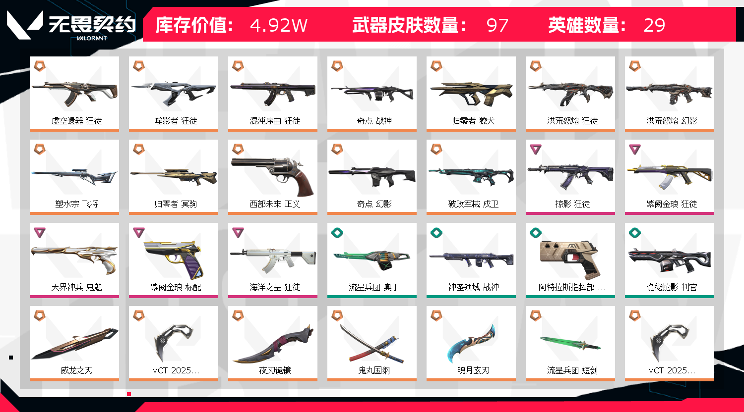 可排位⭐5w库存⭐混沌狂徒⭐Vct25爪刀⭐威龙之刃⭐太刀⭐西部正义⭐紫金狂徒⭐归零大狙⭐;奇点 战神,威龙之刃,VCT 2025 爪刀,归零者 獠犬,虚空遗器 狂徒,洪荒怒焰 狂徒,噬影者 狂徒,
