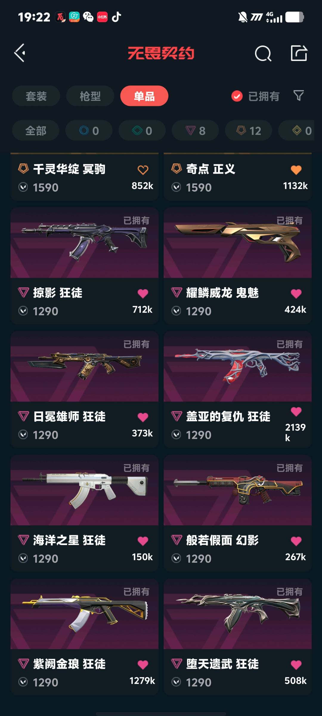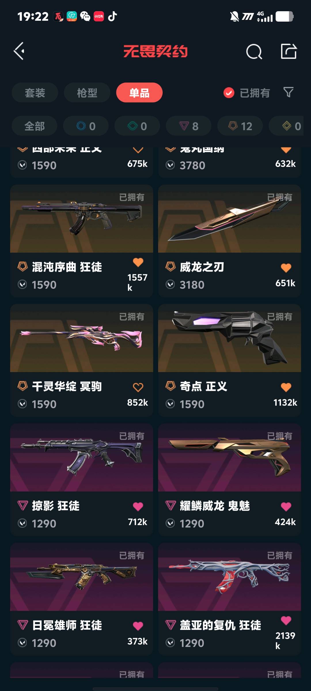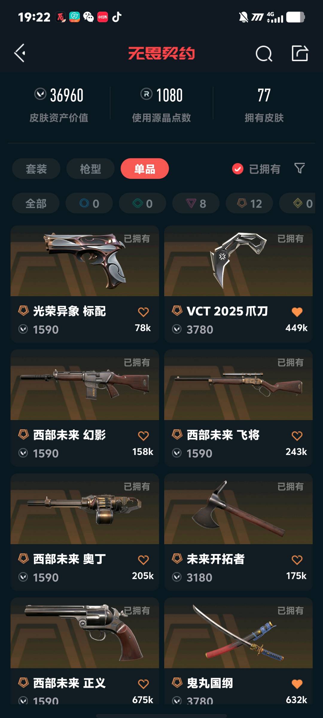八把主流狂徒三幻神都有,两把幻影手感不赖 西部一整套,太刀,vct爪刀,龙刀各种模组的刀 奇点正义神中神,西部正义,可以排位;西部未来 奥丁,威龙之刃,VCT 2025 爪刀,盖亚的复仇 狂徒,掠影 狂徒,紫阙金琅 狂徒,堕天遗武 狂徒,