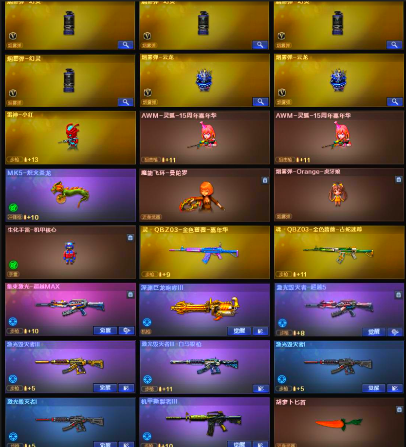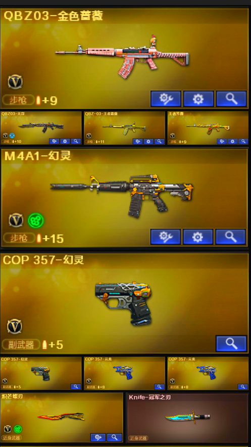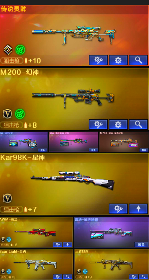 传说灵眸4防隼4防影豹4防荒漠琉璃4防关小雨4防岚兮儿6烈龙5盘龙炼狱蝴蝶刀炽火炎龙4COP幻神(冠军之幻/电流骇客)星神白虎QBZ;炽芒蝶刃,Knife-冠军之刃,隼,RPK-盘龙,QBZ03-金色蔷薇,M200-幻神,Scar Light-白虎,