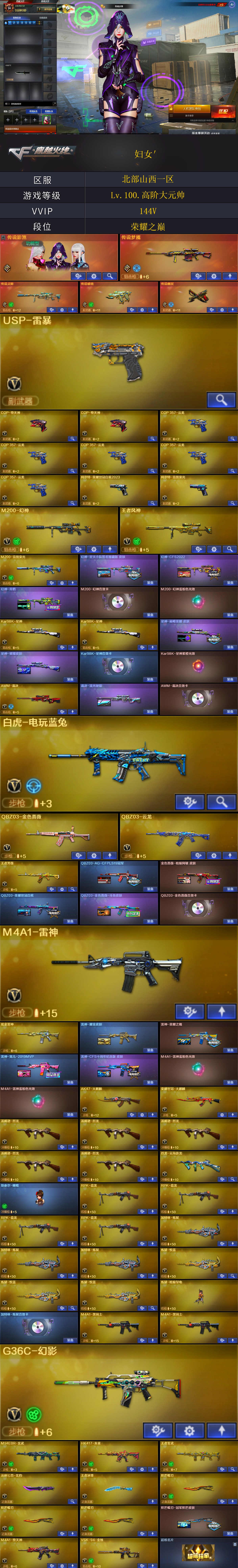 稀有武器】:传说梦魇/传说灵眸/传说破晓/传说幽冥/M200-幻神/Kar98K-星神(2)/VSK-94-金蚀/G36C-幻影/M14EBR-玄武/HK417-朱雀/M4A1-堕天神/USP-雷暴/COP-堕天神(2)/柯尔特-竞技荣光/天神-动感闪耀/COP357-云龙(5)/柯尔特-荣耀世冠白鲨2023/QBZ03-云龙/QBZ03-金色蔷薇/AK47-火麒麟(2)/M4A1-雷神(2)/M4A1-黑骑士(2)/荣耀世冠-火麒麟/白虎-电玩蓝兔/Barrett-毁灭/Barrett-极光/AWM-裁决/M200-竞技荣光/RPK-盘龙(4)/加特林-炼狱(3)/汤姆逊-烈龙(5)/AA-12-雷霆/炽芒蝶刃(3)/麒麟刺-堕天神/龙啸-堕天神/马来剑-夜魔/擎天-竞技荣光/云龙扇 【王者武器】:王者芳薇-觉醒版/王者风神-觉醒版 【热门角色】:传说影煞/电竞教官-云悠悠/华/机械姬/鹰/雨棠/隼/奇洋探员/乔伊教练/王者-葵-貂蝉/王者潘多拉/炽天使/潘多拉-X/幽 【热门音效卡】:M200-幻神音效卡/Kar98K-星神音效卡/AWM-裁决音效卡/QBZ03-金色蔷薇音效卡/加特林-炼狱音效卡/M4A1-黑骑士音效卡 【热门皮肤】:幻神-星火小队签名臻藏版皮肤/幻神-CFS2022/幻神-青鹤/炼狱-末日审判皮肤/屠龙-星火燎原/QBZ03-金色蔷薇-斗鱼皮肤/炼狱-夏佐皮肤/星神-巅峰荣耀 皮肤/炼狱-电子连击皮肤/星神-璀璨皮肤/裁决-流光秘银/QBZ03-AG-CFPLS19冠军/QBZ03-荣耀世冠白鲨/雷神-宠儿-2019MVP/金色蔷薇-枪娘阿敏皮肤/毁灭-荣耀之怒/屠龙-春桃皮肤/炽芒蝶刃-冠军炽芒皮肤/雷神-荣耀之魄 【其他亮点】:斯泰尔-蝴蝶/炼狱-枪娘掣电/MK5-炽火炎龙/金刚伞-电玩红兔/超核名片 (截图展示段位不代表实际段位,如赛季更新等不可抗拒因素发生变化,其余道具看截图或咨询客服);USP-雷暴,柯尔特-荣耀世冠白鲨2023,传说幽冥,炽芒蝶刃,传说影煞,隼,电竞教官-云悠悠,