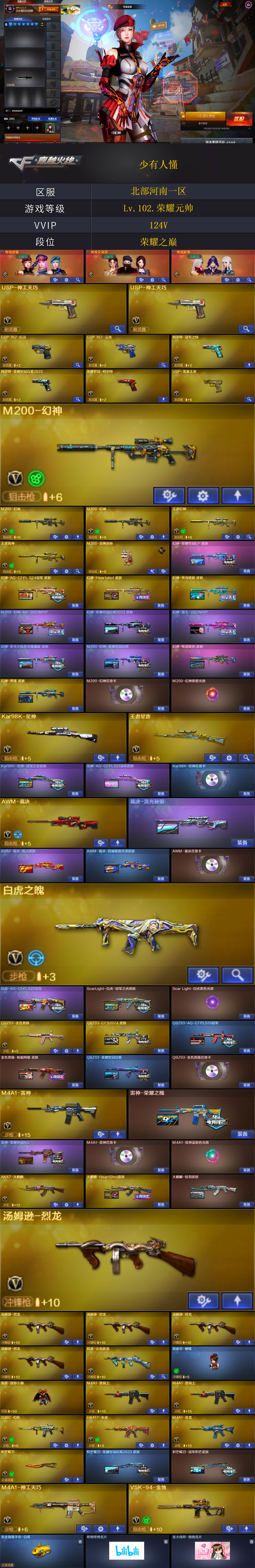 【商品标题】:北部河南一区-124V-可二次实名-【Lv.102.荣耀元帅】-【段位:荣耀之巅】 【稀有武器】:M200-幻神(3)/Kar98K-星神/VSK-94-金蚀/G36C-幻影/M4A1-青龙/HK417-朱雀/M4A1-神工天巧/COP357-幻灵/USP-神工天巧(2)/天神-动感闪耀/COP357-云龙/柯尔特-荣耀世冠白鲨2023/修罗-古蛇迷踪/荣耀世冠-柯尔特/柯尔特-冠军之特/金色蔷薇-古蛇迷踪/QBZ03-金色蔷薇(2)/AK47-火麒麟/M4A1-黑龙/M4A1-雷神/M4A1-黑骑士(2)/AK47-无影/Barrett-毁灭(2)/Barrett-极光/AWM-裁决/汤姆逊-烈龙(5)/AA-12-雷霆/炽芒蝶刃/斩神刀-雷暴(2)/幻灵之锋/擎天-竞技荣光/唐刀-神工天巧/云龙扇 【王者武器】:白虎之魄-觉醒版/王者之光-觉醒版/王者幻神-觉醒版/王者风神-觉醒版/王者星霆 【热门角色】:传说艾莉莎/传说影煞/电竞教官-云悠悠/关小雨/兰-巾帼英雄/晴雅/影豹/雨墨/岚兮儿/奇洋探员/乔伊教练/蛇隐宗/王者潘多拉/王者晴雅/潘多拉-X/幽/潘多拉 【热门音效卡】:M200-幻神音效卡/Kar98K-星神音效卡/AWM-裁决音效卡/QBZ03-金色蔷薇音效卡/M4A1-雷神音效卡/Barrett-极光音效卡 【热门皮肤】:幻神-AG-CFPLS24冠军皮肤/幻神-Heartshot皮肤/幻神-传奇欧欧皮肤/M200-幻神-N9-2022MVP/幻神-荣耀世冠白鲨2023皮肤/幻神-宠儿-2021MVP/幻神-星火小队签名臻藏版皮肤/M200-幻神-荣耀世冠白鲨/幻神-电流骇客皮肤/幻神-曹操皮肤/QBZ03-CFS2024皮肤/火麒麟-HeartShot皮肤/屠龙-星火燎原/Kar98K-星神-冠军之星皮肤/雷神-荣耀世冠AG/擎天-冠军之击/裁决-流光秘银/白虎-AG-CFPLS20冠军/黑龙-冠军之武/QBZ03-AG-CFPLS19冠军/QBZ03-荣耀世冠白鲨/黑骑士-战神马超/炽芒蝶刃-荣耀世冠白鲨2023皮肤/ScarLight-白虎-冠军之虎皮肤/毁灭-SV-CFPLS16冠军/毁灭-冠军之怒/屠龙-荣耀之锋/金色蔷薇-枪娘阿敏皮肤/屠龙-春桃皮肤/炽芒蝶刃-冠军炽芒皮肤/雷神-荣耀之魄 【其他亮点】:斯泰尔-蝴蝶/炼狱-迷你小钢/M200-喜狮迎春/迷你律动酷熊/黄金猫猫手套-白鲨/烟雾弹-荣耀世冠白鲨2023/哔哩哔哩名片/哔哩哔哩名片 (截图展示段位不代表实际段位,如赛季更新等不可抗拒因素发生变化,其余道具看截图或咨询客服);柯尔特-无冕之王,USP-雷暴王者,荣耀世冠-柯尔特,柯尔特-荣耀世冠白鲨2023,柯尔特-冠军之特,炽芒蝶刃,传说影煞,