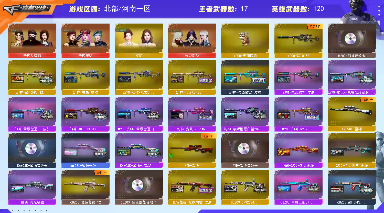 【商品标题】:北部河南一区-135V-可二次实名-【Lv.102.荣耀元帅】-【段位:枪王】 【稀有武器】:M200-幻神(3)/Kar98K-星神/VSK-94-金蚀/G36C-幻影/M4A1-青龙/HK417-朱雀/M4A1-神工天巧/COP357-幻灵/USP-神工天巧(2)/天神-动感闪耀/COP357-云龙/柯尔特-荣耀世冠白鲨2023/修罗-古蛇迷踪/荣耀世冠-柯尔特/柯尔特-冠军之特/金色蔷薇-古蛇迷踪/QBZ03-金色蔷薇(2)/AK47-火麒麟/M4A1-黑龙/M4A1-雷神(2)/M4A1-黑骑士(2)/AK47-无影/Barrett-毁灭(2)/Barrett-极光/AWM-裁决/汤姆逊-烈龙(5)/AA-12-雷霆/炽芒蝶刃/斩神刀-雷暴(2)/幻灵之锋/擎天-竞技荣光/唐刀-神工天巧/云龙扇 【王者武器】:白虎之魄-觉醒版/王者之光-觉醒版/王者幻神-觉醒版/王者风神-觉醒版/王者星霆 【热门角色】:传说艾莉莎/传说影煞/电竞教官-云悠悠/关小雨/兰-巾帼英雄/晴雅/影豹/雨墨/岚兮儿/奇洋探员/乔伊教练/蛇隐宗/王者潘多拉/王者晴雅/潘多拉-X/幽/潘多拉 【热门音效卡】:M200-幻神音效卡/Kar98K-星神音效卡/AWM-裁决音效卡/QBZ03-金色蔷薇音效卡/M4A1-雷神音效卡/Barrett-极光音效卡 【热门皮肤】:幻神-AG-CFPLS24冠军皮肤/幻神-Heartshot皮肤/幻神-传奇欧欧皮肤/M200-幻神-N9-2022MVP/幻神-荣耀世冠白鲨2023皮肤/幻神-宠儿-2021MVP/幻神-星火小队签名臻藏版皮肤/M200-幻神-荣耀世冠白鲨/幻神-AG-CFPLS17冠军/幻神-电流骇客皮肤/幻神-曹操皮肤/QBZ03-CFS2024皮肤/火麒麟-HeartShot皮肤/屠龙-星火燎原/Kar98K-星神-冠军之星皮肤/雷神-荣耀世冠AG/擎天-冠军之击/裁决-流光秘银/白虎-AG-CFPLS20冠军/黑龙-冠军之武/QBZ03-AG-CFPLS19冠军/屠龙-巅峰荣耀皮肤/QBZ03-荣耀世冠白鲨/黑骑士-战神马超/炽芒蝶刃-荣耀世冠白鲨2023皮肤/ScarLight-白虎-冠军之虎皮肤/毁灭-冠军之怒/屠龙-荣耀之锋/金色蔷薇-枪娘阿敏皮肤/屠龙-春桃皮肤/炽芒蝶刃-冠军炽芒皮肤/雷神-荣耀之魄 【其他亮点】:斯泰尔-蝴蝶/炼狱-迷你小钢/M200-喜狮迎春/迷你律动酷熊/黄金猫猫手套-白鲨/烟雾弹-荣耀世冠白鲨2023/哔哩哔哩名片/哔哩哔哩名片 (截图展示段位不代表实际段位,如赛季更新等不可抗拒因素发生变化,其余道具看截图或咨询客服);USP-雷暴王者,荣耀世冠-柯尔特,柯尔特-荣耀世冠白鲨2023,柯尔特-冠军之特,炽芒蝶刃,传说影煞,传说星骇,