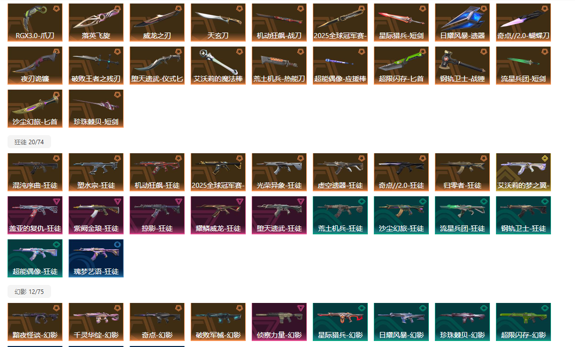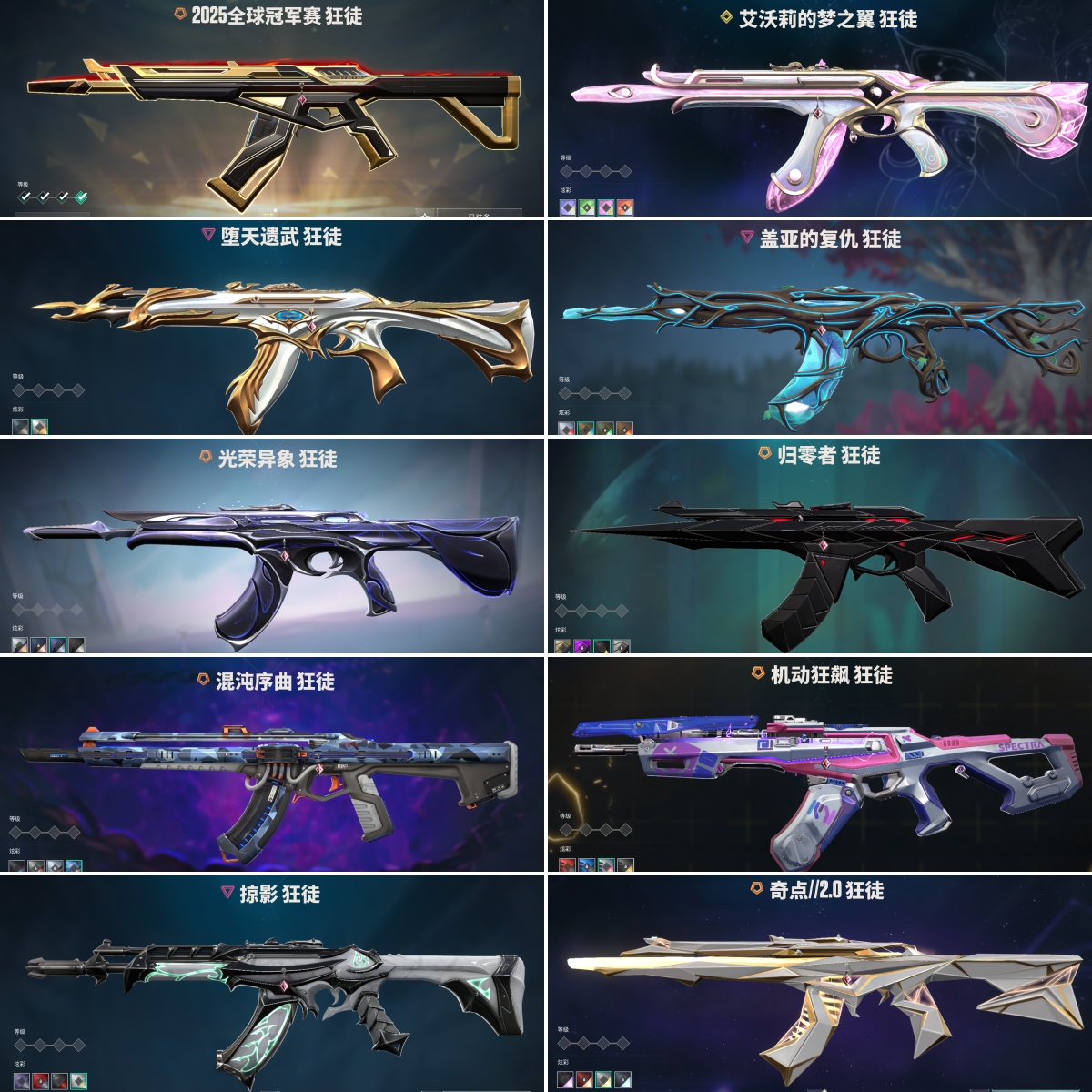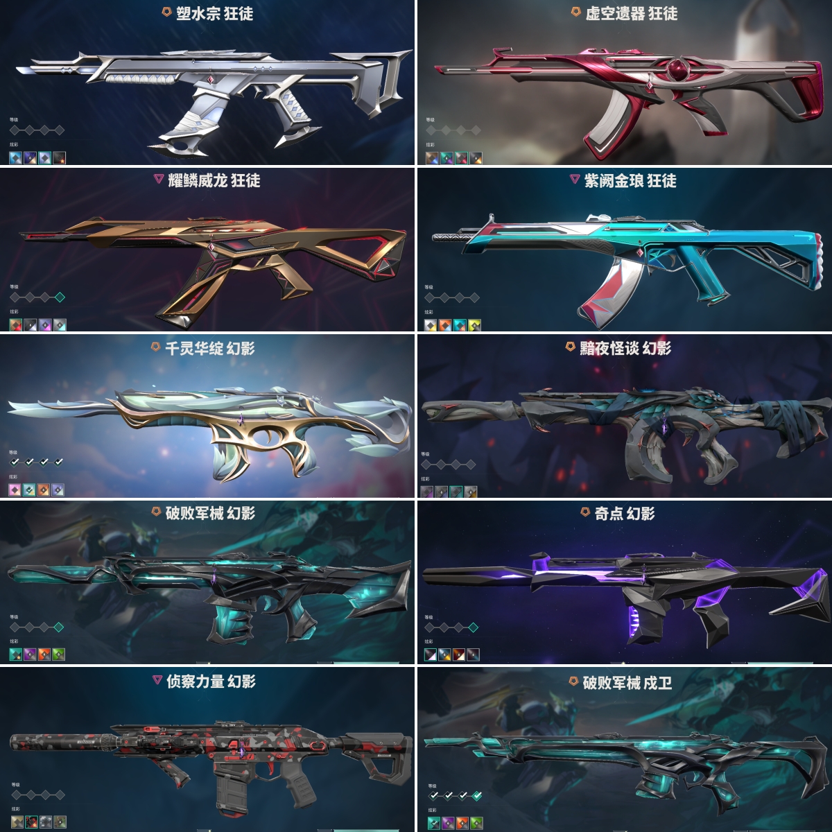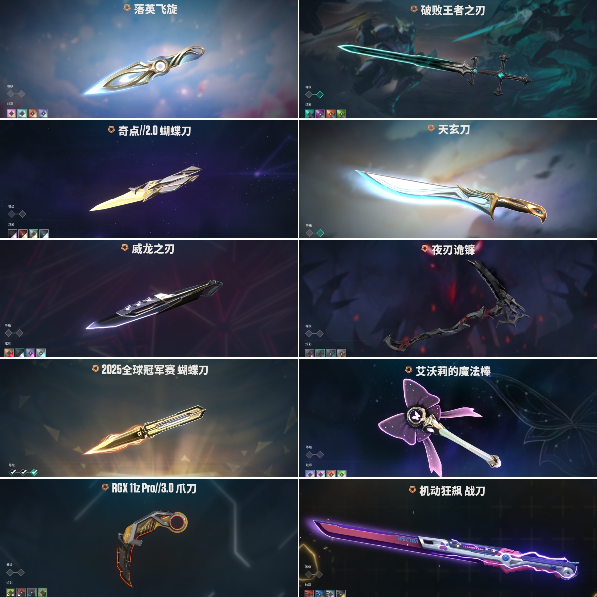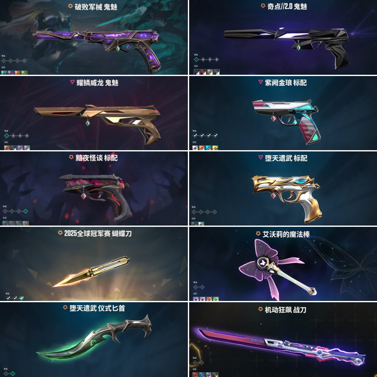 【拥有套装】千灵华绽套装(千灵华绽-幻影,千灵华绽-冥驹,千灵华绽-判官,千灵华绽--正义,落英飞旋)黯夜怪谈套装(黯夜怪谈-幻影,黯夜怪谈-獠犬,黯夜怪谈-飞将,黯夜怪谈-标配,夜刃诡镰)堕天遗武套装(堕天遗武-狂徒,堕天遗武-冥驹,堕天遗武-骇灵,堕天遗武-标配,堕天遗武-仪式匕首)破败军械套装(破败军械-幻影,破败军械-戍卫,破败军械-骇灵,破败军械-鬼魅,破败王者之残刃)奇点2.0套装(奇点//2.0-狂徒,奇点//2.0-鬼魅,奇点//2.0-蝴蝶刀)机动狂飙套装(机动狂飙-狂徒,机动狂飙-蜂刺,机动狂飙-雄鹿,机动狂飙-正义,机动狂飙-战刀)2025全球冠军赛套装(2025全球冠军赛-狂徒,2025全球冠军赛-蝴蝶刀
