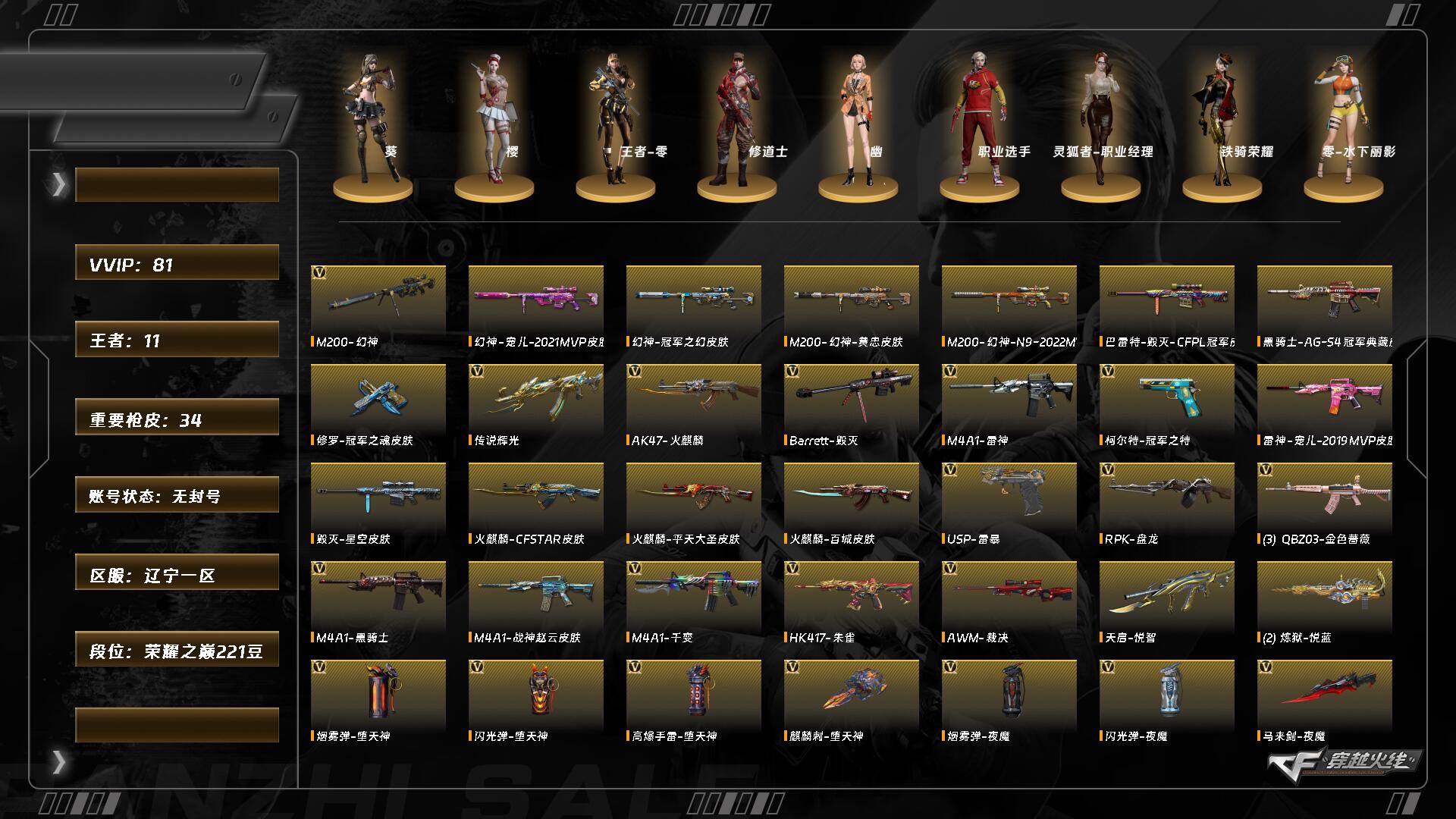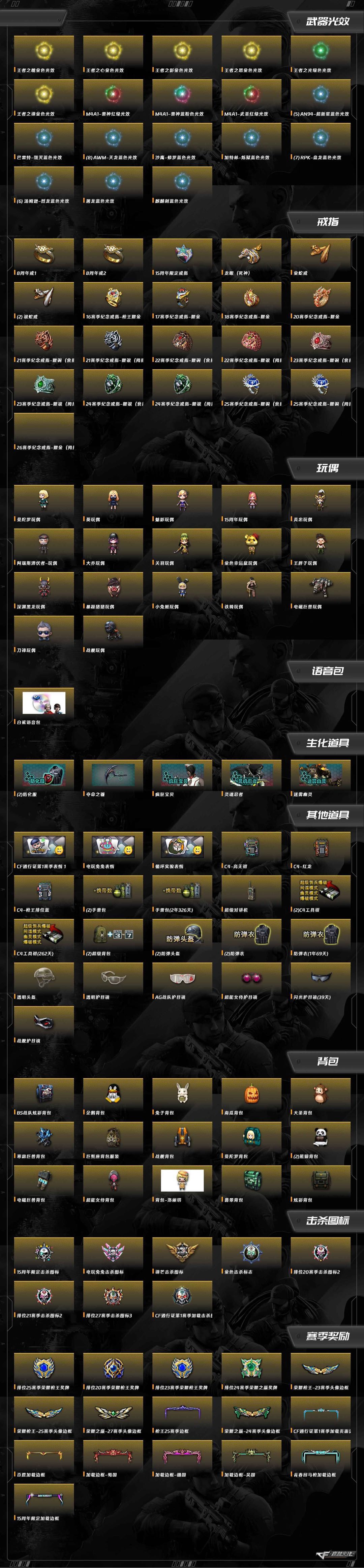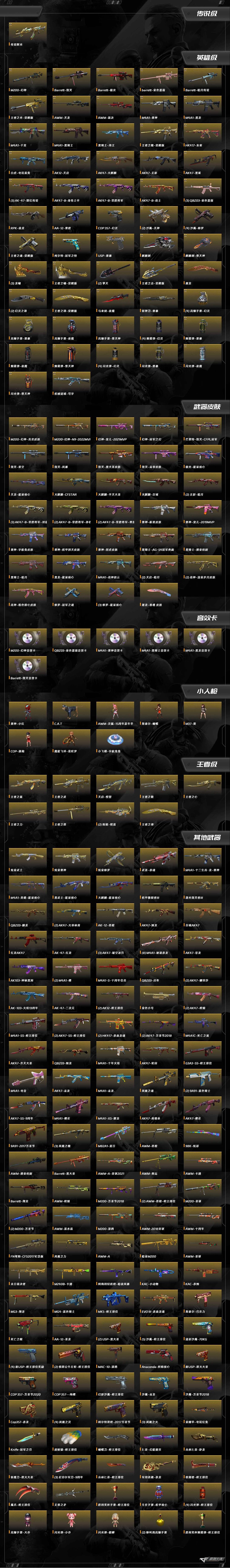 【传说武器】传说辉光 【英雄武器】_M200-幻神/Barrett-毁灭/Barrett-极光/barrett-金色蔷薇/Barrett-暗月传说/王者之光-觉醒版/AWM-天龙/AWM-裁决/M4A1-雷神/M4A1-黑龙/M4A1-千变/M4A1-黑骑士/黑骑士-海王/王者之魄-觉醒版/HK417-朱雀/白虎-电玩蓝兔/AK12-天启/AK47-火麒麟/AK47-无影/AK47-黑鲨/AK-47-猩红传说(3)/AK47-B-身先士卒/AK47-B-常胜将军/AK47-B-战士/QBZ03-金色蔷薇(3)/RPK-盘龙/AA-12-雷霆/COP 357-幻灵/沙鹰-天神(2)/沙鹰-修罗(4)/王者之魂-觉醒版/柯尔特-冠军之特/USP-雷暴/麒麟刺/麒麟刺-堕天神/龙啸(3)/王者之啸-觉醒版/擎天(2)/王者之击-觉醒版/屠龙/幻灵之锋(2)/王者之锋-觉醒版/马来剑-夜魔/斩神刀-雷暴/高爆手雷-幻灵(4)/高爆手雷-雷暴/高爆手雷-夜魔/高爆手雷-堕天神/烟雾弹-幻灵(4)/烟雾弹-雷暴/烟雾弹-夜魔/烟雾弹-堕天神/闪光弹-幻灵(4)/闪光弹-雷暴/闪光弹-夜魔/闪光弹-堕天神/机械迷城-穹宇 【王者武器】王者之翼/王者之武/天启-悦智/王者之戮/王者之心/王者之力/王者之怒/炼狱-悦蓝(2)/王者之锋 【小人枪】雷神-小红/C.A.T/AWM-灵狐-15周年嘉年华/斯泰尔-蝴蝶/M37-葵/COP-旗袍/魔能飞环-曼陀罗/小飞碟-宇航兔兔 【其他重要武器】炫金武士/炫金雷神/炫金修罗/武圣-赤魂/M4A1-十二生肖·龙-雷神/M4A1-英雄-能量核心/黑武士-能量核心/火麒麟-能量核心/机甲撕裂者III/激光毁灭者III/QBZ03-麟龙/AK47-大帝林肯(2)/AK-12-恶棍/AK47-烛龙/百城AK47/红龙AK47/AK-47-红龙/AK47-破空冰刃(3)/M4A1-秘银赤龙(8)/AK47-苍龙/AK103-神秘黑洞/M4A1-樱(2)/M4A1-S-十周年/QBZ03-吕布/AK47-娜塔莎(2)/AK-103-火线13周年/AK-47-二次元/AK12-枪王排位(2)/金色小号/AK47-枪娘(2)/M4A1-SS-枪王排位/AK47-SS-枪王排位(2)/HK417-赤血龙魂(2)/AK47-万圣节2018(2)/M4A1C-死亡之翼/AK47-齐天大圣/QBZ03-烛龙/M4A1-十年火线/AK47-轮回/G3A3-SS-枪王排位/M4A1-电音/AK47-青龙/M4A1-青龙./凤凰之魂/9A91-蓝色骑士(2)/AK47-SS-9周年/M4A1-樱花/M4A1-XS-耀龙/AK47-肯德基/AK47-樱花/9A91-2017万圣节/凤凰之魄(3)/M82A1-夏日/AWM-恶棍/98K-炫彩/AWM-摸金校尉/Barrett-黑大圣/AWM-A-圣诞2021/AWM-奥运/AWM-卡通/Barrett-翔龙/AWM-枪娘/M200-万圣节2018/AWM-恶棍-枪王排位(2)/M200-圣诞/M200-万圣节(2)/AWM-蓝水晶/M200-涂鸦/AWM-2018圣诞/AWM-十周年/FN弩炮-CFS2017纪念版/凤凰之力/AWM-A/暗金M200/AWM-圣诞/末日裁决者/M240B-卡通/阿梅利轻机枪-暗夜风暴/KAC-小动物/KAC-赤烛/MG3-翔龙/MG4-蓝色骑士/MK5-枪王排位/EVO III-赤血龙魂/斯泰尔-巧克力/死亡之眼/AA-12-圣龙/USP-黑大圣(2)/沙鹰-枪王排位(5)/迷彩沙鹰-70KG/新USP-枪王排位奖励(4)/愤怒公牛左轮-枪王排位(2)/MAC-10-涂鸦/Anaconda-炽焰核心/新USP-怒火大圣/COP 357-万圣节2020/COP 357--绚樱/幻影沙鹰-枪王排位/沙鹰-青龙/沙鹰-万圣节2018/Cop357-赤龙/凤凰之灵(4)/柯尔特双枪-2017万圣节/凤凰之火(3)/金刚伞-电玩红兔/Knife-冠军之刃/招财猫-枪王排位/蝴蝶刀-枪王排位/匕首-幻能朋克/丛林匕首-卧龙/斩魔刀-怒火大圣/尼泊尔军刀-9周年(3)/丛林匕首-枪王排位/军用铁锹-赤龙/收割者-枪王排位/鹰爪-枪王排位/无畏之矛/胜利奖杯手雷-枪王排位/生化手雷-机甲核心/闪光弹-枪王排位(4)/高爆手雷-大乔/闪光弹-小乔/闪光弹-貂蝉/惨叫鸡高爆手雷(2)/胜利奖杯烟雾弹-枪王排位 【重要武器皮肤】M200-幻神-黄忠皮肤/M200-幻神-N9-2022MVP/幻神-宠儿-2021MVP/幻神-冠军之幻/巴雷特-毁灭-CFPL冠军/毁灭-星空/毁灭-风暴/毁灭-黑大圣皮肤/毁灭-青帝皮肤/极光-能量核心/天龙-能量核心/火麒麟-CFSTAR/火麒麟-平天大圣/火麒麟-百城/无影-暗月/AK47-B-常胜将军-刘备/AK47-B-常胜将军-孙权/AK47-B-常胜将军-曹操/雷神-航星皮肤/雷神-宠儿-2019MVP/雷神-宇航兔皮肤/雷神-机甲刑天皮肤/雷神-烈虎皮肤/黑骑士-AG-S4冠军典藏/黑骑士-摸金校尉/黑骑士-暗月/黑龙-能量核心/M4A1-战神赵云/天启-暗月/战神-流金岁月皮肤/战神-粉色甜心皮肤/修罗-冠军之魂/修罗-能量核心/屠龙-春桃 皮肤 【重要光效】王者之魄金色光效/王者之心金色光效/王者之影金色光效/王者之怒金色光效/王者之光绿色光效/王者之锋金色光效/M4A1-雷神红绿光效/M4A1-雷神蓝粉色光效/M4A1-武圣红绿光效/AN94-超新星蓝色光效/巴雷特-毁灭蓝色光效/AWM-天龙蓝色光效/沙鹰-修罗蓝色光效/加特林-炼狱蓝色光效/RPK-盘龙蓝色光效/汤姆逊-烈龙蓝色光效/屠龙蓝色光效/麒麟刺蓝色光效 【重要音效卡】M200-幻神音效卡/QBZ03-金色蔷薇音效卡/M4A1-雷神音效卡/M4A1-黑骑士音效卡/M4A1-黑龙音效卡/Barrett-毁灭音效卡;USP-雷暴,柯尔特-冠军之特,Knife-冠军之刃,RPK-盘龙,QBZ03-金色蔷薇,M200-幻神,