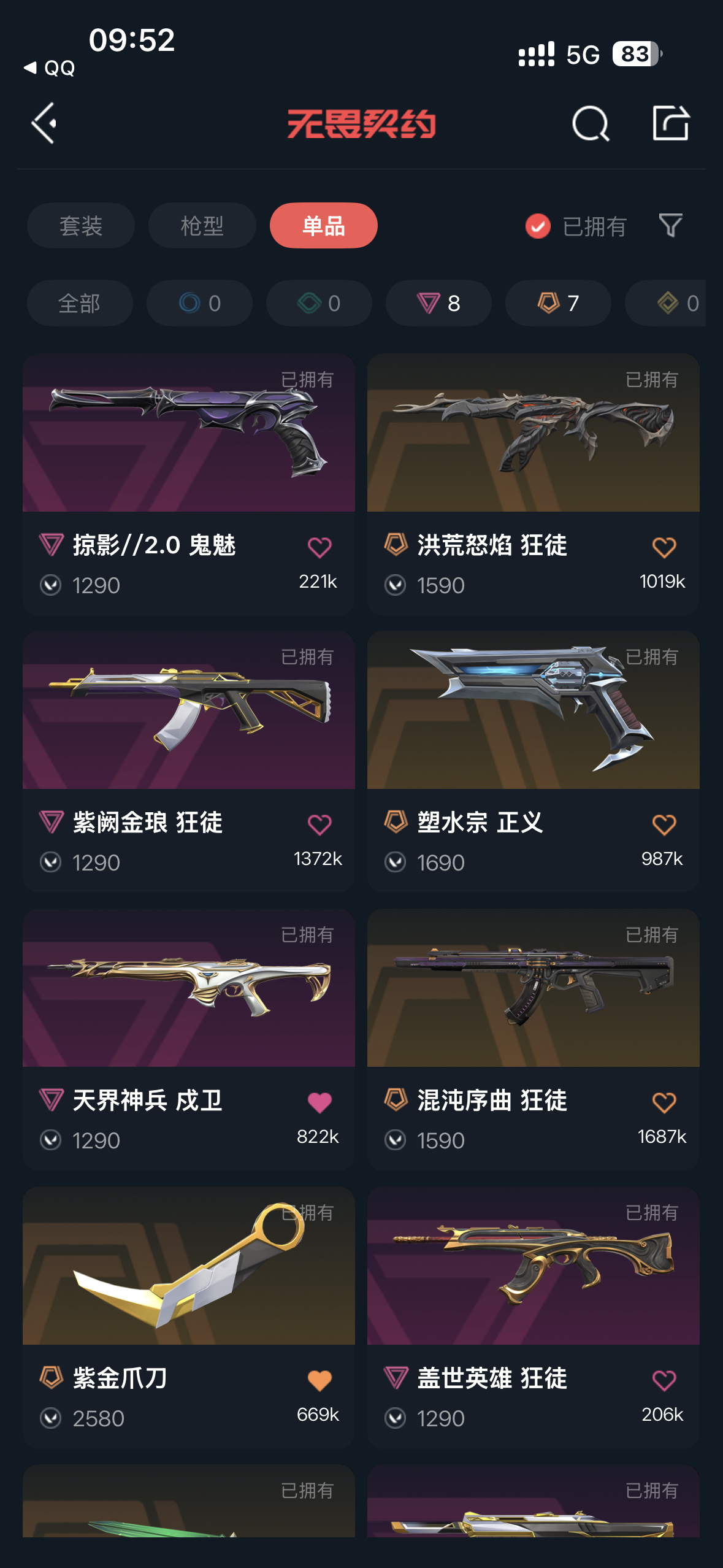 允许 英雄25 武器皮肤数量44;紫金爪刀,盖亚的复仇 狂徒,洪荒怒焰 狂徒,侦察力量 幻影,紫阙金琅 狂徒,天界神兵 戍卫,混沌序曲 狂徒,