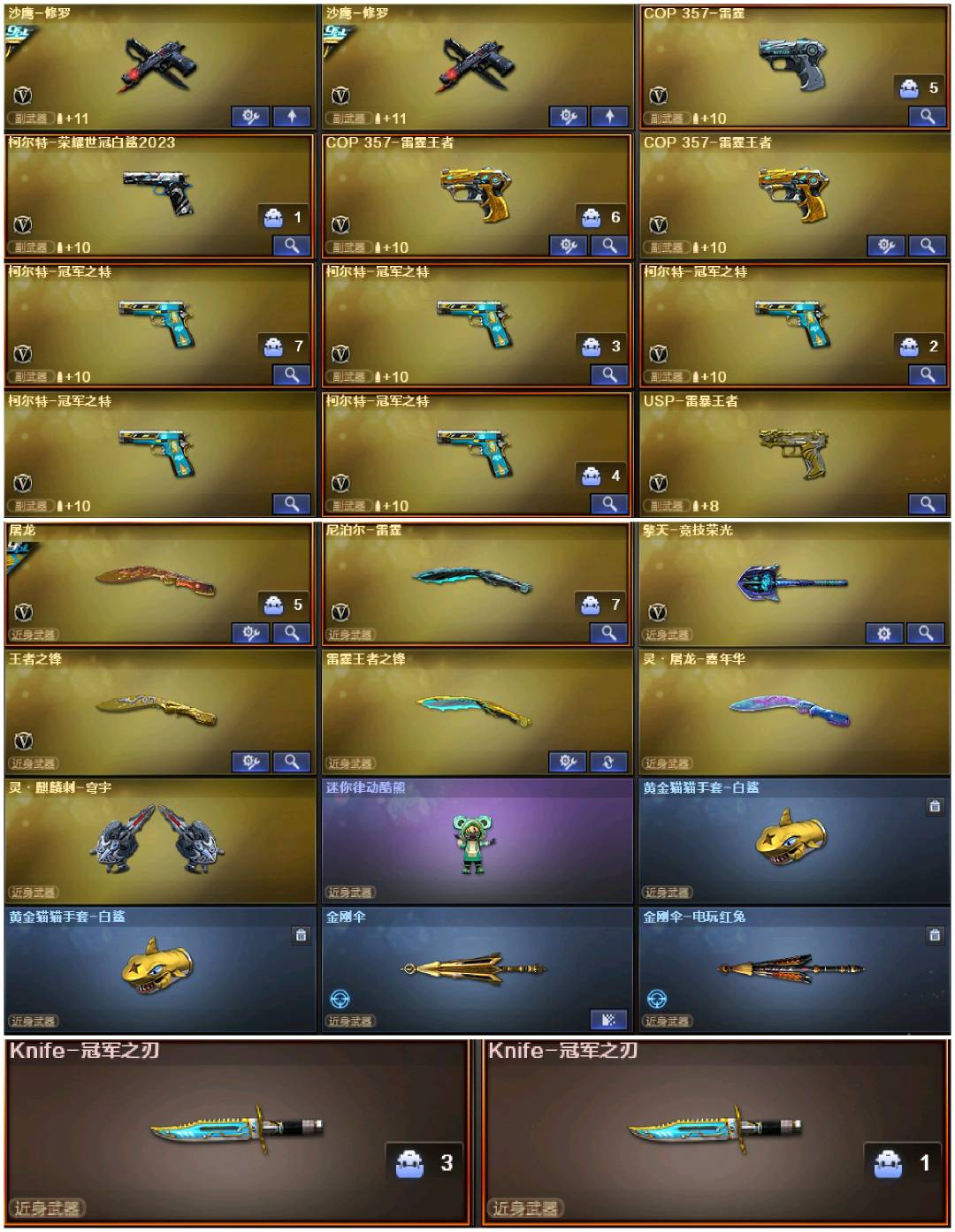 禁止一切外挂,违者必究;USP-雷暴王者,柯尔特-荣耀世冠白鲨2023,柯尔特-冠军之特,Knife-冠军之刃,传说女帝,电竞教官-云悠悠,王者沙漠玫瑰,