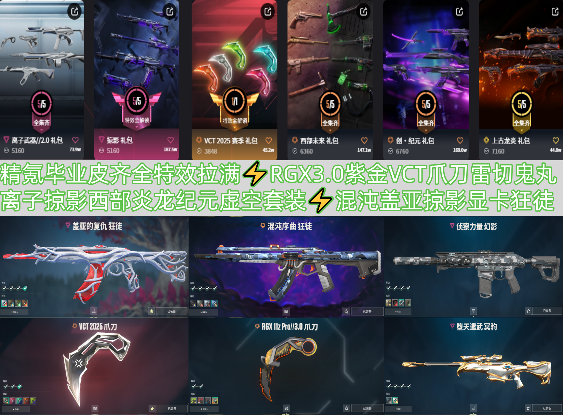 精氪毕业皮齐全特效拉满⚡RGX紫金VCT雷切鬼丸⚡混沌盖亚掠影显卡狂徒⚡离子掠影西部炎龙纪元虚空套装