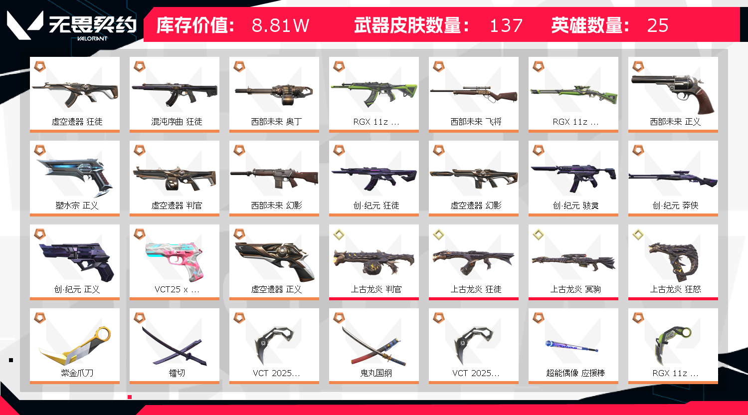 首页 > 租号大厅 > 无畏契约-wegame > wegame/wegame > 精氪毕业皮齐全特效拉满⚡RGX紫金VCT雷切鬼丸⚡混沌盖亚掠影显卡狂徒⚡离子掠影西部炎龙纪元虚空套装