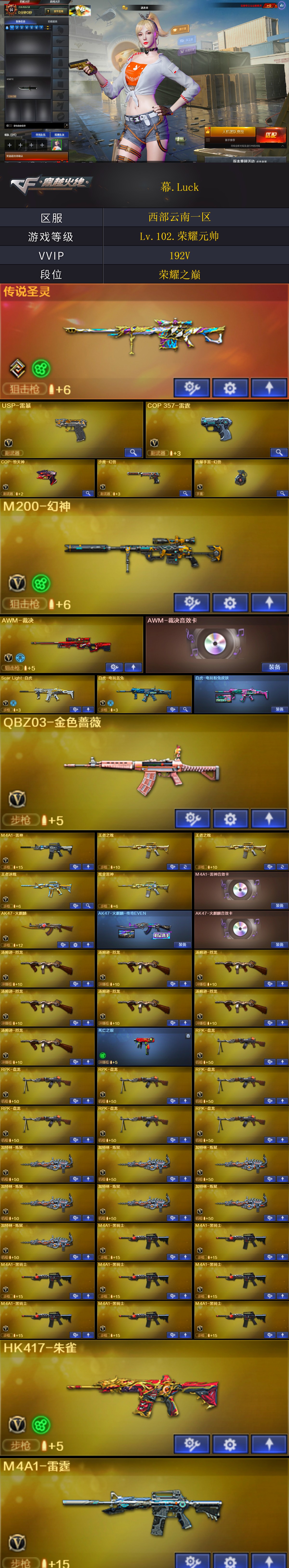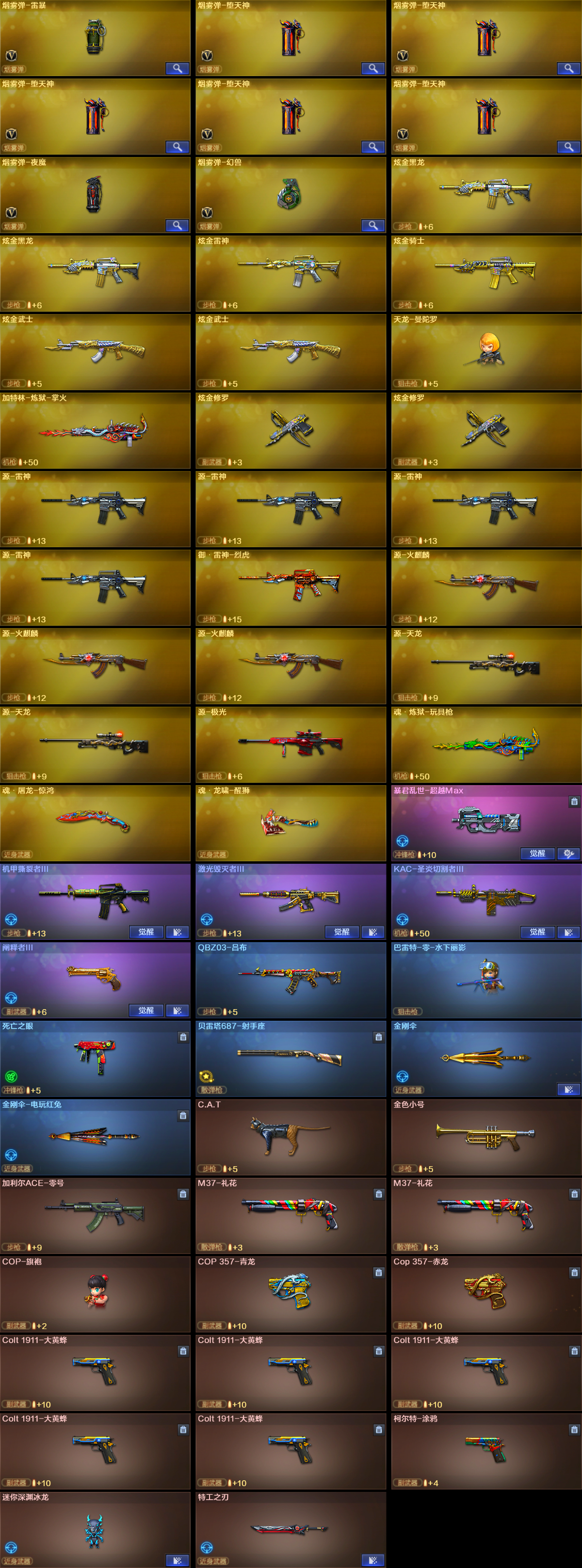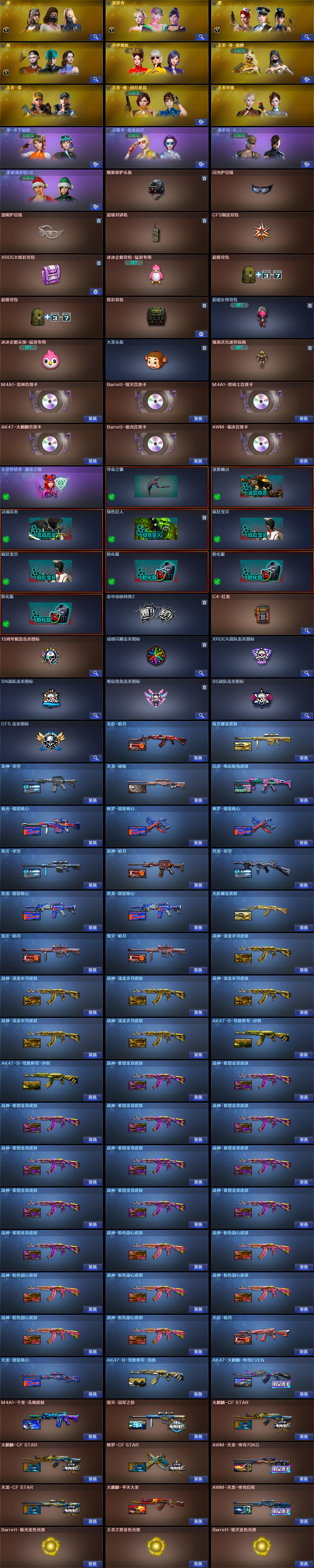稀有武器】:传说圣灵/M200-幻神/ScarLight-白虎/HK417-朱雀/M4A1-雷霆/雷霆之契/USP-雷暴/COP-堕天神/天神-动感闪耀/沙鹰-幻兽/QBZ03-金色蔷薇(2)/AK47-火麒麟(3)/M4A1-黑龙(2)/M4A1-雷神(4)/M4A1-黑骑士(8)/AK47-无影(2)/AK47-黑武士/白虎-电玩蓝兔/Barrett-毁灭(8)/Barrett-极光(2)/AWM-裁决(3)/RPK-盘龙(7)/加特林-炼狱(7)/汤姆逊-烈龙(7)/AA-12-雷霆/斩神刀-雷暴/麒麟刺-堕天神/龙啸-堕天神/马来剑-夜魔/女皇利刃-幻兽 【王者武器】:王者之怒-觉醒版/王者之力-觉醒版/炼狱-悦蓝/王者之心(3)/王者之魄(2)/王者之怒(2)/王者之光/炼狱-悦蓝 【热门角色】:迷迭香/炫/乔伊教练/王者-葵-貂蝉/王者-零/王者玲珑/潘多拉-X 【热门音效卡】:AWM-裁决音效卡/M4A1-雷神音效卡/Barrett-毁灭音效卡/M4A1-黑骑士音效卡/AK47-火麒麟音效卡/Barrett-极光音效卡 【热门皮肤】:白虎-电玩粉兔皮肤/AK47-火麒麟-传奇EVEN/毁灭-冠军之怒 【其他亮点】:贝雷塔687-射手座/金刚伞-电玩红兔;USP-雷暴,RPK-盘龙,QBZ03-金色蔷薇,M200-幻神,Scar Light-白虎,