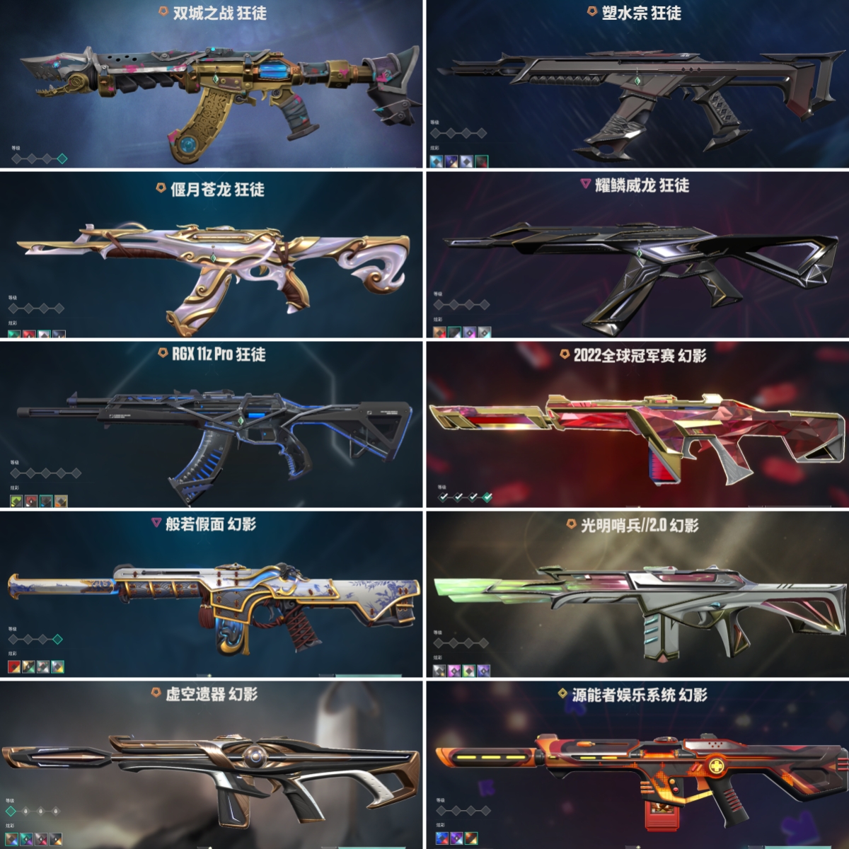 【拥有步枪】2022全球冠军赛-幻影,RGX-11z-Pro-狂徒,混沌序曲-狂徒,双城之战-狂徒,破败军械-戍卫,塑水宗-狂徒,奇点//2.0-狂徒,光明哨兵//2.0-幻影,偃月苍龙-狂徒,艾沃莉的梦之翼-狂徒,天界神兵-戍卫,盖亚的复仇-狂徒,侦察力量-幻影,起源-狂徒,海洋之星-狂徒,阿特拉斯指挥部-狂徒,日耀风暴-幻影,诡秘蛇影-狂徒,神圣领域-獠犬,神圣领域-幻影,荒土机兵-狂徒,超限闪存-幻影,超能偶像-戍卫,超能偶像-狂徒,流星兵团-狂徒,珍珠棘贝-幻影,珍珠棘贝-戍卫,钢轨卫士-狂徒,钢轨卫士-戍卫,沙尘幻旅-狂徒,太空穿梭-戍卫,悠闲猫生-獠犬,幻语魔咒-獠犬,甜蜜战术-戍卫,折光棱晶-戍卫,月球哨兵-戍卫,纳米击-幻影,逆冲蛮牛-戍卫,逆冲蛮牛-獠犬,模拟赫兹-獠犬,浮光跃金-戍卫,聚合之力-幻影,采蜜小蜂队-獠犬,战术熊与伙伴们-戍卫,复古浪潮-獠犬,战术小伙伴-獠犬,战术小伙伴-幻影,萌彩剪影-戍卫,胡桃狂想-獠犬,