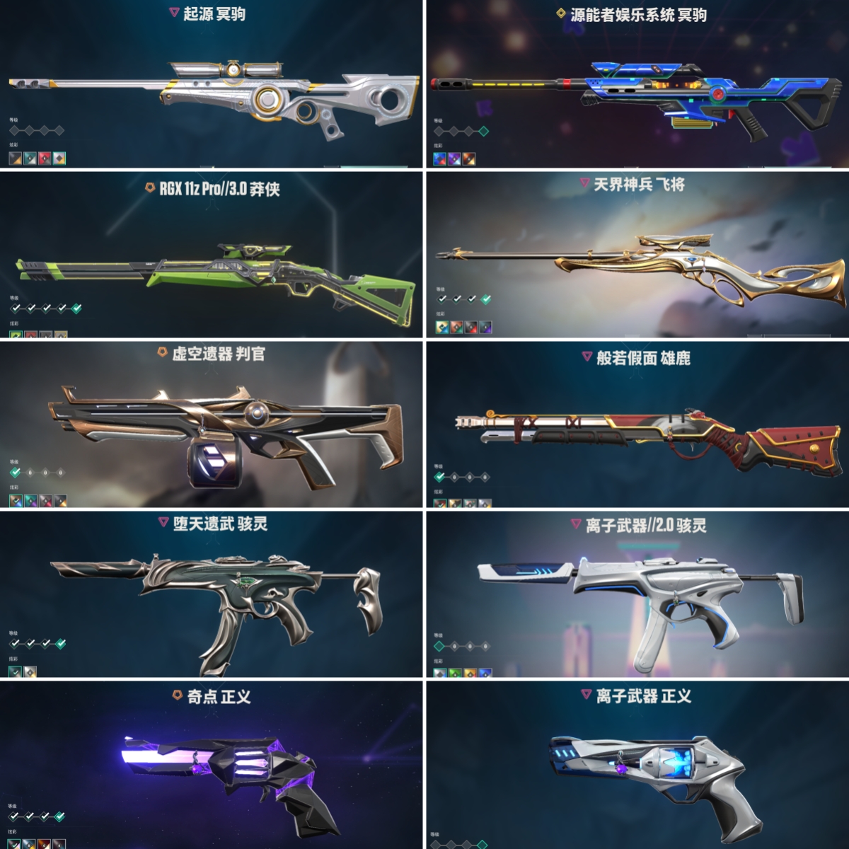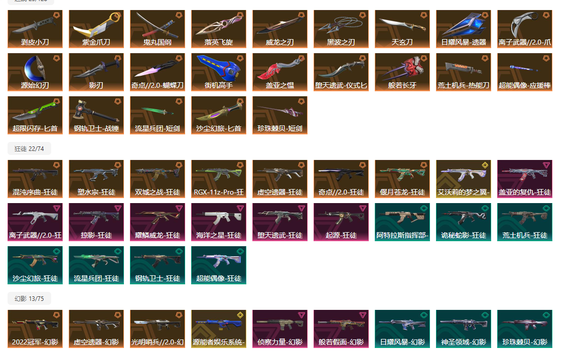 【拥有手枪】VCT-x-EDG-标配,电音光谱-标配,RGX-11z-Pro//2.0-标配,奇点-正义,天界神兵-鬼魅,紫阙金琅-标配,离子武器-正义,日耀风暴-正义,神圣领域-狂怒,荒土机兵-标配,超限闪存-正义,超能偶像-标配,流星兵团-鬼魅,珍珠棘贝-狂怒,钢轨卫士-狂怒,钢轨卫士-短炮,沙尘幻旅-正义,太空穿梭-正义,悠闲猫生-短炮,甜蜜战术-鬼魅,幻语魔咒-狂怒,末日之翼-短炮,折光棱晶-标配,月球哨兵-正义,纳米击-正义,逆冲蛮牛-狂怒,浮光跃金-标配,模拟赫兹-鬼魅,聚合之力-狂怒,采蜜小蜂队-鬼魅,纤云弄巧-正义,战术熊与伙伴们-狂怒,纤云弄巧-短炮,战术熊与伙伴们-标配,复古浪潮-正义,深海水族-短炮,光导纤维-鬼魅,光导纤维-标配,萌彩剪影-狂怒,胡桃狂想-鬼魅,