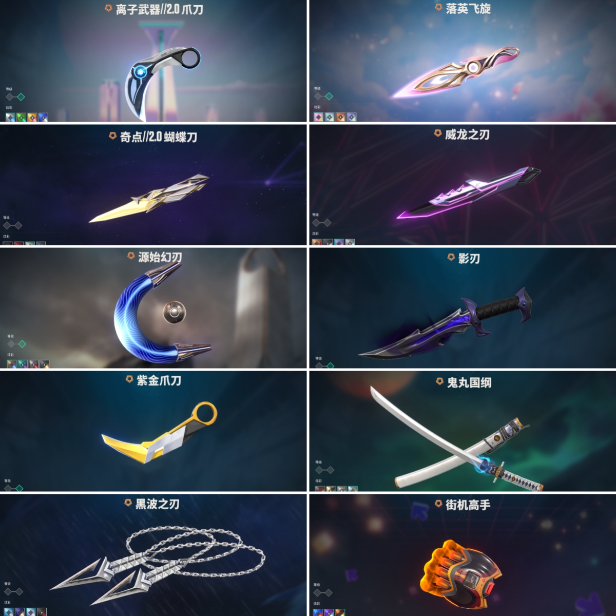 【拥有近战武器】日耀风暴-遗器,荒土机兵-热能刀,超限闪存-匕首,超能偶像-应援棒,流星兵团-短剑,珍珠棘贝-短剑,钢轨卫士-战锤,沙尘幻旅-匕首,落英飞旋,黑波之刃,奇点//2.0-蝴蝶刀,鬼丸国纲,紫金爪刀,天玄刀,剥皮小刀,盖亚之愠,