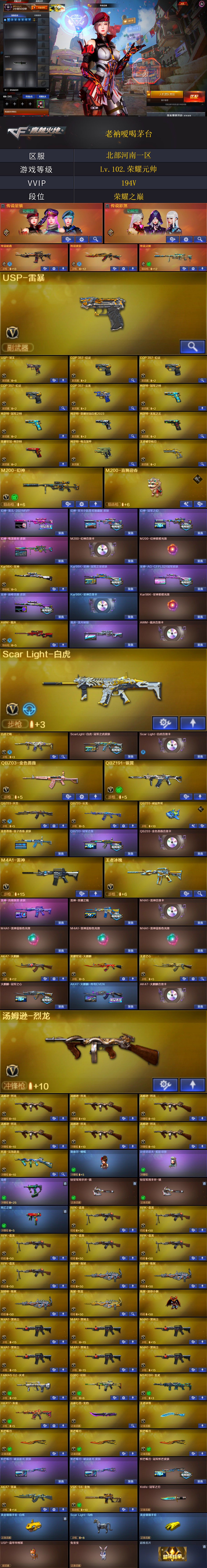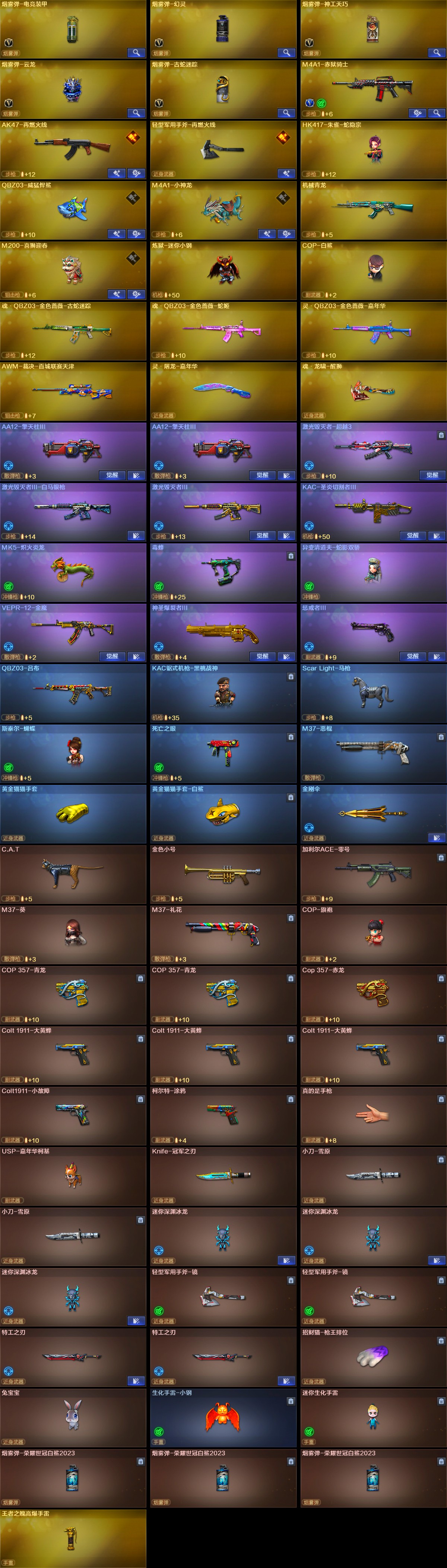 【稀有武器】:传说暗裔/传说夜影/传说灵眸/M200-幻神/Kar98K-星神/VSK-94-金蚀/G36C-幻影/ScarLight-白虎/M14EBR-玄武/HK417-朱雀/QBZ03-天罚/AK47-雷暴/USP-雷暴/柯尔特-电竞装甲/COP357-幻灵(3)/天神-动感闪耀/COP357-云龙/柯尔特-荣耀世冠白鲨2023/柯尔特-无冕之王/修罗-古蛇迷踪/荣耀世冠-柯尔特/柯尔特-冠军之特(2)/王者破空枪刃/金色蔷薇-古蛇迷踪/QBZ03-云龙/QBZ03-金色蔷薇(2)/AK47-火麒麟(4)/M4A1-黑龙(3)/M4A1-雷神(6)/M4A1-黑骑士(6)/AK47-无影/AK47-黑武士(2)/荣耀世冠-火麒麟/Barrett-毁灭(5)/Barrett-极光(3)/AWM-裁决/RPK-盘龙(6)/加特林-炼狱(3)/汤姆逊-烈龙(7)/AA-12-雷霆/炽芒蝶刃(3)/斩神刀-雷暴/幻灵之锋(2)/唐刀-神工天巧/云龙扇 【王者武器】:王者之心-觉醒版/白虎之魄-觉醒版/王者之怒-觉醒版/王者之光-觉醒版/王者凰鸣-觉醒版/王者破空枪刃 【热门角色】:传说影煞/关小雨/兰-巾帼英雄/晴雅/影豹/乔伊教练/蛇隐宗/王者春/王者-零/王者玲珑-小乔/王者沙漠玫瑰/潘多拉-X/职业选手/潘多拉 【热门音效卡】:M200-幻神音效卡/Kar98K-星神音效卡/AWM-裁决音效卡/Scar Light-白虎音效卡/QBZ03-金色蔷薇音效卡/M4A1-雷神音效卡/Barrett-毁灭音效卡/M4A1-黑骑士音效卡(2)/AK47-火麒麟音效卡 【热门皮肤】:幻神-宠儿-2021MVP/幻神-星火小队签名臻藏版皮肤/幻神-冠军之幻/幻神-电流骇客皮肤/幻影-破浪逐光皮肤/金色蔷薇-量子蔷薇皮肤/雷神-高能霹雳 皮肤/屠龙-星火燎原/Kar98K-星神-冠军之星皮肤/擎天-冠军之击/星神-巅峰荣耀 皮肤/QBZ03-冠军之薇/屠龙-破浪逐光皮肤/裁决-流光秘银/黑龙-冠军之武/炽芒蝶刃-破浪逐光皮肤(2)/AK47-火麒麟-传奇EVEN/极光-高能霹雳皮肤/ScarLight-白虎-冠军之虎皮肤/火麒麟-冠军之心/屠龙-荣耀之锋(2)/毁灭-荣耀之怒/屠龙-春桃皮肤/炽芒蝶刃-冠军炽芒皮肤/雷神-荣耀之魄 【其他亮点】:斯泰尔-蝴蝶/炼狱-迷你小钢/Knife-冠军之刃/M4A1-小神龙/M200-喜狮迎春/MK5-炽火炎龙/毒蜂/VEPR-12-金魔/Scar Light-马枪/黄金猫猫手套/黄金猫猫手套-白鲨/USP-嘉年华柯基/兔宝宝/烟雾弹-荣耀世冠白鲨2023(3)/超核名片 (截图展示段位不代表实际段位,如赛季更新等不可抗拒因素发生变化,其余道具看截图或咨询客服);USP-雷暴,柯尔特-无冕之王,荣耀世冠-柯尔特,柯尔特-荣耀世冠白鲨2023,柯尔特-冠军之特,炽芒蝶刃,Knife-冠军之刃,