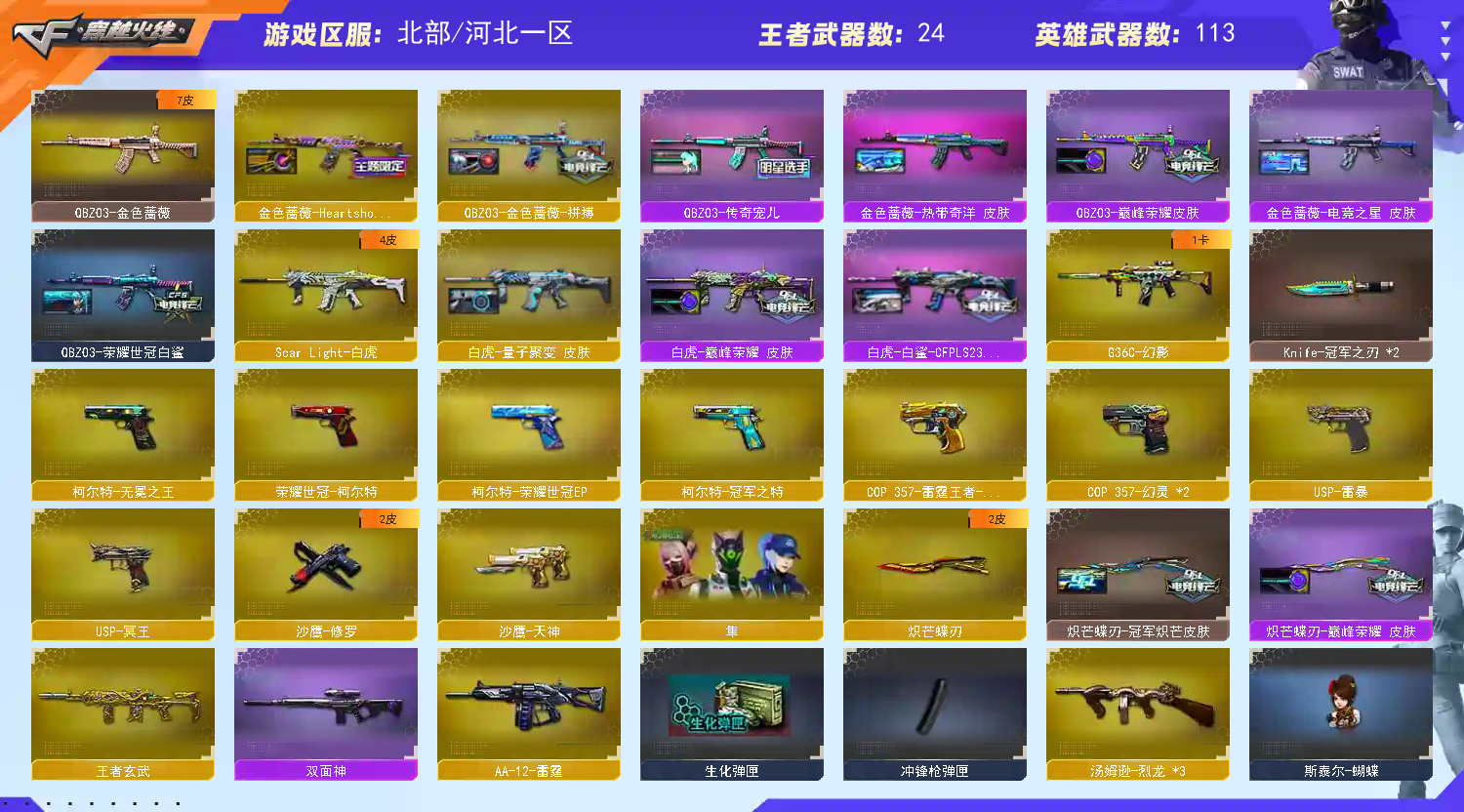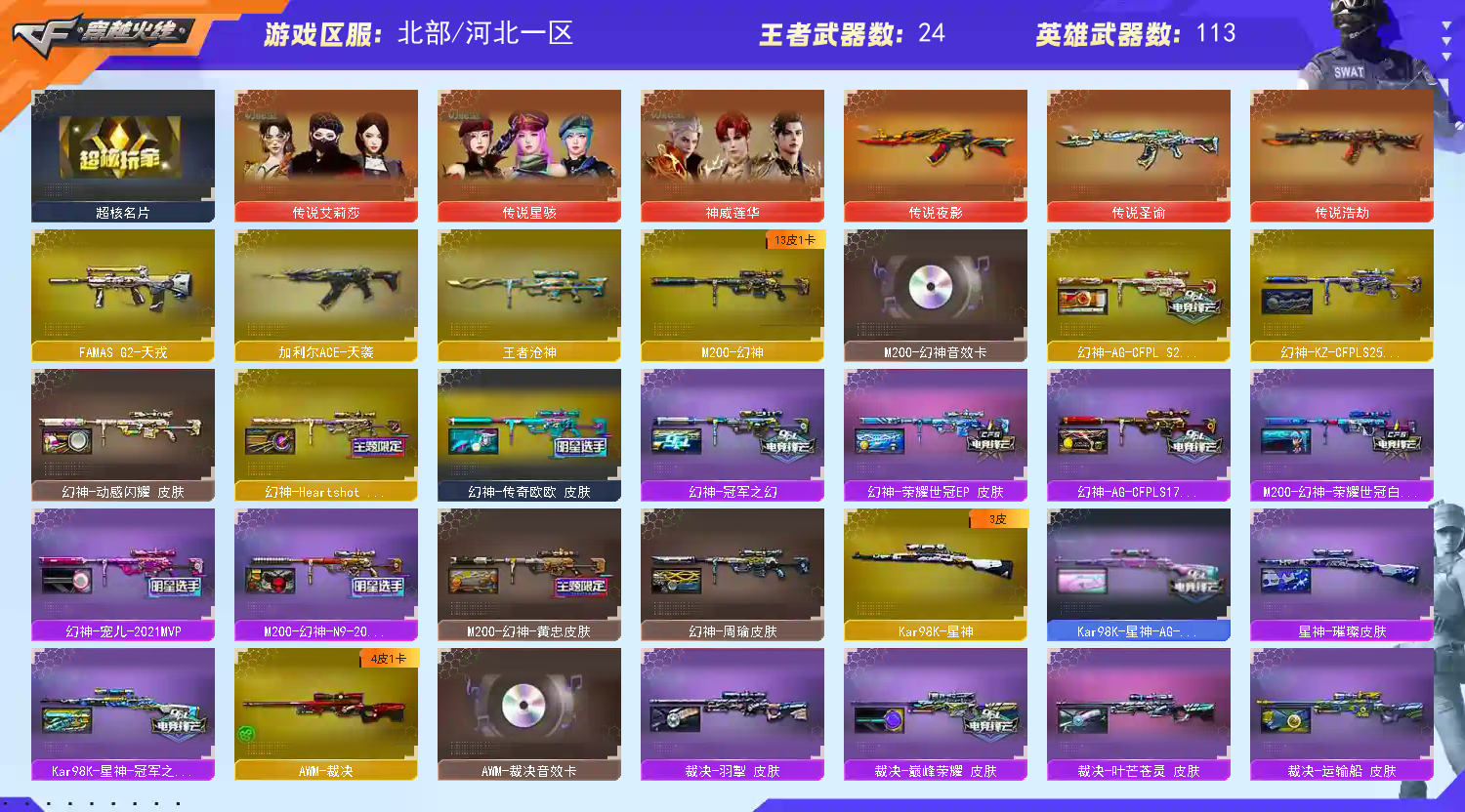 【商品标题】:北部河北一区-126V-可二次实名-【Lv.100.3-元首】-【段位:荣耀枪王】 【稀有武器】:传说夜影/M200-幻神/Kar98K-星神/G36C-幻影/ScarLight-白虎/HK417-朱雀/QBZ03-天罚/M4A1-幻灵/USP-雷暴/COP357-幻灵(2)/天神-动感闪耀/柯尔特-无冕之王/修罗-古蛇迷踪/荣耀世冠-柯尔特/COP357-雷霆王者-觉醒版/柯尔特-冠军之特/金色蔷薇-古蛇迷踪/QBZ03-金色蔷薇/AK47-火麒麟/M4A1-雷神/M4A1-黑骑士/荣耀世冠-火麒麟/荣耀世冠-雷神/Barrett-毁灭(2)/Barrett-极光/AWM-裁决/汤姆逊-烈龙(3)/AA-12-雷霆/炽芒蝶刃/斩神刀-雷暴/幻灵之锋/唐刀-神工天巧 【王者武器】:QBZ-03-王者蔷薇-觉醒版/王者风神-觉醒版/王者玉锋 【热门角色】:传说艾莉莎/机械姬/影豹/岚兮儿/隼/魅影/奇洋探员/乔伊教练/蛇隐宗/王者春/王者凌霄/王者雾萌萌/灵狐者-职业经理/潘多拉-X/幽/潘多拉 【热门音效卡】:M200-幻神音效卡/AWM-裁决音效卡/HK417-朱雀音效卡/QBZ03-天罚音效卡/M4A1-黑骑士音效卡 【热门皮肤】:幻神-AG-CFPLS24冠军皮肤/幻神-Heartshot皮肤/幻神-传奇欧欧皮肤/M200-幻神-N9-2022MVP/幻神-宠儿-2021MVP/M200-幻神-荣耀世冠白鲨/幻神-AG-CFPLS17冠军/幻神-冠军之幻/幻神-周瑜皮肤/幻神-动感闪耀皮肤/白虎-白鲨-CFPLS23冠军/裁决-巅峰荣耀皮肤/雷神-HeartShot皮肤/金色蔷薇-Heartshot皮肤/火麒麟-傲竹金蛇皮肤/火麒麟-HeartShot皮肤/金色蔷薇-热带奇洋皮肤/QBZ03-传奇宠儿/M4A1-雷神-巅峰荣耀皮肤/QBZ03-巅峰荣耀皮肤/裁决-羽掣皮肤/Kar98K-星神-冠军之星皮肤/雷神-R.LGD-CFPLS18冠军/擎天-冠军之击/火麒麟-巅峰荣耀/白虎-巅峰荣耀 皮肤/死神-机甲核心皮肤/星神-璀璨皮肤/传奇石头-横秒之巅/QBZ03-荣耀世冠白鲨/雷神-宠儿-2019MVP/雷神-传奇N9/毁灭-冠军之怒/黑骑士-AG-S4冠军典藏/雷神-冠军之魄/龙啸-冠军之啸/炽芒蝶刃-冠军炽芒皮肤 【其他亮点】:斯泰尔-蝴蝶/Knife-冠军之刃(2)/白虎-迷你小艾/贝雷塔687-射手座/黄金猫猫手套-白鲨/M14EBR-冠军金牛/哔哩哔哩名片/超核名片/超核名片 (截图展示段位不代表实际段位,如赛季更新等不可抗拒因素发生变化,其余道具看截图或咨询客服);USP-雷暴,柯尔特-无冕之王,荣耀世冠-柯尔特,柯尔特-冠军之特,炽芒蝶刃,Knife-冠军之刃,传说星骇,