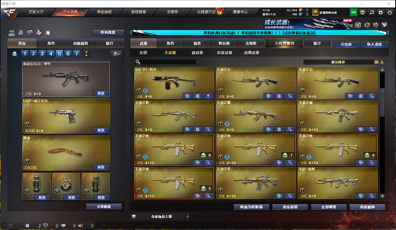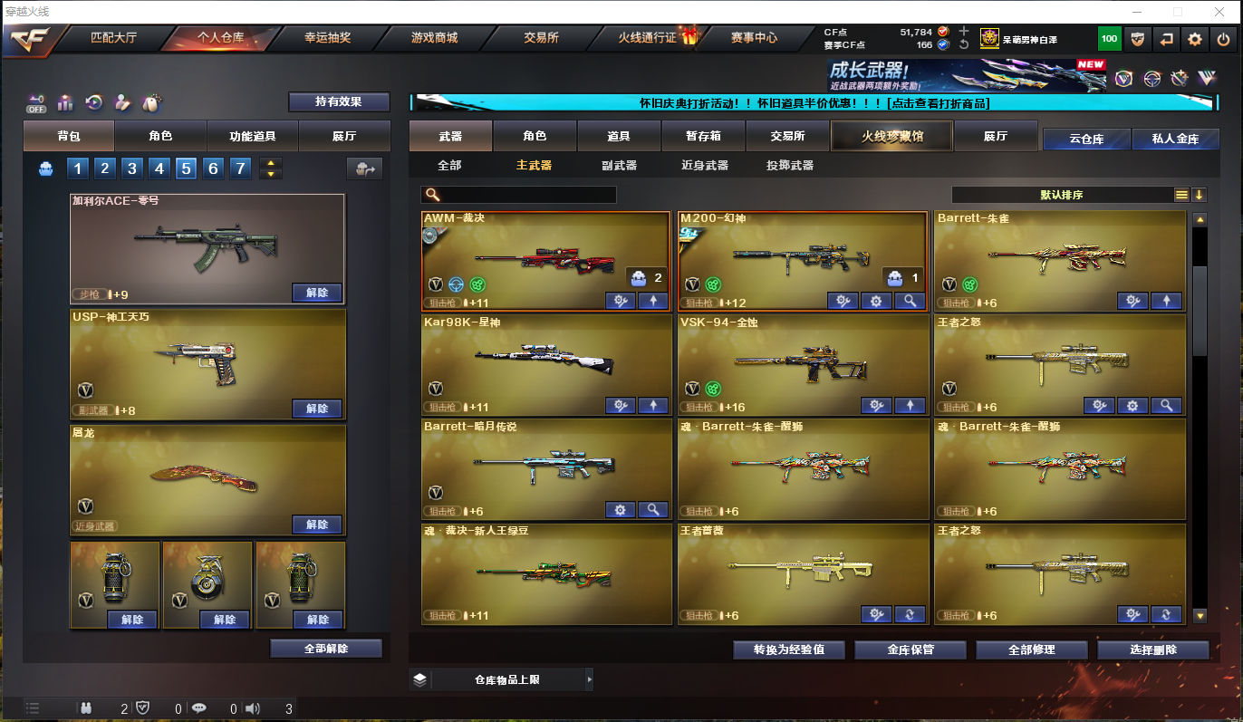 【★★传说艾莉莎★★】【★★传说暗裔★★】【★★传说幽冥★★】【M200-幻神带幻神-冠军之幻带音效卡】【98K星神带星神音效卡】【裁决带裁决-羽毛犁皮肤带裁决音效卡】【Scar白虎】【G36C-幻影】【QBZ金色蔷薇×9】【荣耀世冠-柯尔特】【盘龙×6】【炼狱×2】【烈龙×6】【斯泰尔-蝴蝶】【USP-雷暴×2】【USP-神工天巧×4】【炽芒蝶刃】狙击枪:【M200-幻神】【98K星神】【天龙×4】【毁灭×6】【极光×2】【裁决】【Barrett-朱雀】【VSK-94-金蚀】【王者之怒--王者蔷薇--王者之怒×2】【Barrett-暗月传说】步枪:【传说暗裔】【Scar白虎】【G36C-幻影】【QBZ金色蔷薇×9】【荣耀世冠-火麒麟】【荣耀世冠-雷神】【火麒麟×3】【黑龙×4】【雷神×4】【黑骑士×4】【AK47-无影×2】【AK12-天启×4】【AK47-黑鲨】【M4A1-龙血×2】【AK47-雷暴】【M14EBR-玄武】【QBZ03-天罚】【无影-神兵利器】【金色蔷薇-古蛇迷踪】【QBZ191-银翼】【FAMAS G2-天戎】【王者之心×2--王者之影--王者之翼--王者之魄--王者之势×4--王者之圣--王者冰魄--王者炎心--王者火魄--王者芳薇】机枪:【盘龙×6】【炼狱×2】冲锋枪:【烈龙×6】【斯泰尔-蝴蝶】手枪:【传说幽冥】【USP-雷暴×2】【USP-神工天巧×4】【荣耀世冠-柯尔特】【修罗-古蛇迷踪】【王者之灵】【COP-白鲨】【王者之魂×2】刀具:【炽芒蝶刃】【屠龙×6 龙啸 擎天×2 麒麟刺×4 斩神刀-雷暴 磨刀-神工天巧 王者之锋×3 王者之啸 王者之击×2 荣耀世冠-龙啸】手雷:【雷暴高爆手雷套×7 古蛇迷踪高爆手雷 雷暴闪光弹手雷套×7】音效卡:【幻神音效卡 星神音效卡 裁决音效卡 天罚音效卡 极光音效卡 Scar白虎音效卡 黑龙音效卡 毁灭音效卡 雷神音效卡 火麒麟音效卡 黑骑士音效卡】角色:【四防传说艾莉莎】【四防王者-迷迭香】【四防王者-魅影】【四防王者玲珑-小乔】【春 葵 瞳 樱 蛇隐宗 王者-瞳-闭月羞花】皮肤:【幻神-冠军之幻】【金色蔷薇-破浪逐光】【幻影-破浪逐光】【黑骑士-白马银枪 黑骑士-破浪10年】【屠龙-荣耀世冠AG】【擎天-冠军之击】【M4A1-雷神-CFS2019】【毁灭-冠军之怒 毁灭-荣耀之怒】【火麒麟-AG战队】;USP-雷暴,荣耀世冠-柯尔特,传说幽冥,炽芒蝶刃,传说艾莉莎,RPK-盘龙,QBZ03-金色蔷薇,