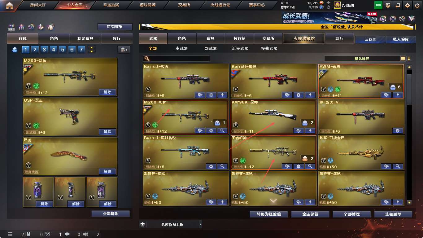 【亮点解析 幻神三件套】 【m200-幻神+音效卡+幻神-ag17冠军】 【98k星神】 【王者幻神】 【传说圣灵】 【传说光耀】 【scar白虎】 【qbz金色蔷薇】 【生化 5炼狱 6烈龙】 【裁决+运输船】 【毁灭+音效卡】 【极光】 【火麒麟+音效卡】 【黑龙】 【雷神+音效卡】 【黑骑士+音效卡+白马银呛】 【王者之魄】 【无影 黑武士 黑鲨 龙血】 【8手呛 修罗*5 天神*2 usp冥王】 【10近战 屠龙*5 龙啸 擎天 麒麟刺】 【手雷 玄豹】 【角色 葵 王者玲珑 乔伊教练 】;