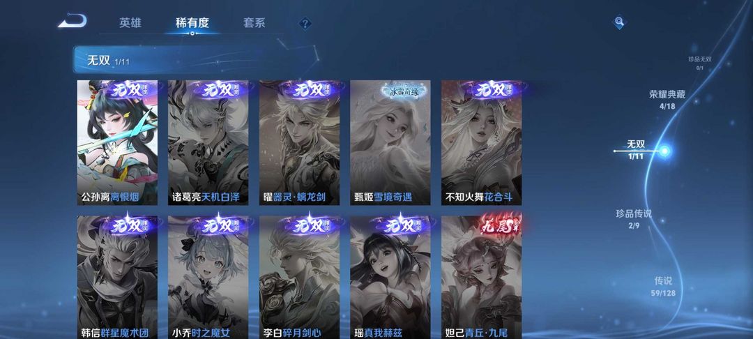 v10、12水539皮、死亡执政官、刘备星传说时之思念、小兵皮肤大耳狗甜茶、瑶无双真我赫兹、愿照·九州拓、怪盗基德、画中仙、至尊宝、凤求凰、神威、天魔缭乱