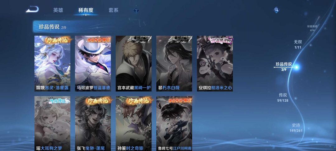 V10、532皮13水、刘备星传说时之思念、愿照·九州拓、愿照·众生和、怪盗基德、伽罗星传说红枫、龙年限定、齐天大圣、注意上不了号、点号主协助
