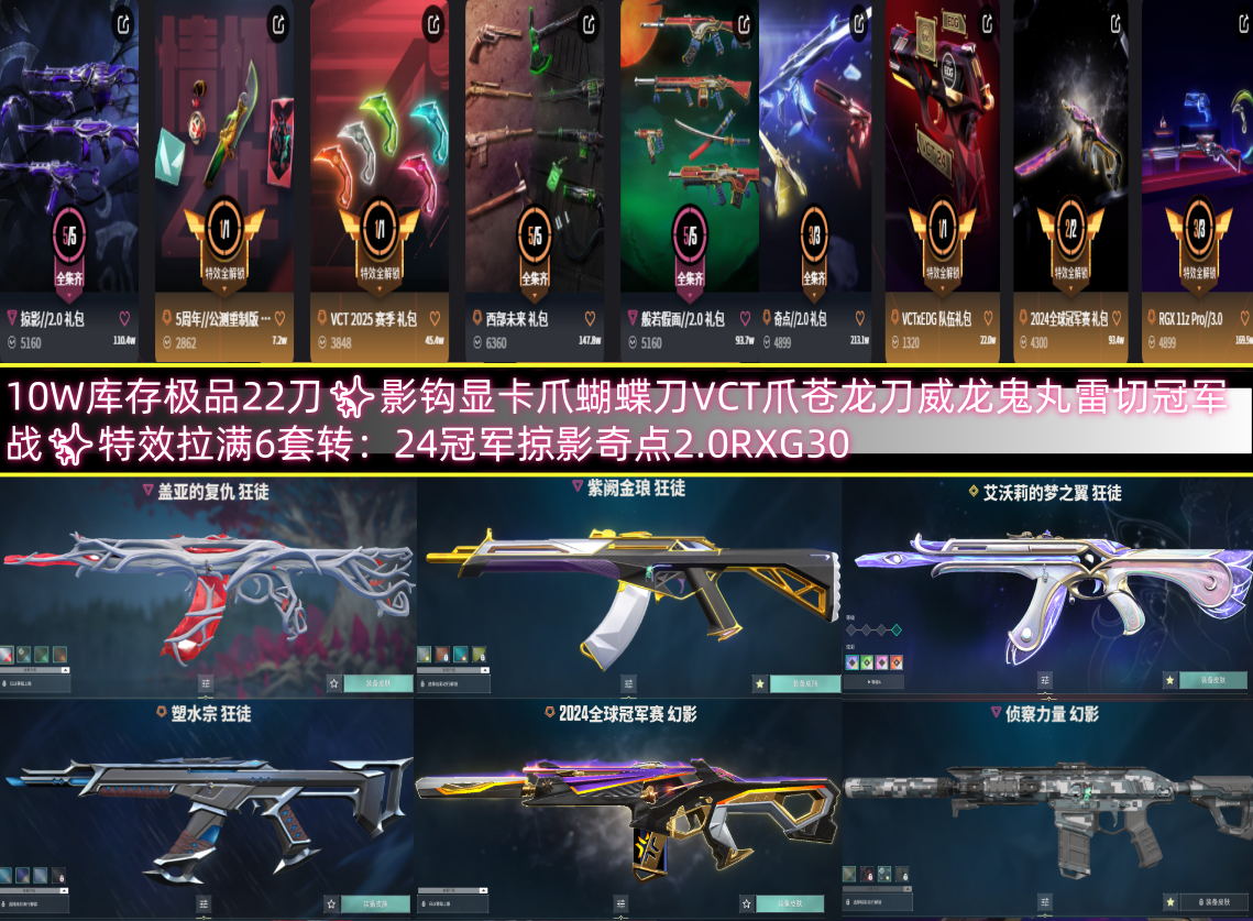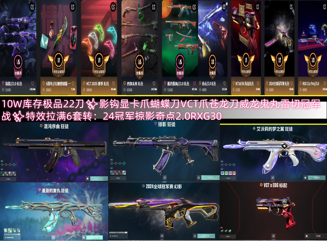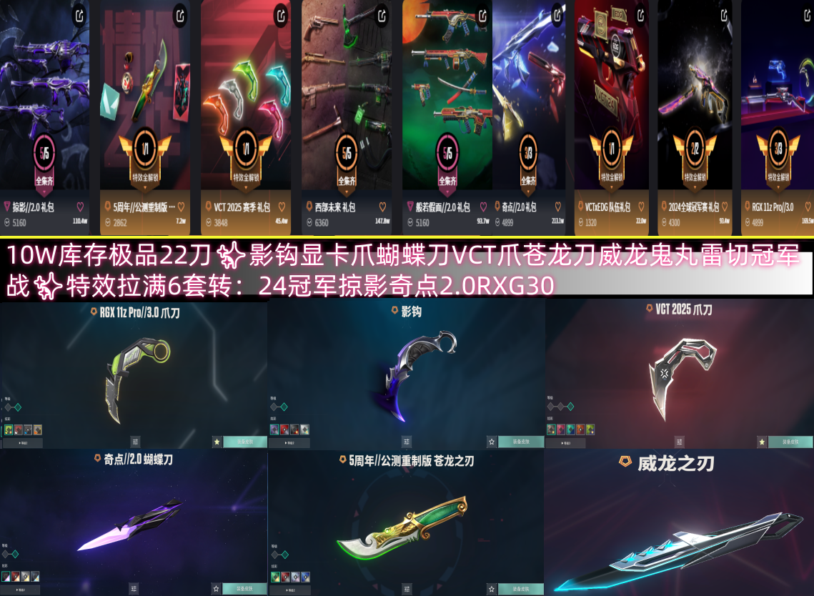 10万极品22刀✨显卡影钩蝴蝶刀苍龙威龙冠军战✨艾沃莉盖亚紫金混沌序曲噬影掠影20冠军侦察幻影6套装满特效;西部未来 奥丁,5周年//公测重制版 苍龙之刃,镭切,威龙之刃,VCT 2025 爪刀,盖亚的复仇 狂徒,虚空遗器 狂徒,