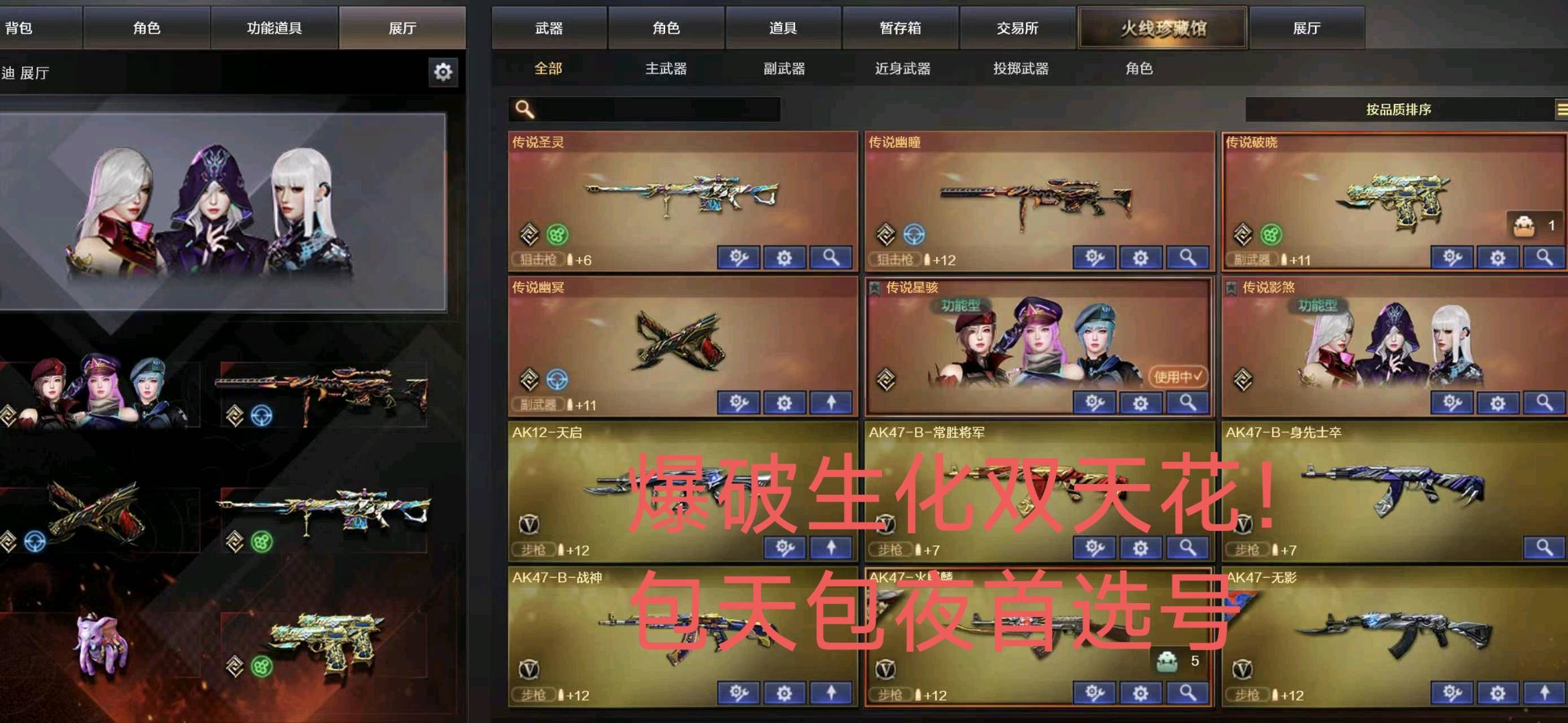 生化爆破满配号🔥双奇幻象➕四防影刹破晓➕六烈蝴蝶枪娘➕双蝶刃⭐六传说星骸幻神裁决三件套幻影⭐满副武