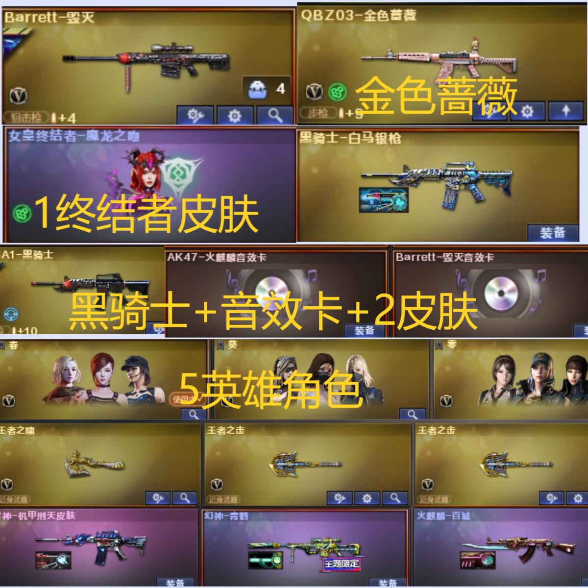 211v27王者18炫金可排位【雷暴套/M200幻神+幻神青鹤+幻神蓝粉色光效/荣耀世冠-雷神/Barrett-朱雀/HK417-朱雀/QBZ03-金色蔷薇/死亡之眼/5烈龙/9炼狱/盘龙/7修罗/天神/COP357-雷霆/2把USP雷暴/荣耀世冠-柯尔特/6套雷霆雷/7套雷暴雷/1套竞技荣光雷/死亡之眼-庆典/】【黑骑士音效卡/雷神音效卡/火麒麟音效卡/毁灭音效卡/白虎-盛典舞曲音效卡/炼狱-百战金芒-庆典舞曲音效卡/】【/毁灭-冠军之怒/火麒麟-冠军之心/雷神-荣耀之魄/毁灭-SV-CFPLS16冠军/毁灭-AG-CFPLS1I5冠军/雷神-白鲨-CFPLS14冠军/雷神-传奇N9/黑骑士-白马银枪/雷神-机甲刑天皮肤/火麒麟-百城/毁灭-神秘黑洞皮肤/雷神-能量核心/无影耀金皮肤/雷神-星空/黑龙-能量核心/极光-能量核心/天龙-秘银/黑龙-能量核心/火麒麟-雷神/AK47-B-常胜将军-孙权/修罗-能量核心/无影耀金皮肤/黑骑士耀金皮肤/毁灭耀金皮肤/AK47-火麒麟-传奇EVEN/AWM-天龙-传奇白鲨/火麒麟-CFSTAR/雷神-虎将/毁灭-黑大圣皮肤/火麒麟-平天大圣/AWM-天龙-传奇70KG/M4A1-黑龙-361/火麒麟-AG战队皮肤/修罗-CFSTAR/天龙-CF STAR/】【/春/葵/零/炫/魅影/王者-零/零.纪元/葵-阿尔法武装/修道士/樱-战斗天使/职业选手/】【/王者之心-觉醒版/王者之影/王者冰魄/王者之幻-觉醒版/王者之戮/王者之魄-觉醒版/王者之势-觉醒版/王者之武-觉醒版/王者之光/王者之力/王者之怒/王者之刺-觉醒版/王者之锋-觉醒版/王者之击-觉醒版/王者之啸-觉醒版/炫金火麒麟/炫金无影/炫金武士/炫金超新星/炫金黑龙/炫金雷神/炫金骑士/炫金毁灭/炫金天龙/火麒麟-绝迹/火麒麟-灵狐/裁决-雪莉杨/天龙-曼陀罗/C.A.T/COP旗袍/冰龙粉碎者-白马银枪/激光毁灭者III/巨龙咆哮III/神圣爆裂者-末日III/征服者-超越2/阐释者III/】【烟雾保护头盔长时效/超级护目镜/闪光护目镜长时效/战舰护目镜/透明头盔/战舰玩偶/超级背包3-7/炫彩背包/战舰水壶/战舰军袋/A+B背包套装扩展券/全背包/步枪弹匣长时效/永久防弹衣防弹头盔手雷包C4工具钳;USP-雷暴,荣耀世冠-柯尔特,炽芒蝶刃,RPK-盘龙,QBZ03-金色蔷薇,M200-幻神,Kar98K-星神,