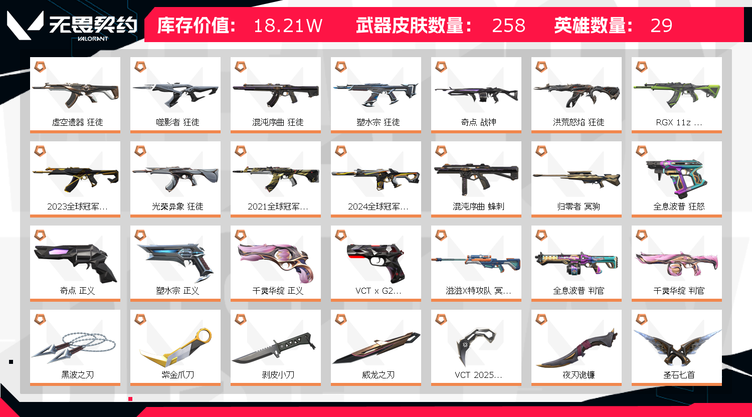 【拥有手枪】VCT-x-G2-标配,电音光谱-标配,虚空遗器-正义,混沌序曲-短炮,破败军械-鬼魅,塑水宗-正义,全息波普-狂怒,奇点-正义,天界神兵-鬼魅,紫阙金琅-标配,离子武器-正义,掠影-正义,星际猎兵-标配,阿特拉斯指挥部-标配,诡秘蛇影-鬼魅,神圣领域-狂怒,荒土机兵-标配,超限闪存-正义,超能偶像-标配,流星兵团-鬼魅,珍珠棘贝-狂怒,钢轨卫士-短炮,钢轨卫士-狂怒,弧光异彩-短炮,合金战车-正义,太空穿梭-正义,悠闲猫生-短炮,折光棱晶-标配,末日之翼-短炮,月球哨兵-正义,星云暗涌-鬼魅,纳米-正义,逆冲蛮牛-狂怒,浮光跃金-标配,模拟赫兹-鬼魅,聚合之力-狂怒,采蜜小蜂队-鬼魅,纤云弄巧-正义,战术熊与伙伴们-狂怒,战术熊与伙伴们-标配,纤云弄巧-短炮,复古浪潮-正义,深海水族-短炮,神罚-标配,光导纤维-鬼魅,光导纤维-标配,萌彩剪影-狂怒,胡桃狂想-鬼魅,彩梦之城-标配,信手涂鸦-鬼魅,数码咒术-鬼魅,花漾粉红-狂怒,;奇点 战神,黑波之刃,紫金爪刀,剥皮小刀,威龙之刃,VCT 2025 爪刀,虚空遗器 狂徒,