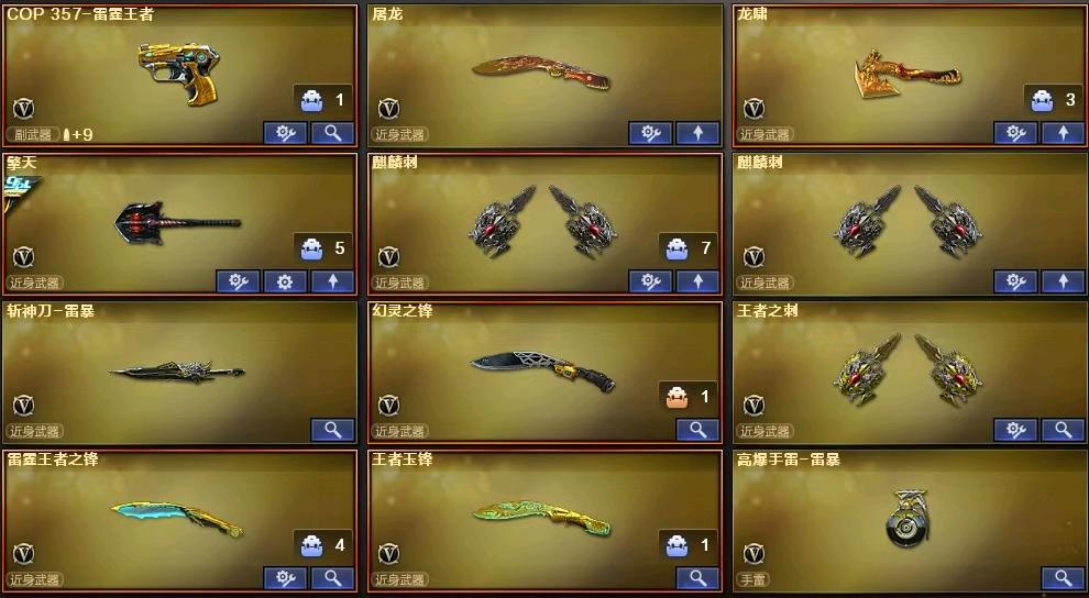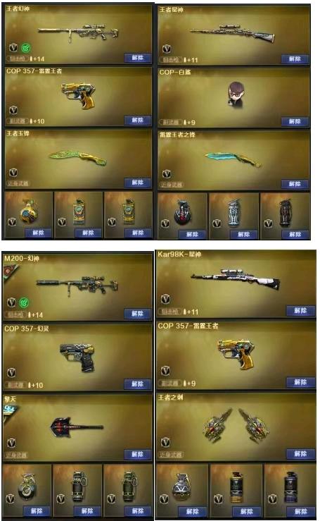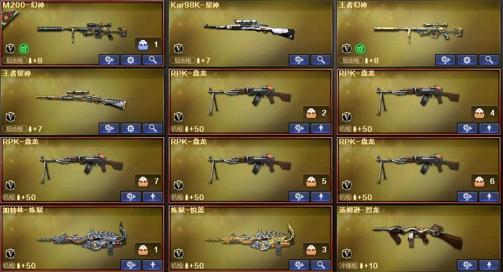 全能好基本什么都有;RPK-盘龙,QBZ03-金色蔷薇,M200-幻神,Scar Light-白虎,Kar98K-星神,