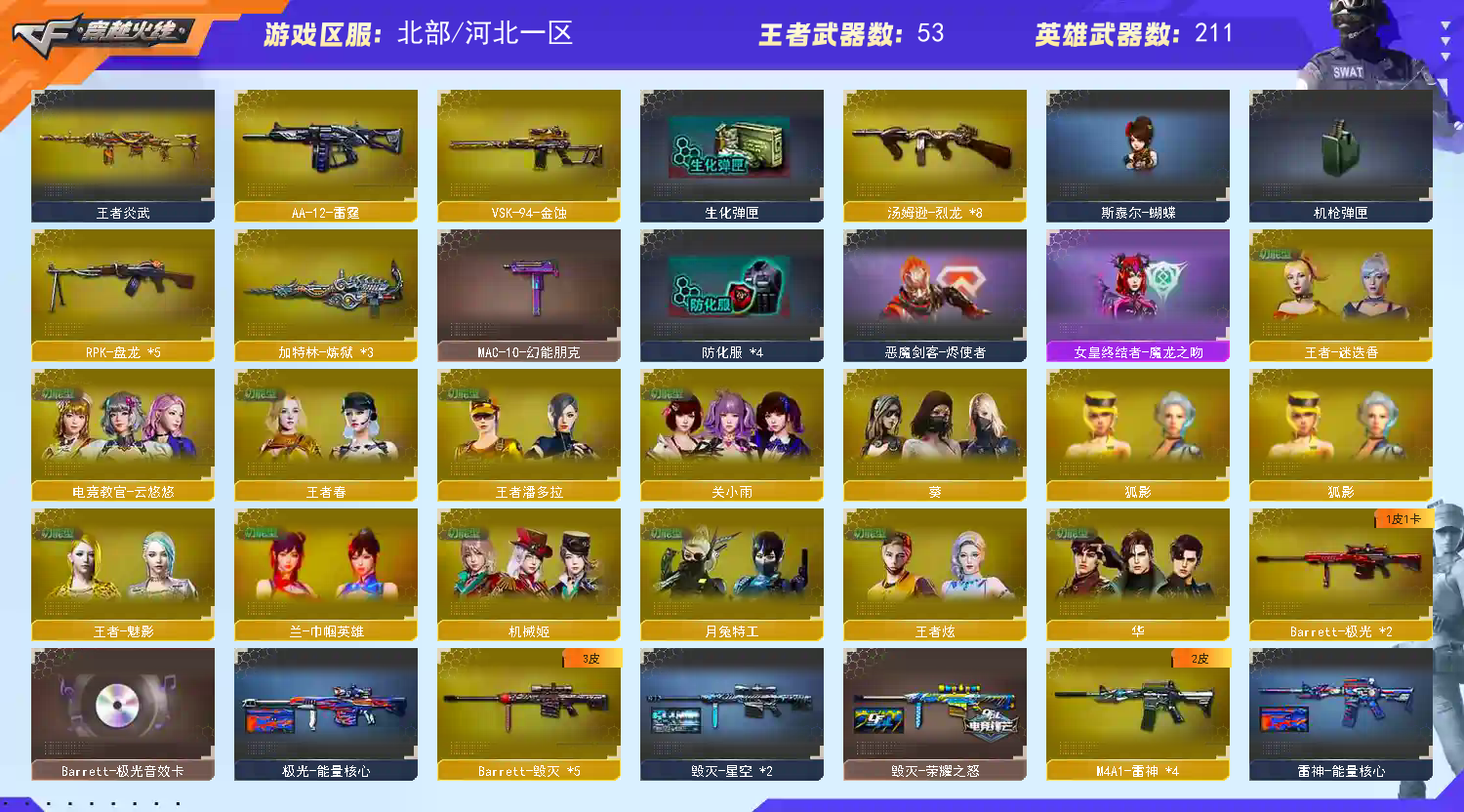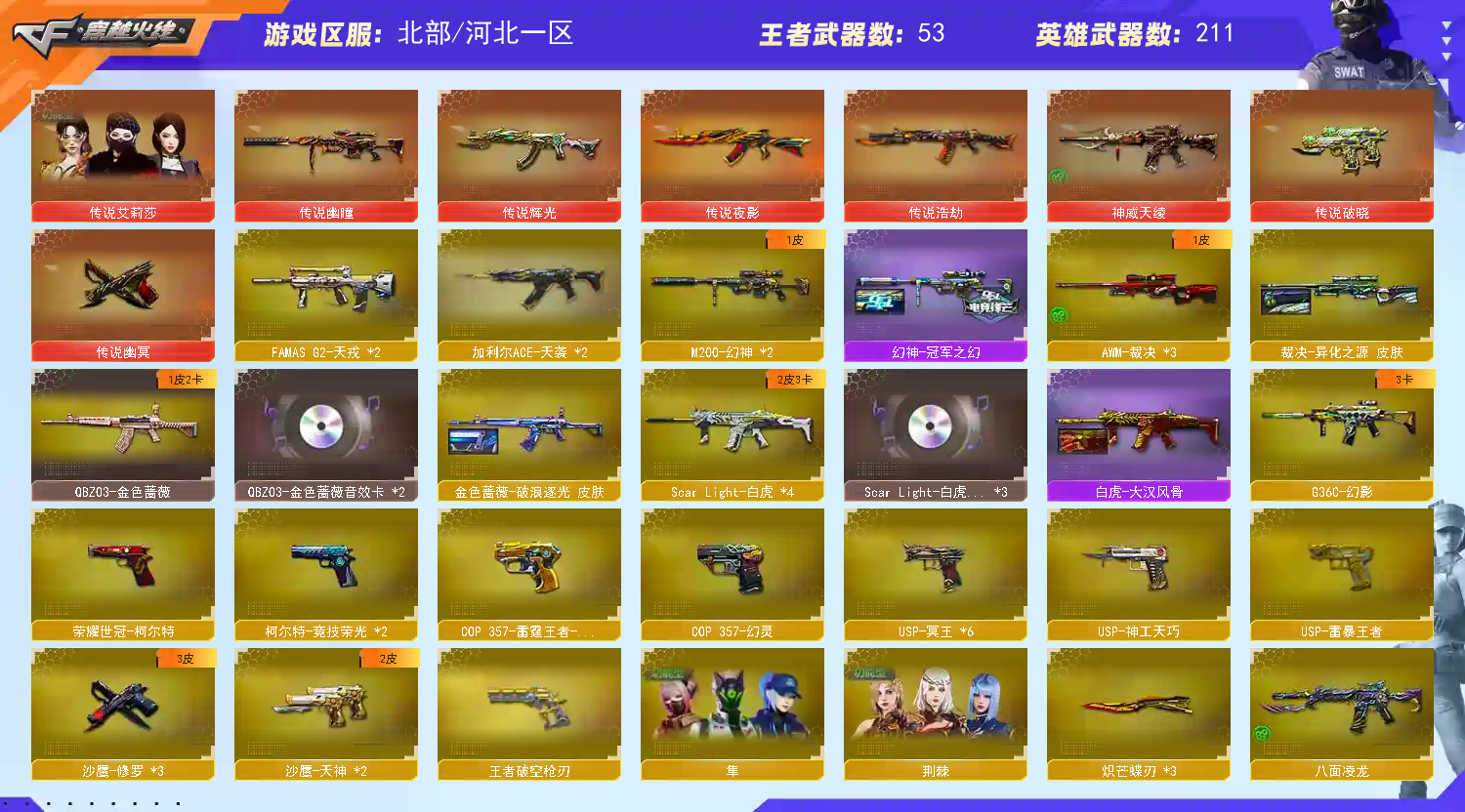 传说幽瞳 x1 传说辉光 x1 传说夜影 x1 M200-幻神 x1 AWM-裁决 x3 Barrett-极光 x3 Barrett-毁灭 x5 QBZ03-金色蔷薇 x1 Scar Light-白虎 x1 G36C-幻影 x1 八面凌龙;USP-雷暴王者,荣耀世冠-柯尔特,传说幽冥,炽芒蝶刃,隼,电竞教官-云悠悠,传说艾莉莎,