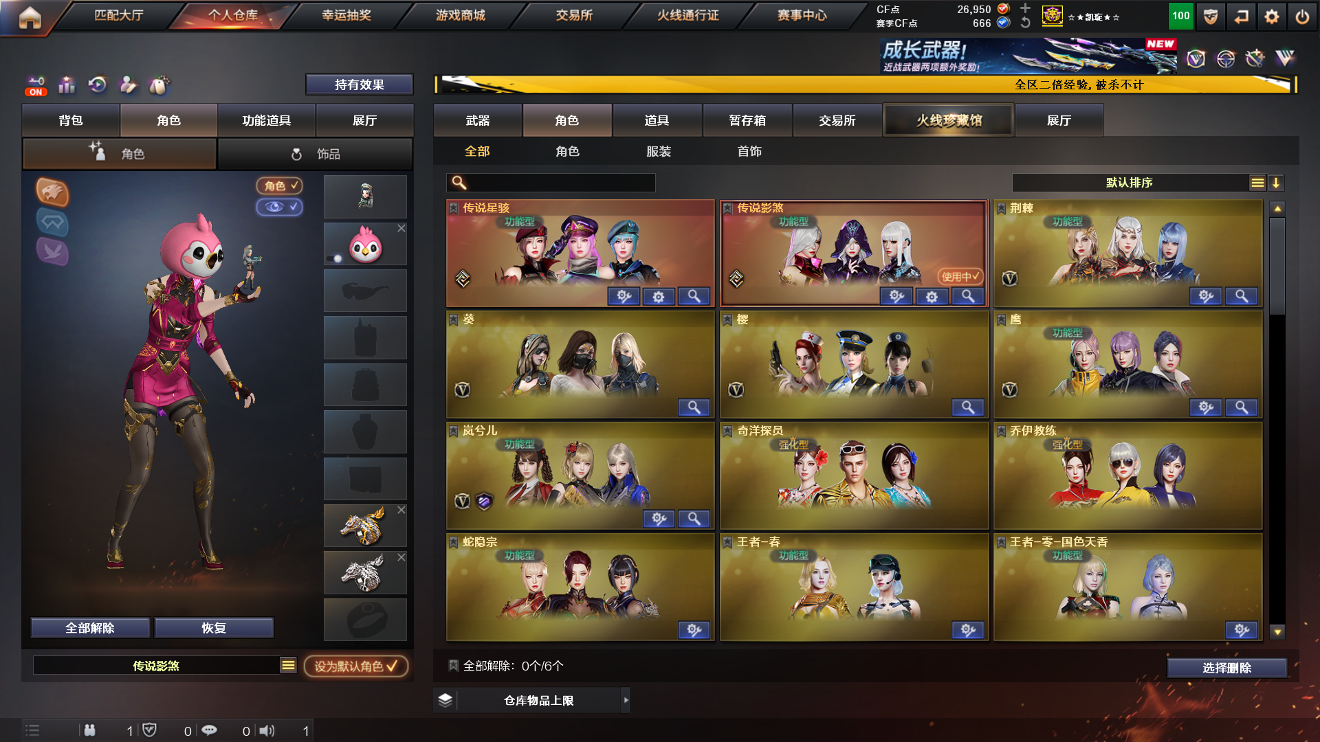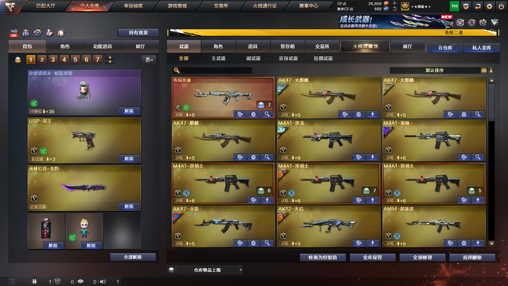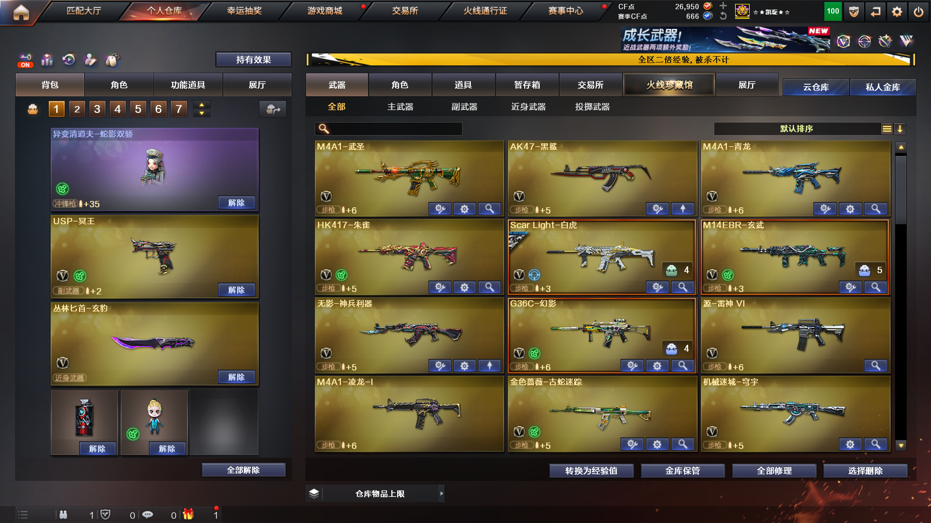 传说圣谕/影刹/星骇/荆棘/冠军幻/星神三皮/冠军之刃×2/六烈清道夫小人枪×2/裁决三件套冥王;Knife-冠军之刃,传说影煞,传说星骇,QBZ03-金色蔷薇,G36C-幻影,M200-幻神,Scar Light-白虎,