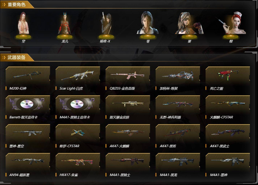 【上海一区/95V/vip1】【堕天神套/6烈龙/6修罗】【M200-幻神】【Scar Light-白虎】【QBZ03-金色蔷薇*5】【M4A1-雷神/雷神-星空】【COP-堕天神】【Barrett-毁灭*4/Barrett-毁灭音效卡/毁灭耀金皮肤】【AK47-火麒麟/火麒麟-CFSTAR】【M4A1-黑骑士/M4A1-黑骑士音效卡】【M4A1-黑龙】【HK417-朱雀】【无影-神兵利器】【AK47-黑武士/黑武士-锦绣游龙】【天龙-CFSTAR】【AWM-裁决】【M4A1-死神】【汤姆逊-烈龙*7】【加特林-炼狱*2】【死亡之眼】【沙鹰-修罗*6/修罗-CFSTAR】【麒麟刺】【擎天*3】【屠龙*4】【龙啸-堕天神*2】【迷迭香/龙儿/暗夜-X/木兰/兔囡囡/麻雀/灵狐者-黄金海岸/妲己/娟娟/斯沃特-X/铁骑荣耀/堕天使/复仇者】【M4A1-堕天神】【AK47-B-战士/AK47-B-战神/AK-47-猩红传说*9】【AK47-黑鲨*3】【AN94-超新星*3/超新星-悦享】【Barrett-暗月传说*2】【Colt1911-小故障/Colt 1911-大黄蜂*2/新USP-枪王排位奖励*5】【激光毁灭者III-白马银枪/阐释者III/征服者】【巴雷特-零-水下丽影】【闪光弹-雷暴/烟雾弹-雷暴】【高爆手雷-堕天神*6/闪光弹-堕天神*6/烟雾弹-堕天神*6】【炫金无影*4/炫金黑龙*3】【透明头盔/闪光护目镜/超级背包/炫彩背包/防弹头盔*4/防弹衣*5/C4工具钳*3/手雷包*5/防化服*3】;RPK-盘龙,QBZ03-金色蔷薇,M200-幻神,Scar Light-白虎,