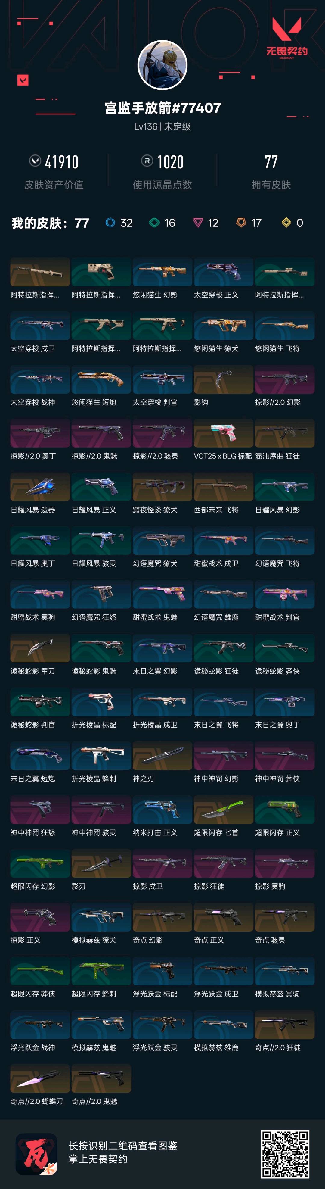皮肤总价值41910,未定级,总皮肤77,刀皮8枪皮69(传奇9卓越12),套装4(传奇1卓越3),奇点2.0套装,具体详情看图;掠影 戍卫,掠影 狂徒,混沌序曲 狂徒,西部未来 飞将,奇点 正义,掠影 正义,