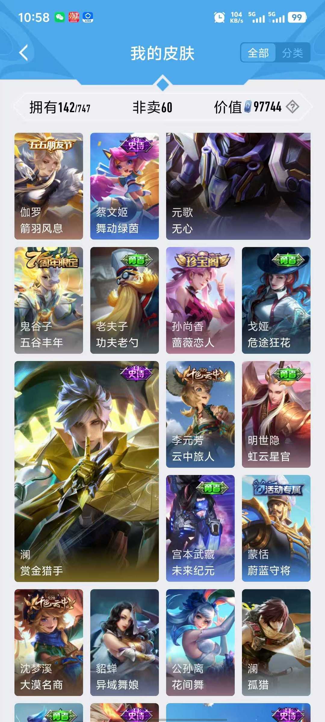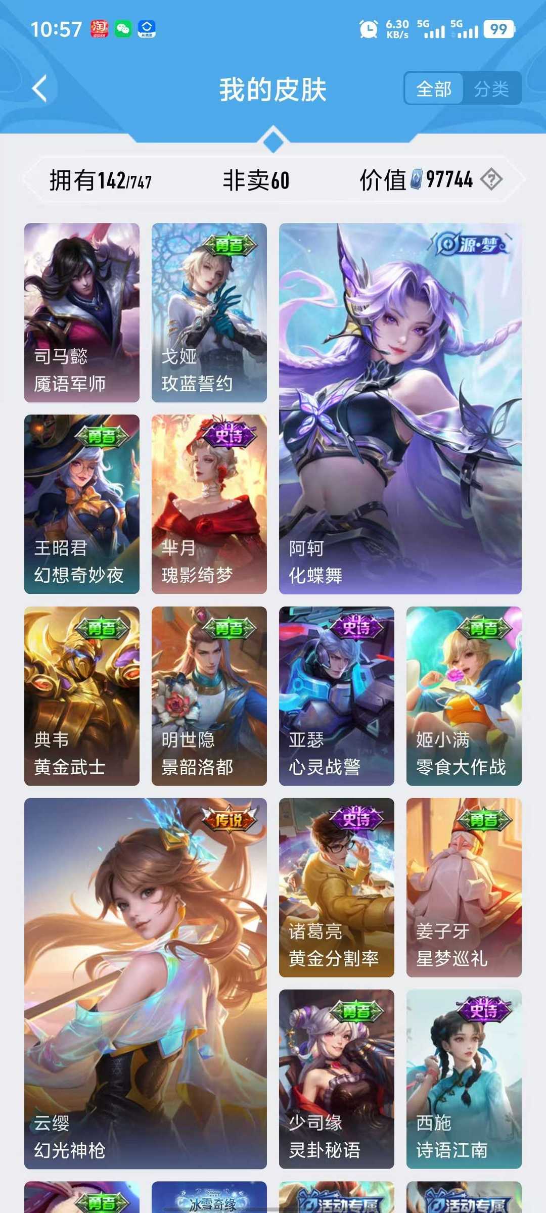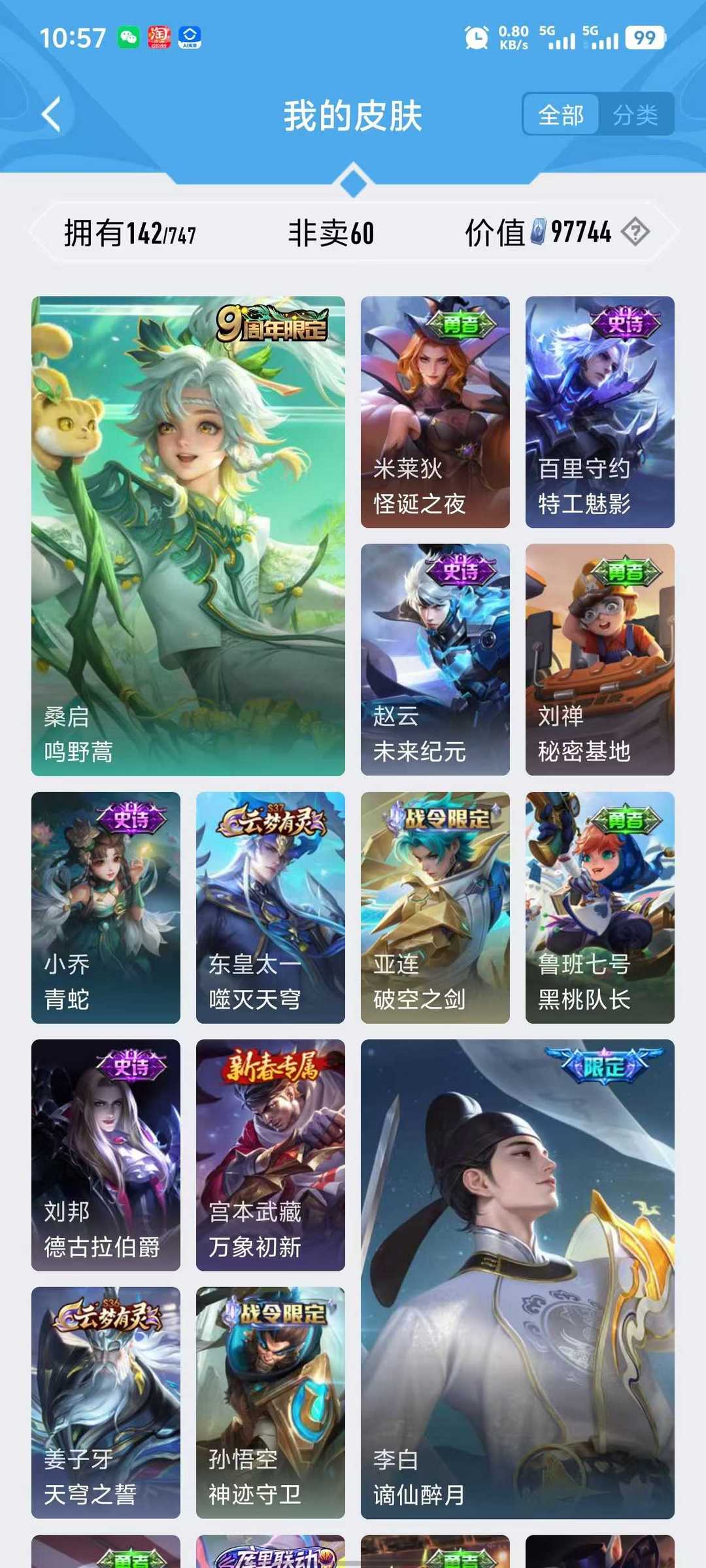 v10、12水539皮、死亡执政官、刘备星传说时之思念、小兵皮肤大耳狗甜茶、瑶无双真我赫兹、愿照·九州拓、怪盗基德、画中仙、至尊宝、凤求凰、神威、天魔缭乱