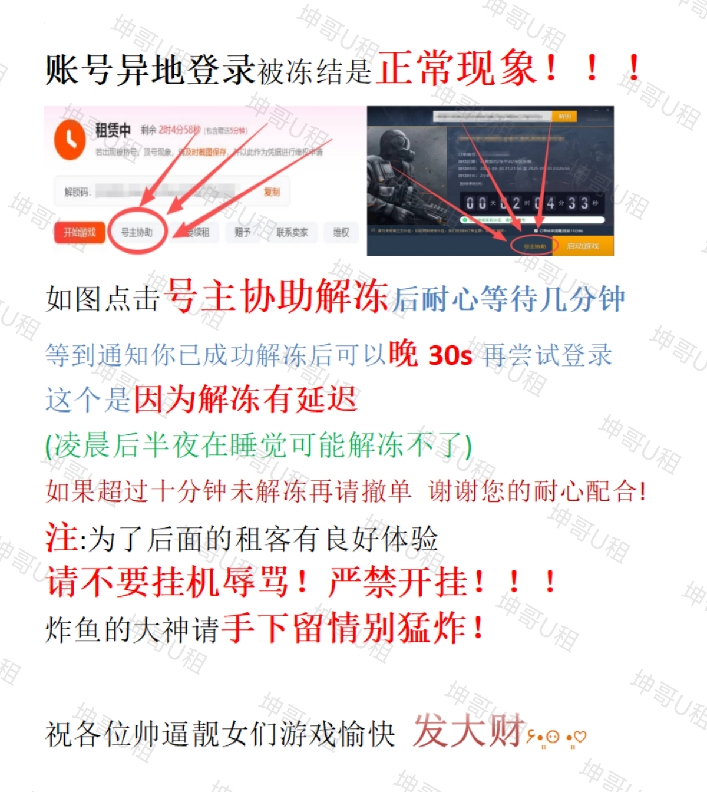 【如遇WeGame被挤】是号主在玩其他游戏 你租赁的游戏是不会掉线的 请勿撤单 谢谢老板 【如遇冻结】(在租号订单处点解除冻结后)请耐心等待三五分钟后重新上号试试 若我们还未解冻再劳烦撤单 感谢老板耐心配合 【请勿挂机】请老板耐心打完每一把不要中途退出挂机毁号 发现挂机对应订单将永久拉黑!!! 一:登录时,异地登录请多尝试几次。 如果因为上号器问题,无法正常登录,也请撤下单。 如果发生掉线,或者修改密码,是因为多次异地登录导致账号冻结,不是恶意顶号 二:不要消极游戏,送人头挂机,导致封号拉黑名单,提交客服处理 三:请素质游戏不要乱动游戏点券道具及好友 发现乱搞永久拉黑再也不见!!! 四:好用请收藏,收藏不迷路,不赚钱交个朋友,请不要挂机,喷队友。 五:希望不要挂机,导致号主锁单也会影响游戏体验。 六:队友打的不好,恳请谅解,请不要直接谩骂导致封禁/禁言等。 七:游戏中与您自称号主的人一律是骗子!!! 谨防诈骗!!!谨防诈骗!!!谨防诈骗!!!;