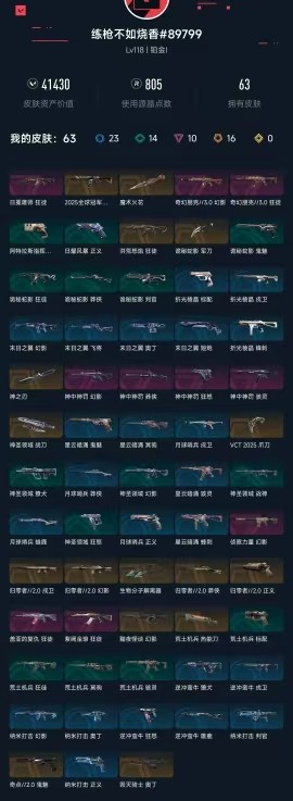 可排位 英雄27 武器皮肤数量63;VCT 2025 爪刀,盖亚的复仇 狂徒,洪荒怒焰 狂徒,侦察力量 幻影,紫阙金琅 狂徒,