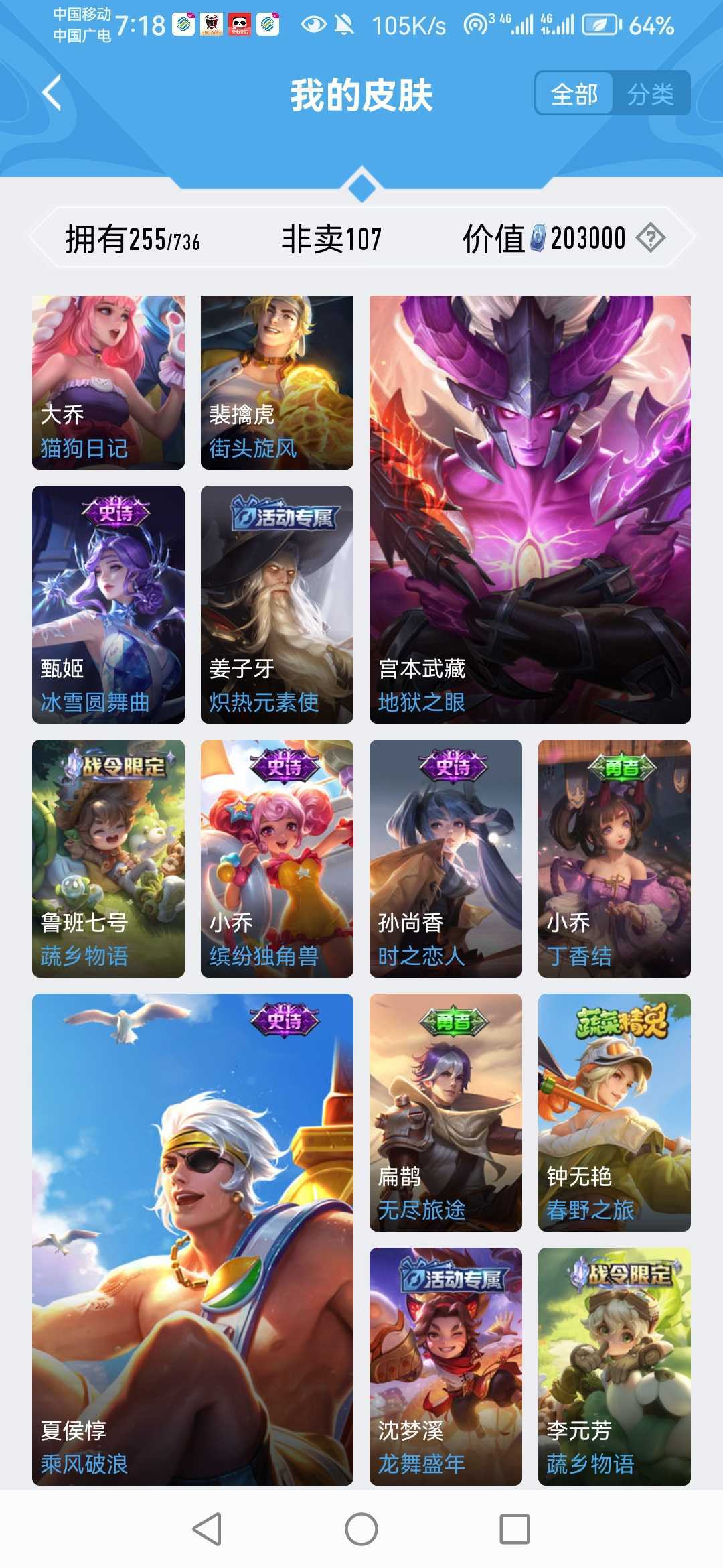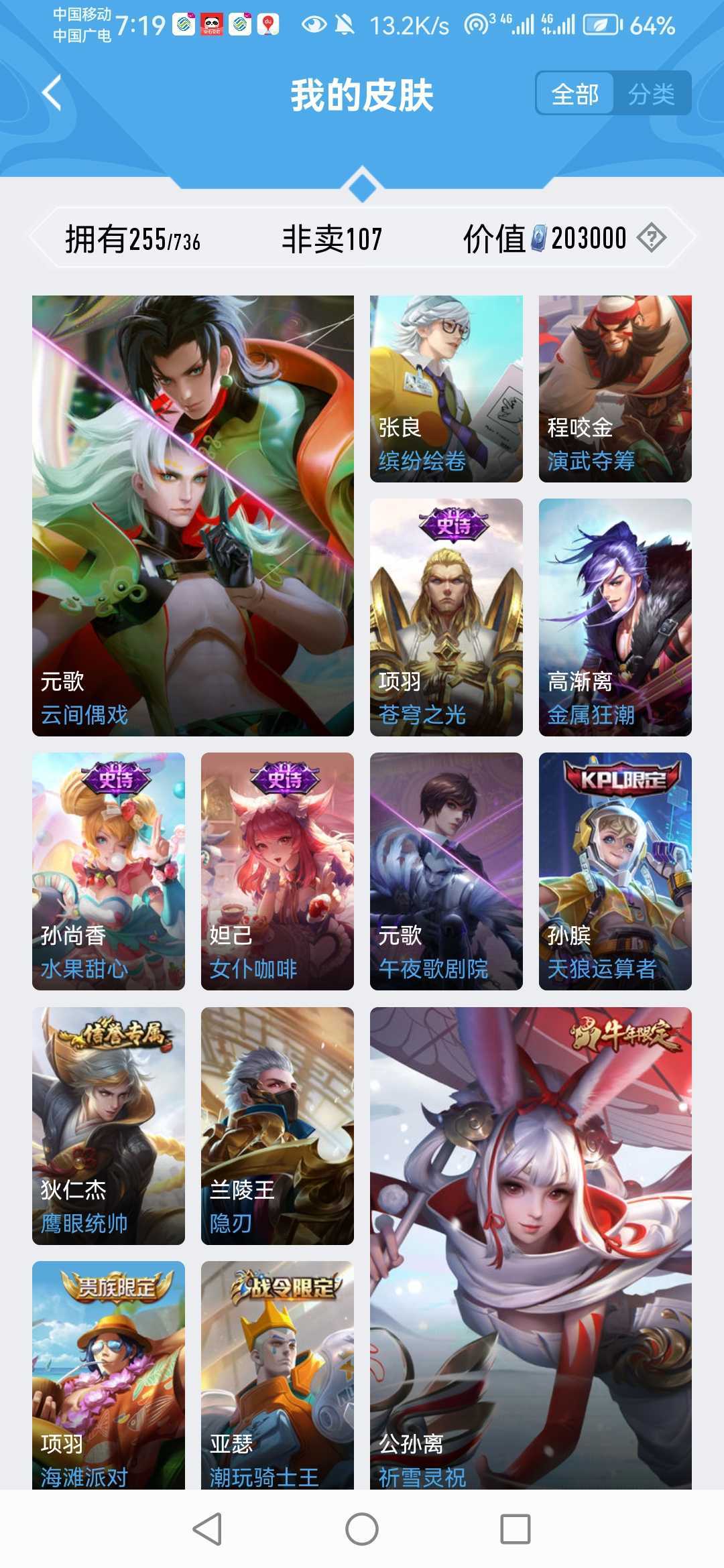 【非云直上】V10★皮肤榜一★539皮满典藏★鲁班时之奇旅会员★虞姬黛羽霜翎星元★吕布白金战神★全能大师★多金标★个性按键
