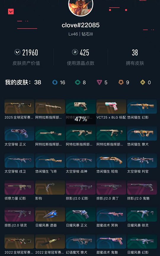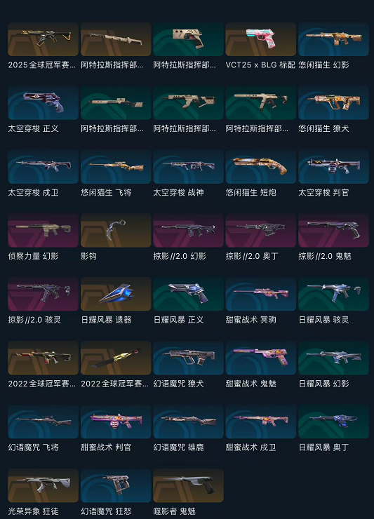 2.1万资产25冠军狂徒影钩掠影套22冠军套噬影者鬼魅光荣异象狂徒日耀风暴遗器VCT标配;侦察力量 幻影,光荣异象 狂徒,