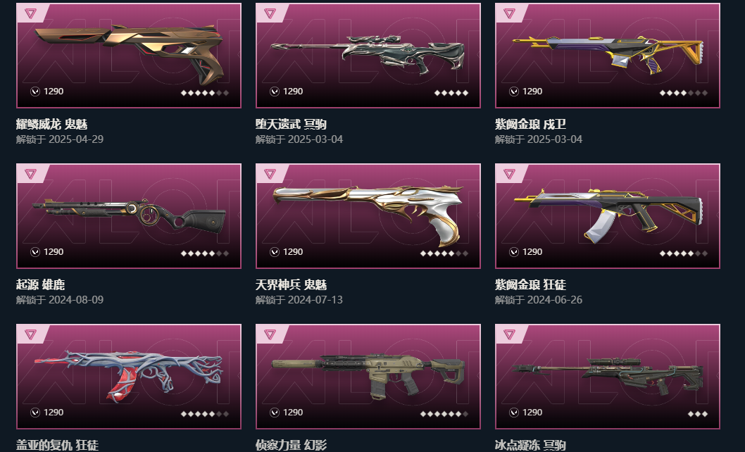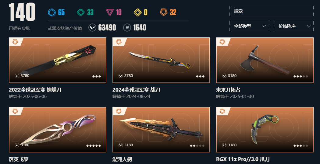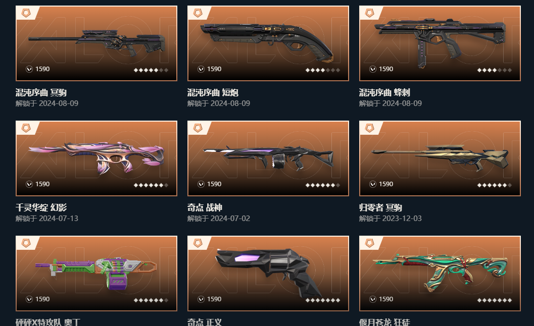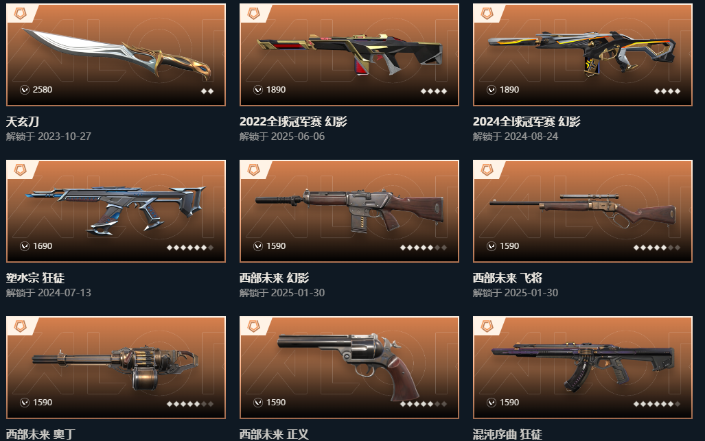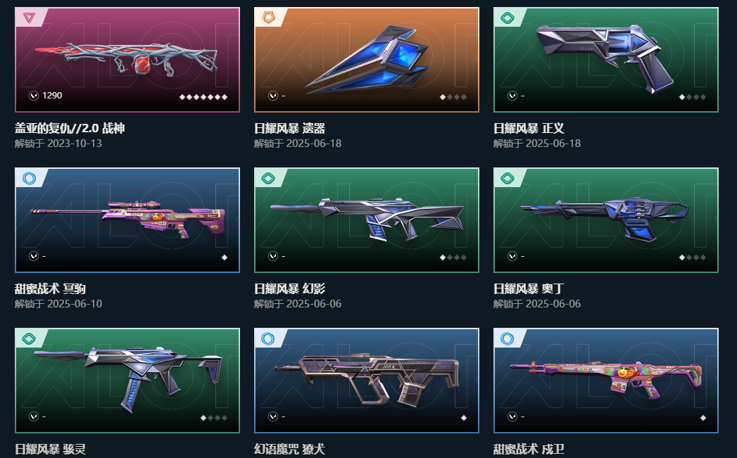 wegame无畏契约★ 刀皮数量14 枪皮数量126 限定32 尊爵10 日耀风暴 正义,幻语魔咒 狂怒,甜蜜战术 鬼魅,耀鳞威龙 鬼魅,神圣领域 狂怒,月球哨兵 正义,西部未来 正义,纳米打击 正义,荒土机兵 标配,逆冲蛮牛 狂怒,超限闪存 正义,扑棱扑棱 鬼魅,模拟赫兹 鬼魅,浮光跃金 标配,VCT x JDG 标配,混沌序曲 短炮,超能偶像 标配,聚合之力 狂怒,采蜜小蜂队 鬼魅,天界神兵 鬼魅,战术熊与伙伴们 标配,纤云弄巧 短炮
