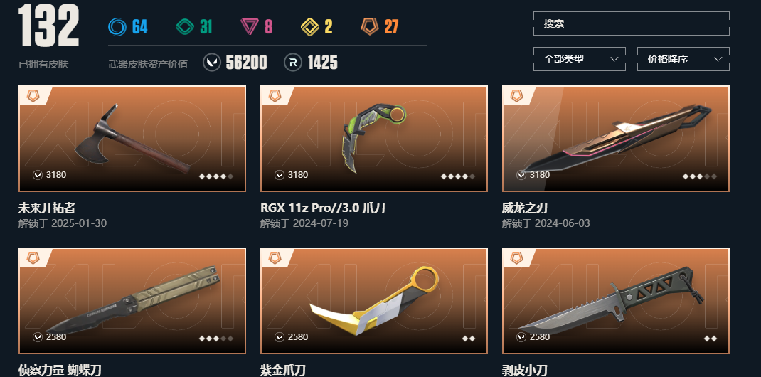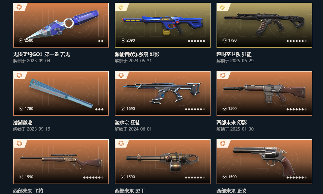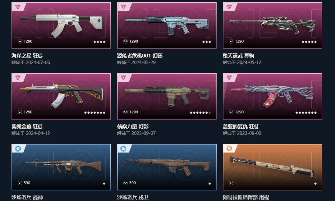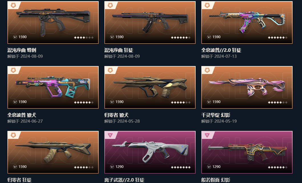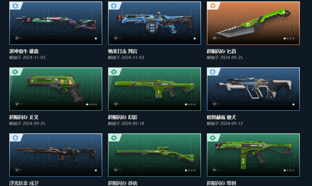 wegame无畏契约★ 刀皮数量15 枪皮数量117 限定27 究极2 尊爵8 阿特拉斯指挥部 标配,太空穿梭 正义,悠闲猫生 短炮,诡秘蛇影 鬼魅,折光棱晶 标配,末日之翼 短炮,星云暗涌 鬼魅,神圣领域 狂怒,月球哨兵 正义,西部未来 正义,纳米打击 正义,荒土机兵 标配,逆冲蛮牛 狂怒,超限闪存 正义,浮光跃金 标配,模拟赫兹 鬼魅,超能偶像 标配,聚合之力 狂怒,采蜜小蜂队 鬼魅,流星兵团 鬼魅,纤云弄巧 正义,战术熊与伙伴们 标配