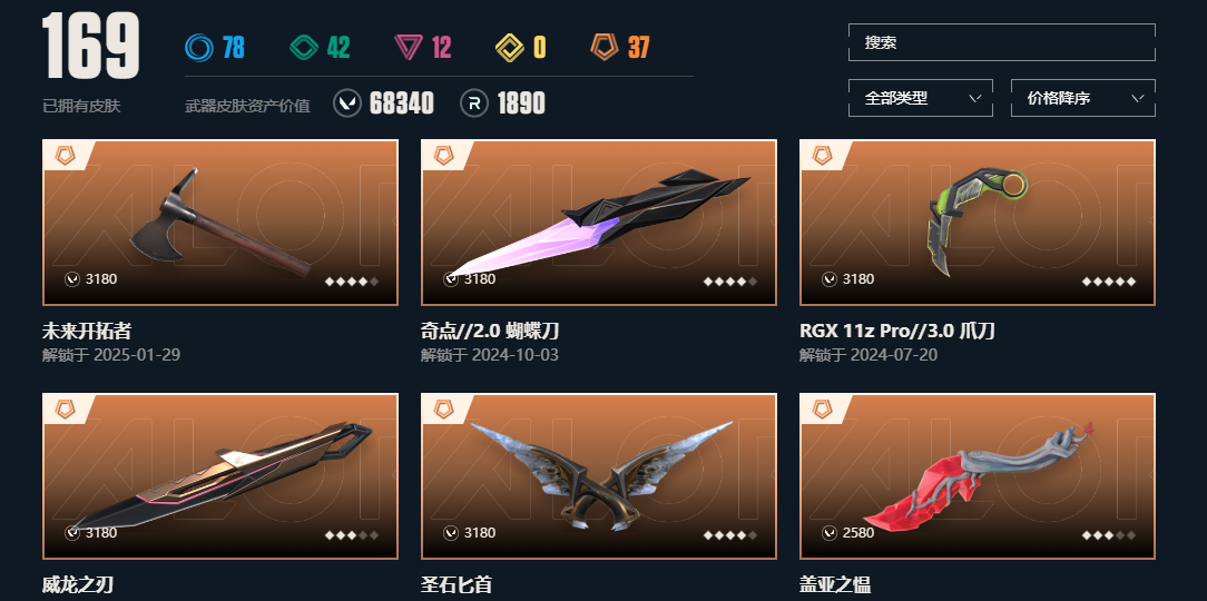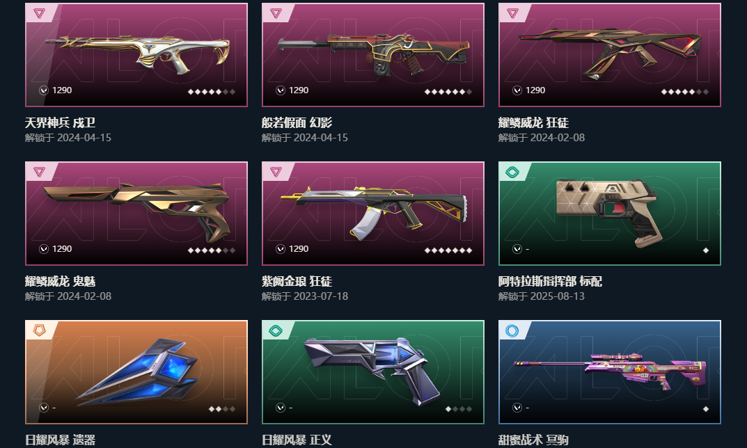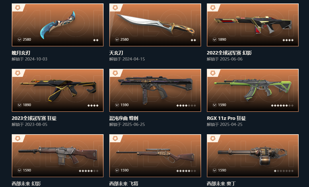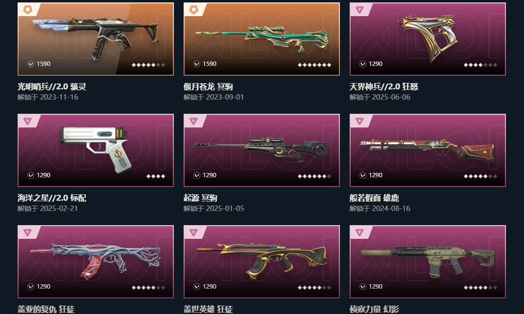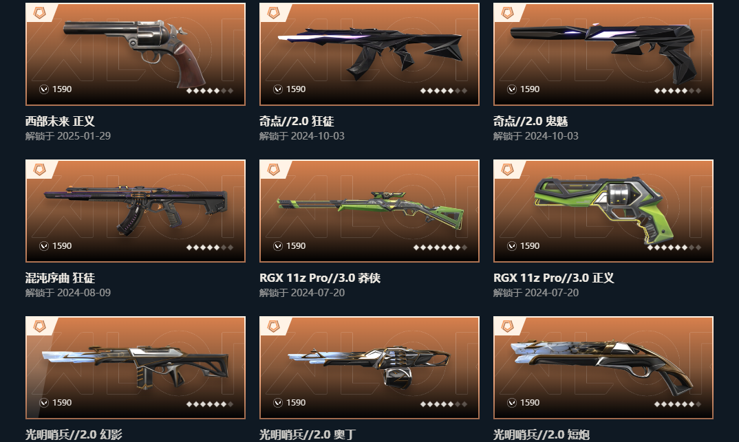 wegame无畏契约★ 刀皮数量18 枪皮数量151 限定37 尊爵12 阿特拉斯指挥部 标配,日耀风暴 正义,天界神兵//2.0 狂怒,甜蜜战术 鬼魅,幻语魔咒 狂怒,诡秘蛇影 鬼魅,折光棱晶 标配,末日之翼 短炮,海洋之星//2.0 标配,星云暗涌 鬼魅,西部未来 正义,神圣领域 狂怒,月球哨兵 正义,超限闪存 正义,浮光跃金 标配,模拟赫兹 鬼魅,奇点//2.0 鬼魅,超能偶像 标配,聚合之力 狂怒,采蜜小蜂队 鬼魅,RGX 11z Pro//3.0 正义