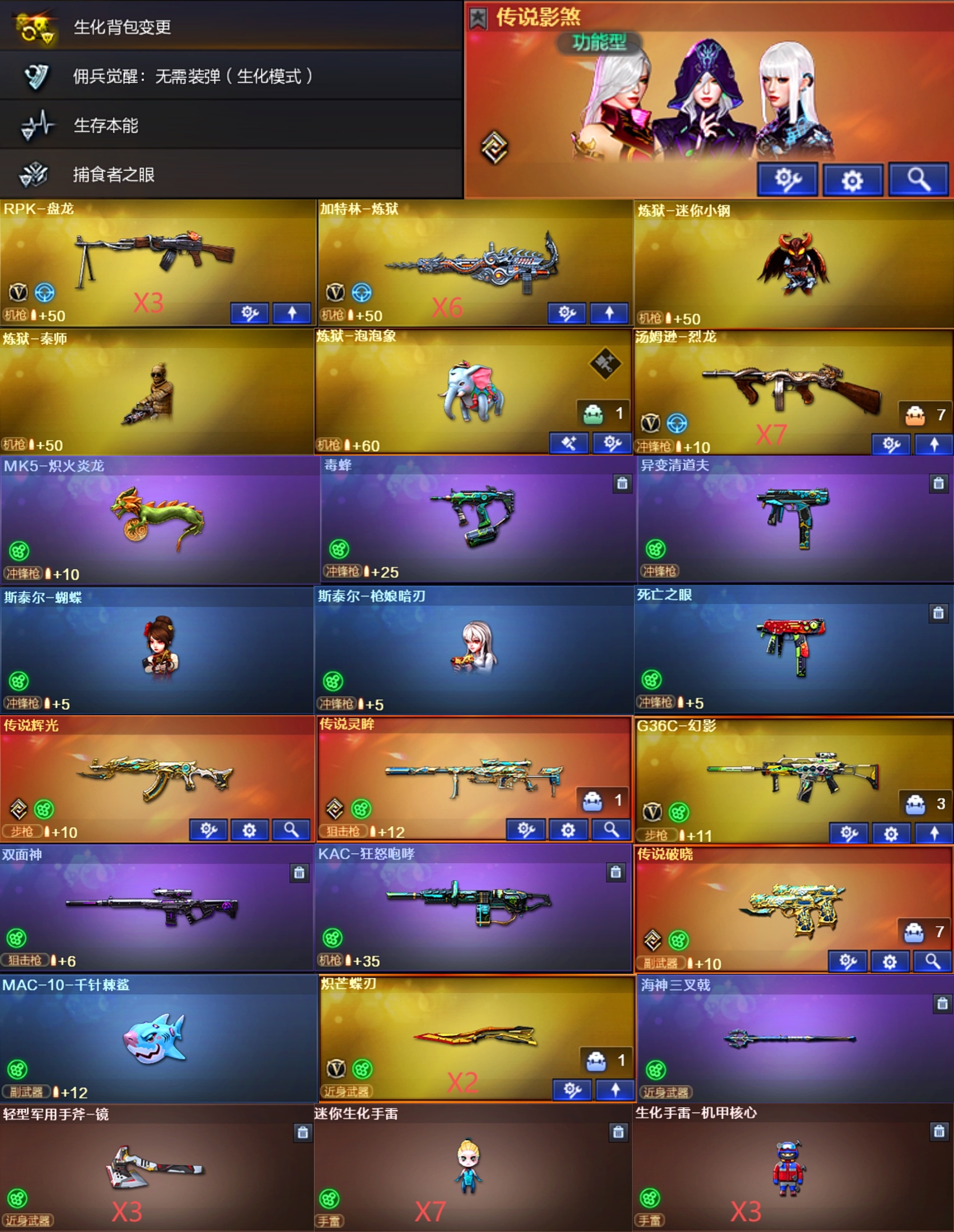 生化天花板 传说影煞 6盘6烈 泡泡象 毒蜂 蝴蝶 枪娘 双面神 双炽芒蝶刃 可爆破可生化全装