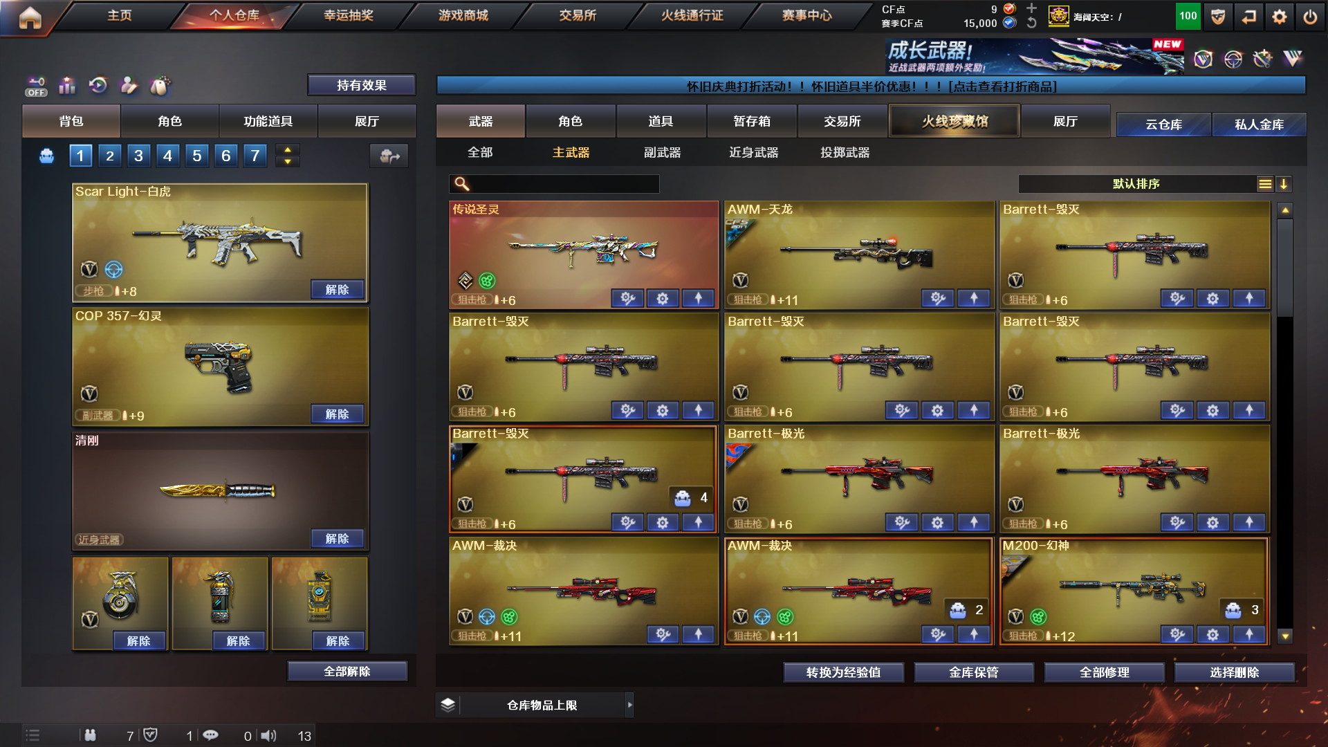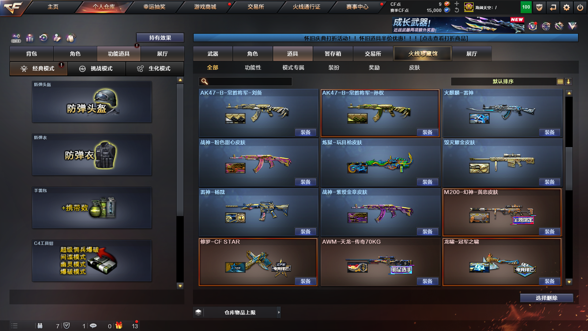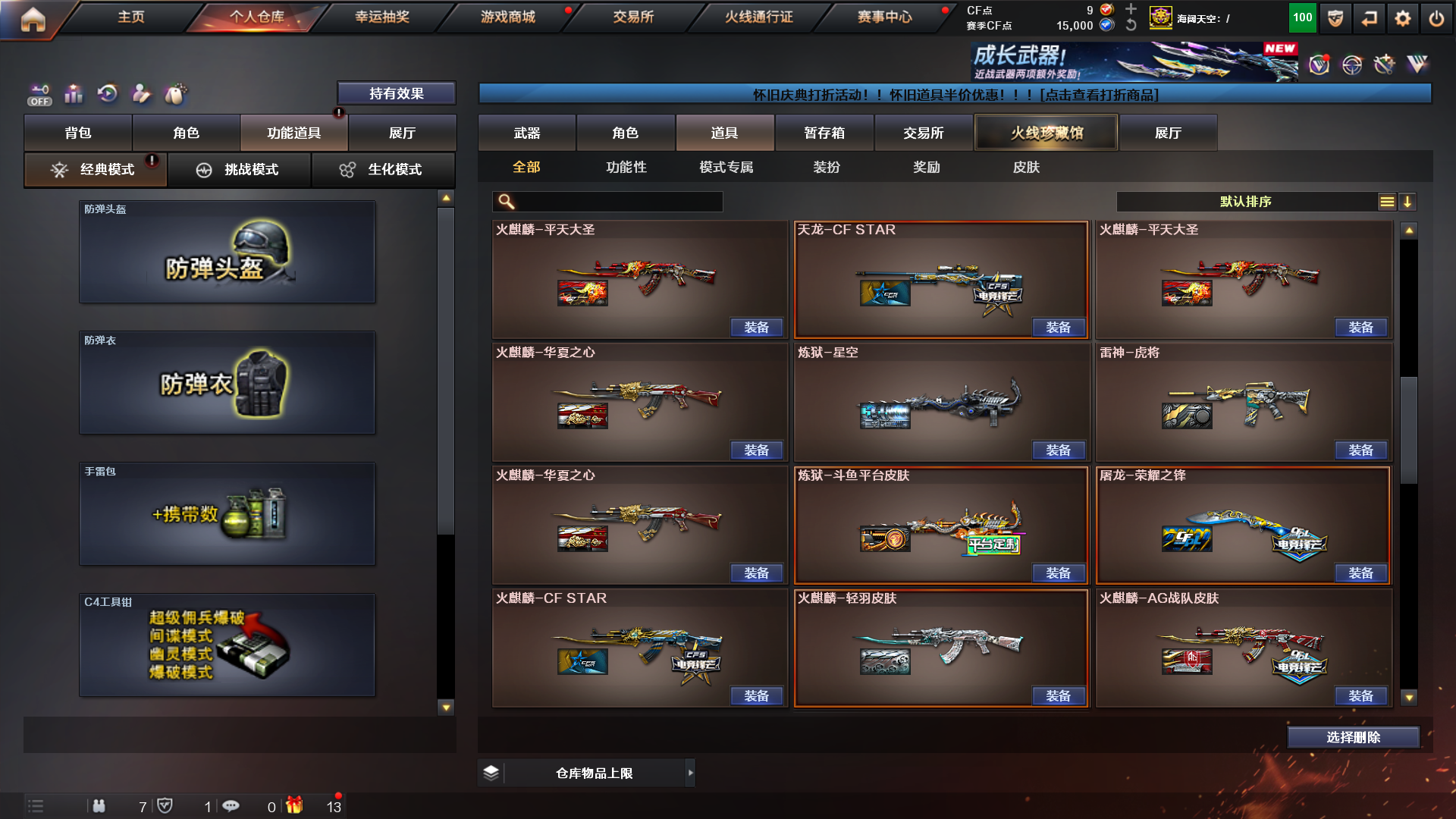 双全装、传说影煞、毒奎术士、沙漠玫瑰、炽芒蝶刃、6烈蝴蝶➕枪娘暗刃、6盘斗鱼炼狱、传说光耀、传说圣灵、传说幽冥、猫猫手套白鲨、cop堕天神、cop幻灵、裁决➕音效卡;荣耀世冠-柯尔特,传说幽冥,炽芒蝶刃,沙漠玫瑰,传说影煞,RPK-盘龙,QBZ03-金色蔷薇,