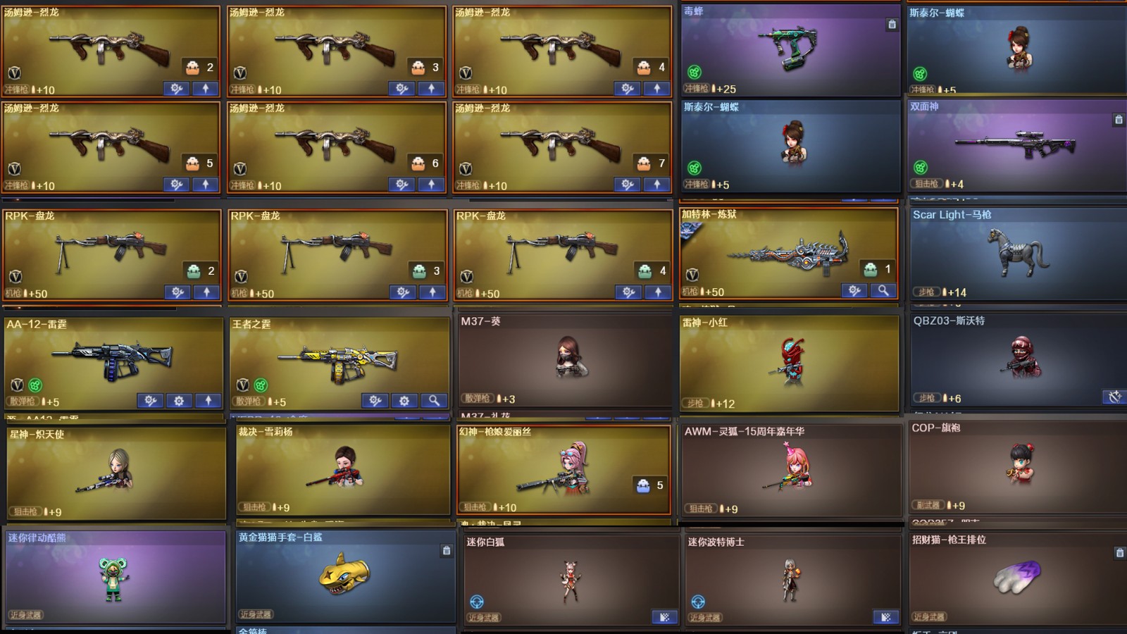 王者武器:炫金黑龙;炫金雷神;王者青龙;高爆手雷-雷霆王者;COP 357-雷霆王者-觉醒版;王者冰锋;M4A1-雷霆王者-觉醒版;QBZ-03-王者蔷薇-觉醒版;王者玄武;王者凛烈;烟雾弹-雷霆王者-觉醒版;王者之光-觉醒版;王者之力-觉醒版;王者之势-觉醒版;王者之霆;王者星霆;王者幻神-觉醒版;王者霜心;闪光弹-雷霆王者-觉醒版;雷霆王者之锋-觉醒版;凤吟之魄;王者星光;青龙之魄 英雄武器:M4A1-死神;M4A1-黑骑士;屠龙;麒麟刺;AK47-火麒麟;Barrett-毁灭;汤姆逊-烈龙;Barrett-极光;RPK-盘龙;沙鹰-修罗;加特林-炼狱;沙鹰-天神;M4A1-雷神;M4A1-黑龙;M200-幻神;USP-雷暴;高爆手雷-雷暴;闪光弹-雷暴;烟雾弹-雷暴;斩神刀-雷暴;M200-竞技荣光;传说辉光;幻灵之锋;恶棍-电竞装甲;擎天-竞技荣光;柯尔特-冠军之特;机械迷城-穹宇;柯尔特-竞技荣光;烟雾弹-竞技荣光;闪光弹-竞技荣光;高爆手雷-竞技荣光;Scar Light-白虎;高爆手雷-夜魔;马来剑-夜魔;破空枪刃-夜魔;闪光弹-夜魔;烟雾弹-夜魔;炽芒蝶刃;无影-神兵利器;AA-12-雷霆;QBZ03-金色蔷薇;Barrett-碧霄极光;FAMAS G2-天戎;USP-冥王;M4A1-仙界-黑骑士;传说幽瞳;HK417-朱雀;M4A1-雷神-精英刀锋;M4A1-十二生肖·龙-雷神;G36C-幻影;QBZ03-天罚;传说幽冥;柯尔特-荣耀世冠白鲨2023;柯尔特-无冕之王;Kar98K-星神;黑武士-锦绣游龙;云龙扇;烟雾弹-云龙;闪光弹-云龙;擎天;AWM-裁决;高爆手雷-堕天神;龙啸-堕天神;麒麟刺-堕天神;闪光弹-堕天神;烟雾弹-堕天神;传说圣谕;COP 357-幻灵;M4A1-幻灵;传说梦魇;传说破晓;闪光弹-幻灵;雷霆之锋;高爆手雷-幻灵;龙啸-烈火龙威;AK47-黑鲨 主武器:M4A1-雷神;源·Barrett-朱雀;魂·雷神-维纳斯;魂·雷神-萌柴;M4A1-仙界-黑骑士;魂·毁灭-秦师;源·天启;魂·Barrett-朱雀-醒狮;魂·天神-宇航兔兔;源·无影;魂·黑骑士-娜塔莉娅;源·武圣;M4A1-十二生肖·龙-雷神;源-金色蔷薇;M4A1-雷神-精英刀锋;源-黑龙;源·AA12-雷霆;源·玫瑰精灵;源·机械迷城;魂·雷神-诺拉;魂·Barrett-金色蔷薇-蛇姬;魂·QBZ03-金色蔷薇-蛇姬;魂·炼狱-玩具枪;王者玄武;灵·QBZ03-金色蔷薇-嘉年华;幻神-枪娘爱丽丝;玄武-枪娘火莲;魂·裁决-凤灵;魂·HK417-朱雀-凤灵;凤吟之魄;源·炼狱;魂·炼狱-月;加特林-炼狱-掌火;魂·9A91·烈火-电子连击;王者霜心;王者之霆;王者凛烈;魂·裁决-羽掣;魂·M4A1-雷神-化蛇;VSK-94-金蚀;炫金黑龙;炫金雷神;G36C-幻影;无影-神兵利器;青龙之魄;王者星霆;黑鲨-律动黄昏;王者青龙;源·天龙;QBZ03-文殊坊;魂·毁灭-墨兰;源-极光 副武器:沙鹰-天神;灵·天神-穹宇;魂·天神-维纳斯;COP 357-雷霆王者-觉醒版;源·武圣glock;魂·天神-阿努比斯 近身:擎天;灵·屠龙-嘉年华;灵·麒麟刺-穹宇;魂·龙啸-醒狮;夺魂;魂-麒麟刺-萌杀;龙啸-烈火龙威 装饰品:擎天-秘银;黑骑士-暗月;毁灭-暗月;黑龙-能量核心;修罗-能量核心;王者刀锋玩偶;击杀图标-恶灵;击杀图标-圣诞;击杀图标-万圣;AWM-天龙-传奇白鲨;火麒麟-冠军之心;炽芒蝶刃-荣耀世冠白鲨2023 皮肤;幻神-荣耀世冠白鲨2023 皮肤;毁灭-百城浙江 皮肤;金色幸运鼠玩偶;毁灭-虹光风暴 皮肤;屠龙-小叮当 皮肤;雷神-R.LGD-CFPLS18冠军;曼陀罗玩偶;火麒麟-白虎;火麒麟-巅峰荣耀;火麒麟-心动糖果;火麒麟-轻羽皮肤;黑骑士-伏羲;雷神-雪域霜狐 皮肤;雷神-星空;毁灭-星空;黑骑士-冠军之势;火麒麟玩偶;QBZ03-荣耀世冠白鲨;屠龙-星耀 皮肤;幻神-星耀 皮肤;QBZ03-冠军之薇;小兔姬玩偶;火麒麟-雷神;屠龙-荣耀之锋;雷神-荣耀之魄;毁灭-荣耀之怒;修罗-星空;十周年击杀图标;幻神-星火小队签名臻藏版 皮肤;金色蔷薇-Heartshot皮肤;M200-幻神-荣耀世冠白鲨;幻神-CFS2022;星神-枪娘默 皮肤;星神-漫游;星神-璀璨皮肤;炼狱-星空;屠龙-星火燎原;擎天-冠军之击;麒麟刺-荣耀世冠白鲨;毁灭-神秘黑洞皮肤;裁决-流光秘银;白虎-白鲨-CFPLS23冠军;金色蔷薇-破浪逐光 皮肤;QBZ03-CFS2024 皮肤;白虎-巅峰荣耀 皮肤;星神-巅峰荣耀 皮肤;炽芒蝶刃-冠军炽芒皮肤;裁决-典雅胡桃 皮肤;黑骑士-典雅胡桃 皮肤;幻神-AG-CFPL S24冠军 皮肤;龙啸-冠军之啸;龙啸-黯钢战甲 皮肤;魅影玩偶;星神-黯钢战甲 皮肤;裁决-巅峰荣耀 皮肤;幻影-破浪逐光 皮肤;雷神-源计划2.0专属 皮肤;白泽玩偶;屠龙-破浪逐光 皮肤 角色:魅影;瞳;葵;堕天使;复仇者;幻影;雷豹;铁骑;飞虎队;猎狐者;潘多拉;刀锋;活力灵狐;兰;灵狐者;嘉年华灵狐;潘多拉-锋芒精英;木兰;游珑儿;毒蝎-X;电光少女;雪莉杨-摸金校尉;炫;疾风;新曼陀罗;威锋;关小雨;鹰;电竞教官-云悠悠;影豹;王者沙漠玫瑰;晴雅;夜玫瑰-宠粉;王者-迷迭香;王者葵-惊若翩鸿;王者-救世主;夜玫瑰-X;圣诞潘多拉-X;影武者-X;救世主-X;剑齿虎-X;枪娘樱;风暴女;陈龙野-Y;精英部队;烈锋;猎狐者-X;斯沃特精英;甜心灵狐;隐;狐妖儿;秦师;星际战将;雨墨;白狼-X;代号:翼;王者雾萌萌;新娜塔莎;娟娟;紫霞;0号玩家;兰-梨园特工;电竞少女;斯沃特-锋芒精英;潜龙队-X;传说星骇;隼;兰-限定版;麻雀;谜;王者-魅影;兔囡囡;陈龙野-Z;芳心审判者;社长刀锋;暗夜-X;职业选手;王者炫;蜀雪;传说影煞 道具:(极限战斗背包);(炼狱-悦蓝金色光效);超级背包;炫彩背包;金蛇戒;银蛇戒;烟雾保护头盔;猫耳头盔;闪光护目镜;防弹衣;防弹头盔;手雷包;C4工具钳;防化服;幽灵之刃;夺命之镰;变异宝贝;灵魂忍者;妖姬;疯狂宝贝;迷雾幽灵;生化弹匣;步枪弹匣;机枪弹匣;冲锋枪弹匣;手枪弹匣;彩蝶之翼;魔法帽子;Barrett-毁灭音效卡;M4A1-雷神音效卡;AK47-火麒麟音效卡;炫彩背包-诺