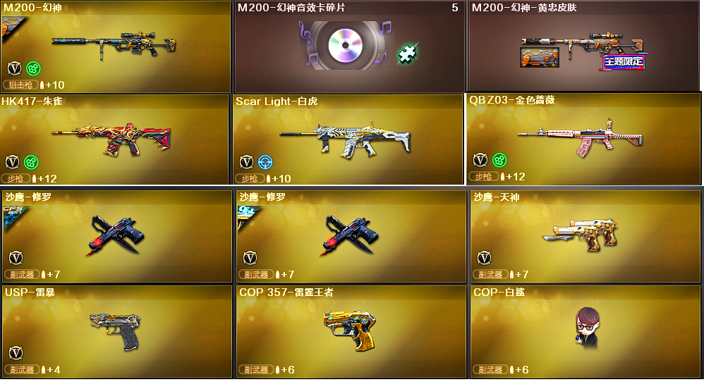 南部【湖南二区】【83v】【6盘龙+8烈龙】【幻神1皮】【M200-幻神+黄忠皮肤+Kar98K-星神+AWM-裁决+裁决-流光秘银+Scar Light-白虎+QBZ03-金色蔷薇】【USP-雷暴+COP 357-雷霆王者】【加特林-炼狱】【斯泰尔-蝴蝶】【死亡之眼】【葵】【奇洋探员】【王者-零-国色天香】【王者之瞳】【樱】【M4A1-雷神+荣耀之魄+白鲨皮肤+传奇N9+虎将+能量核心+耀金皮肤+星空+音效卡】【AK47-火麒麟+冠军之心+华夏之心+CFSTAR+雷神】【M4A1-黑骑士】【黑骑士-暗月】【M4A1-黑骑士音效卡】【M4A1-黑龙】【黑龙-墨子皮肤】【M4A1-黑龙-361】【Barrett-毁灭】【毁灭-冠军之怒】【巴雷特-毁灭-CFPL冠军】【Barrett-毁灭音效卡】【AK47-雷暴】【HK417-朱雀】【斯泰尔-蝴蝶】【死亡之眼】【幻灵套装X1套】【雷暴套装X5套】;USP-雷暴,RPK-盘龙,QBZ03-金色蔷薇,M200-幻神,Scar Light-白虎,Kar98K-星神,