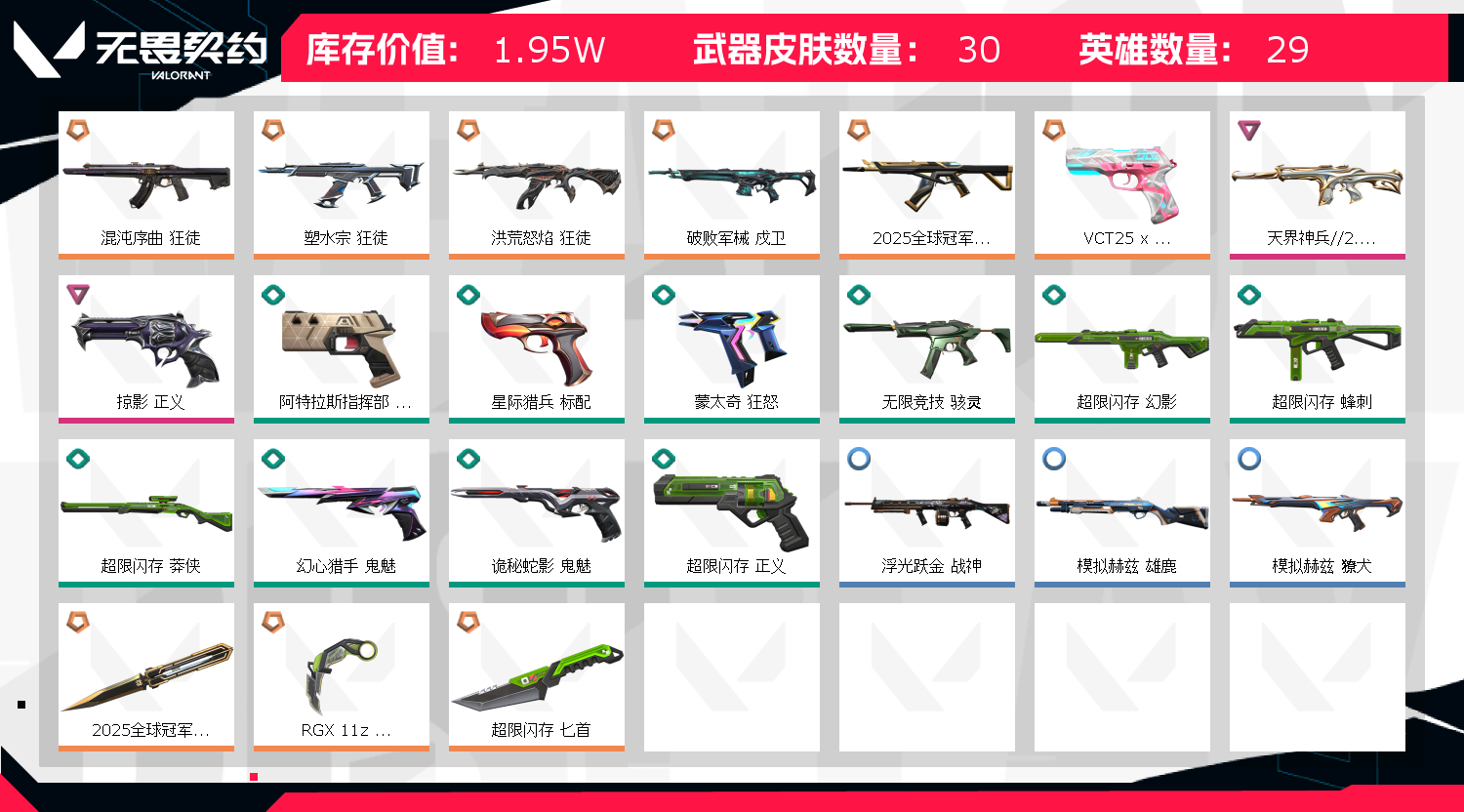 首页 > 租号大厅 > 无畏契约-wegame > wegame/wegame > 25冠军套装✨显卡爪刀✨塑水宗 混沌序曲 洪荒怒焰狂徒✨掠影正义 VCT25 x BLG 标配
