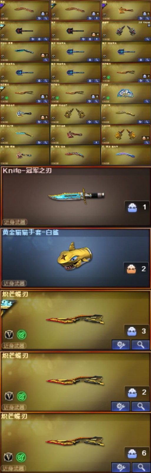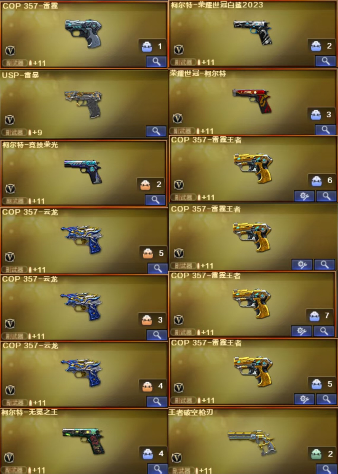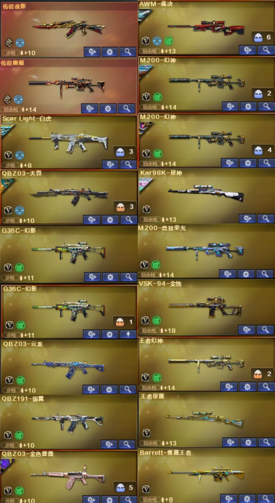 【王者武器】:【炫金无影-1,高爆手雷-雷霆王者-7,Barrett-雷霆王者-觉醒版-1,COP 357-雷霆王者-觉醒版-4,QBZ-03-王者蔷薇-觉醒版-1,烟雾弹-雷霆王者-觉醒版-1,王者之势-觉醒版-1,王者之心-觉醒版-1,王者之锋-觉醒版-1,王者星霆-1,王者之魄-觉醒版-1,王者幻神-觉醒版-1,王者破空枪刃-1,闪光弹-雷霆王者-觉醒版-4,雷霆王者之锋-觉醒版-1,王者岩刺-1,王者星光-1,炫金千变-1】 【英雄武器】:【M4A1-死神-1,AK12-天启-1,AN94-超新星-2,M4A1-黑骑士-2,屠龙-2,龙啸-1,AK47-火麒麟-1,Barrett-毁灭-1,汤姆逊-烈龙-6,Barrett-极光-1,RPK-盘龙-5,沙鹰-修罗-1,加特林-炼狱-1,沙鹰-天神-1,M4A1-雷神-2,M200-幻神-2,USP-雷暴-1,烟雾弹-雷霆-5,闪光弹-雷霆-6,M200-竞技荣光-1,传说夜影-1,擎天-竞技荣光-4,机械迷城-穹宇-1,柯尔特-竞技荣光-1,烟雾弹-竞技荣光-3,白虎-电玩蓝兔-1,闪光弹-竞技荣光-2,高爆手雷-竞技荣光-2,Scar Light-白虎-1,炽芒蝶刃-3,高爆手雷-雷霆-5,AK-47-猩红传说-1,AA-12-雷霆-1,QBZ03-金色蔷薇-1,Barrett-碧霄极光-1,烟雾弹-玄豹-1,传说幽瞳-1,G36C-幻影-2,QBZ03-天罚-1,柯尔特-荣耀世冠白鲨2023-1,柯尔特-无冕之王-1,QBZ03-云龙-1,超新星-热带奇洋-1,Kar98K-星神-1,龙啸-热带奇洋-1,云龙扇-1,COP 357-云龙-3,高爆手雷-云龙-2,烟雾弹-云龙-1,闪光弹-云龙-1,擎天-2,AWM-裁决-1,荣耀世冠-柯尔特-1,荣耀世冠-火麒麟-1,荣耀世冠-雷神-1,雷霆之契-1,雷霆之锋-1,龙啸-烈火龙威-1,M4A1-猎神-1】 【装饰品】:【天龙-秘银-1,毁灭-暗月-1,悦动玩偶-1,王者刀锋玩偶-1,幻神-荣耀世冠白鲨2023 皮肤-1,毁灭-虹光风暴 皮肤-1,雷神-R.LGD-CFPLS18冠军-1,雷神-宠儿-2019MVP-1,AK47-火麒麟-传奇EVEN-1,火麒麟-战神关羽-1,传奇石头-横秒之巅-1,火麒麟-平天大圣-1,曼陀罗玩偶-1,火麒麟-巅峰荣耀-1,黑骑士-伏羲-1,毁灭-星空-1,黑骑士-冠军之势-1,雷神-耀金皮肤-1,QBZ03-AG-CFPLS19冠军-1,屠龙-星耀 皮肤-1,幻神-星耀 皮肤-1,毁灭-星耀 皮肤-1,AK47-B-常胜将军-孙权-1,屠龙-荣耀之锋-1,雷神-荣耀之魄-1,毁灭-荣耀之怒-1,幻神-星火小队签名臻藏版 皮肤-1,金色蔷薇-Heartshot皮肤-1,M200-幻神-N9-2022MVP-1,幻神-CFS2022-1,幻神-巅峰荣耀-1,幻神-宠儿-2021MVP-1,星神-枪娘默 皮肤-1,炼狱-星空-1,屠龙-星火燎原-1,擎天-冠军之击-1,麒麟刺-荣耀世冠白鲨-1,裁决-流光秘银-1,M4A1-雷神-拼搏-1,白虎-白鲨-CFPLS23冠军-1,幻神-曹操 皮肤-1,金色蔷薇-破浪逐光 皮肤-1,M4A1-雷神-巅峰荣耀皮肤-1,天罚-孙权 皮肤-1,毁灭-CFS2020-1,毁灭-秦师 皮肤-1,金色蔷薇-量子蔷薇 皮肤-1,雷神-维纳斯皮肤-1,炽芒蝶刃-冠军炽芒皮肤-1,裁决-叶芒苍灵 皮肤-1,雷神-斗鱼平台皮肤-1,幻神-AG-CFPL S24冠军 皮肤-1,魅影玩偶-1,裁决-巅峰荣耀 皮肤-1,超新星-兔兔战士 皮肤-1,毁灭-SV-CFPLS16冠军-1,雷神-传奇N9-1,雷神-源计划2.0专属 皮肤-1,炼狱-末日审判 皮肤-1,龙啸-巅峰荣耀 皮肤-1,蝴蝶玩偶-1,擎天-傲竹金蛇 皮肤-1,屠龙-巅峰荣耀 皮肤-1,星神-傲竹金蛇 皮肤-1,M200-幻神-黄忠皮肤-1】 【角色】:【堕天使,幻影,铁骑,猎狐者,刀锋,灵狐者,嘉年华灵狐,潘多拉-锋芒精英,游珑儿,毒蝎-X,雪莉杨-摸金校尉,炫,威锋,关小雨,兰-海滩派对,灵狐者-黄金海岸,鹰,电竞教官-云悠悠,雨棠,王者沙漠玫瑰,夜玫瑰-X,救世主-X,风暴女,精英部队,狐妖儿,秦师,雨墨,白狼-X,代号:翼,娟娟,斯沃特-锋芒精英,兰-限定版,新斯沃特-英特尔,炽天使,王者樱-热浪之夏,兔囡囡,暗夜-X,王者炫,灵狐-花神,传说影煞,华】 【道具】:【超级背包-1,烟雾保护头盔-1,猫耳头盔-1,闪光护目镜-1,防弹衣-1,防弹头盔-1,手雷包-1,C4工具钳-1,防化服-1,夺命之镰-1,变异宝贝-1,灵魂忍者-1,疯狂宝贝-1,迷雾幽灵-1,生化弹匣-1,步枪弹匣-1,机枪弹匣-1,冲锋枪弹匣-1,手枪弹匣-1,彩蝶之翼-1,幽灵面具-1,Barrett-毁灭音效卡-1,M4A1-雷神音效卡-1,炫彩背包-诺拉-1,M4A1-黑骑士音效卡-1,Barrett-极光音效卡-1,M200-幻神音效卡-1,云山科技背包-1,听风战术耳机-1,智眸战术目镜-1,弦波科技无线电-1,泉枢动力水壶-1,元界战术腿袋-1,小萝莉-1,Scar Light-白虎音效卡-1,枪口火焰变形-1,变相怪杰-1,天使之翼-1,绿色巨人-1,天使光环-1,南瓜头盔-1,兔子发带-1,京剧背包-1,Kar98K-星神音效卡-1,AWM-裁决音效卡-1,大圣背包-1,大圣头盔-1,老虎背包-1,全能枪王黄金面具-1,忧郁雪人帽-1】;USP-雷暴,柯尔特-无冕之王,荣耀世冠-柯尔特,柯尔特-荣耀世冠白鲨2023,炽芒蝶刃,Knife-冠军之刃,传说影煞,
